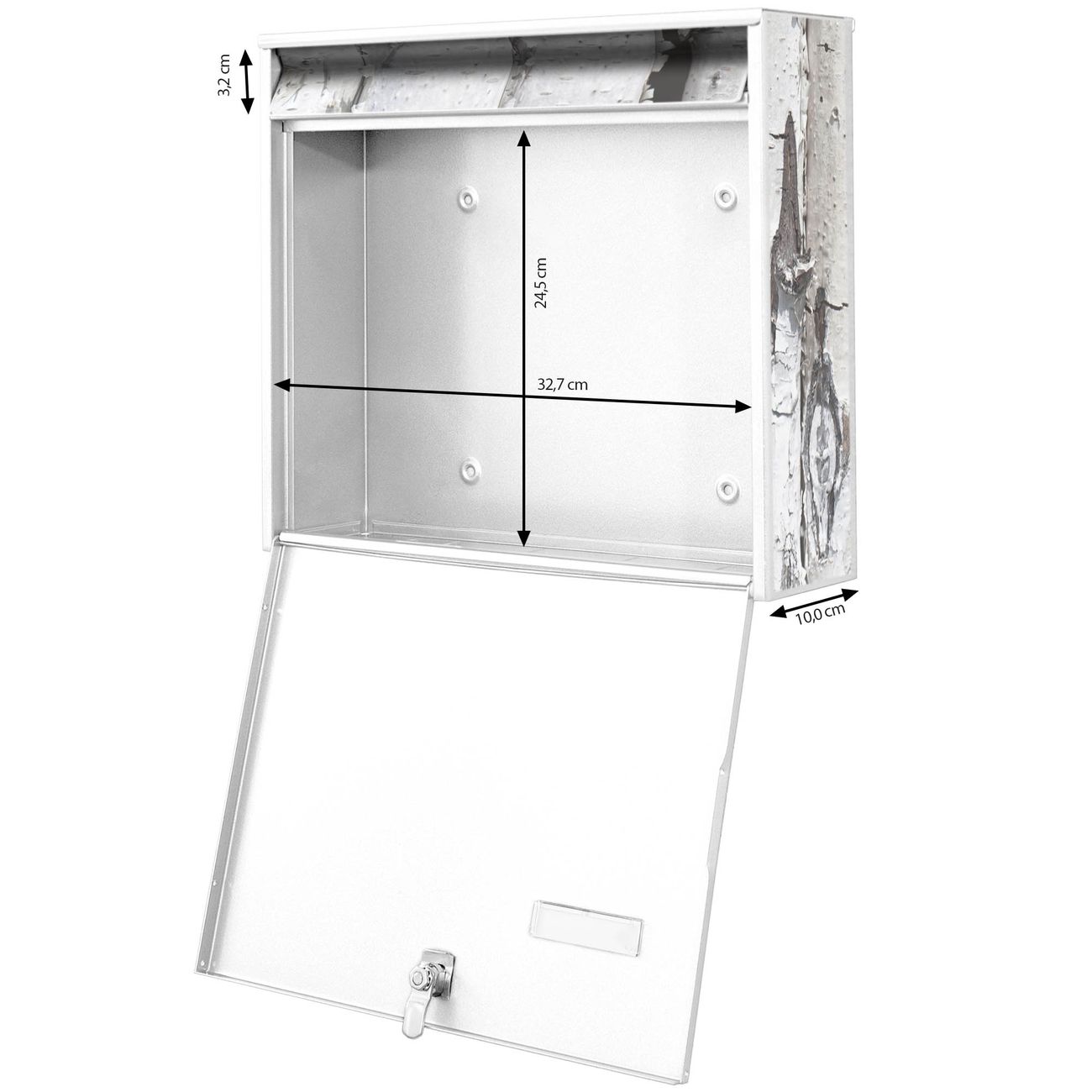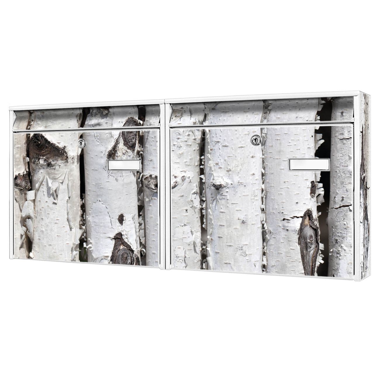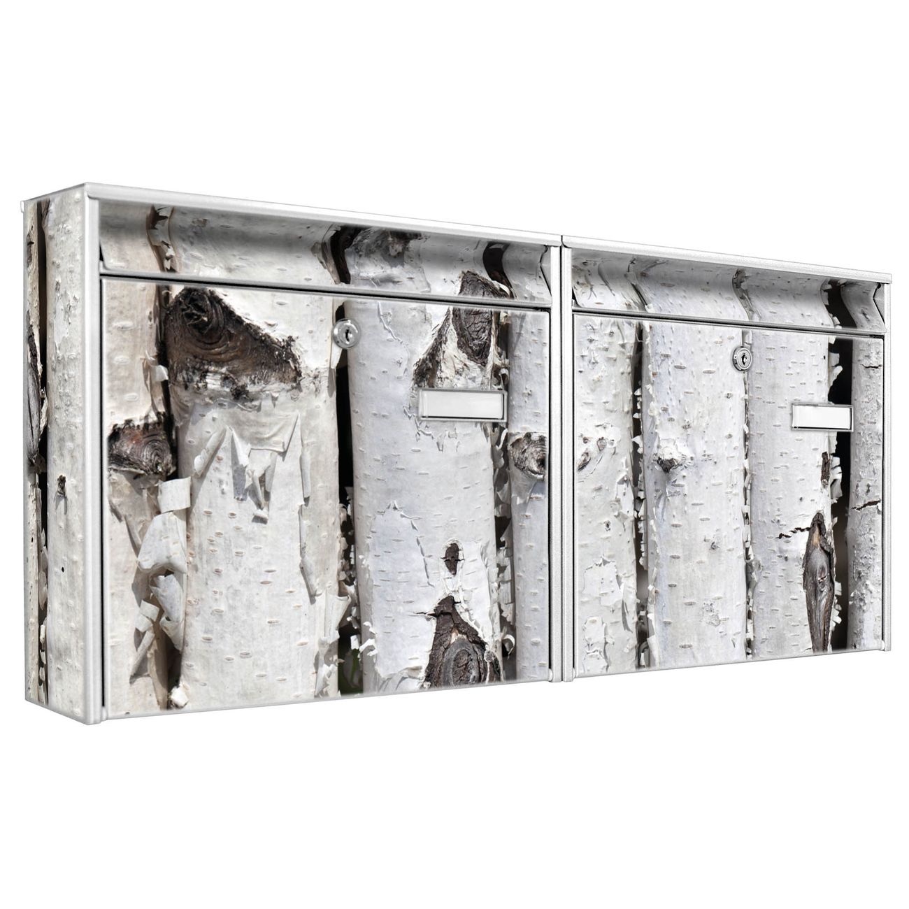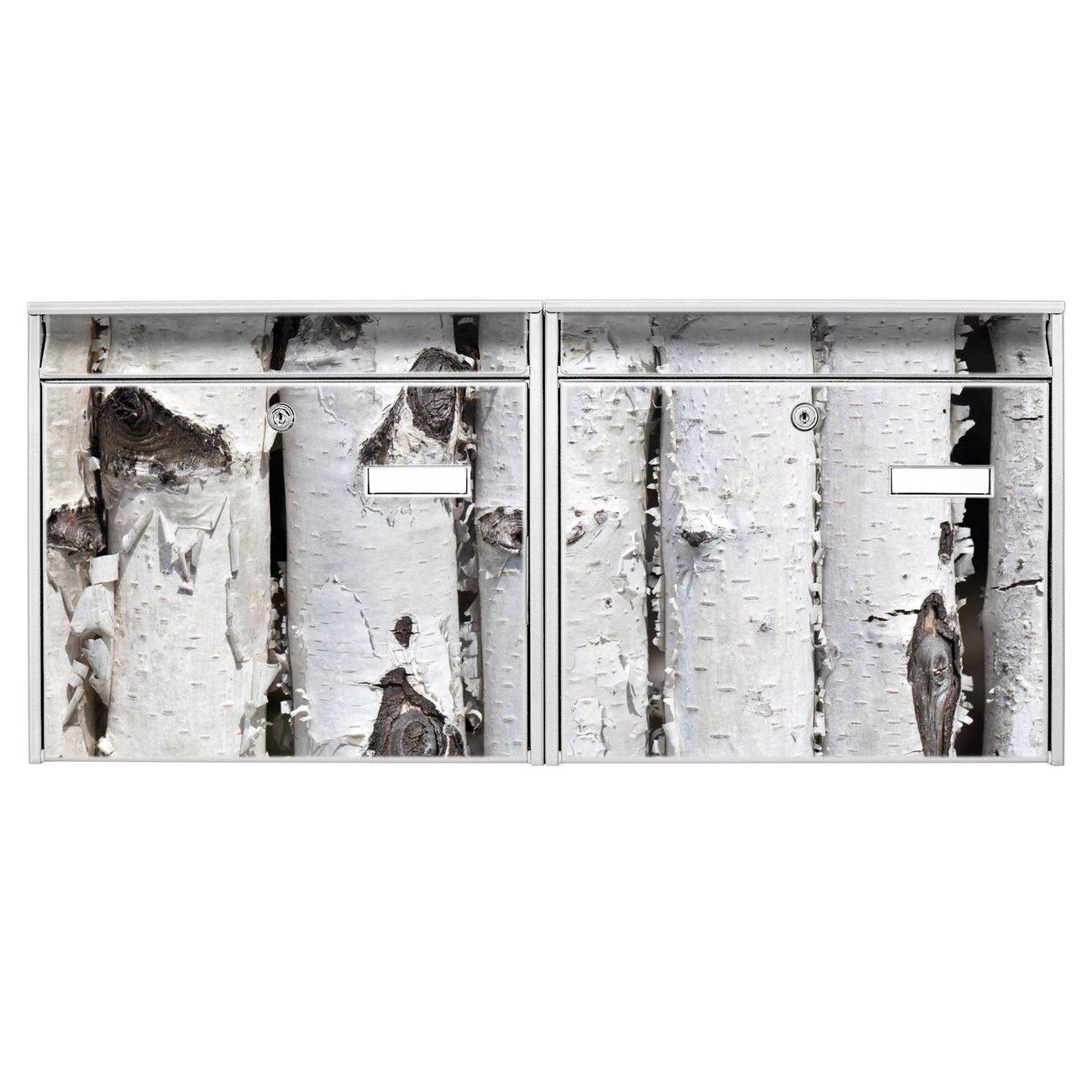FUNKTION: Die Burg Wächter doppel Briefkastenanlage mit Motiv Birkenrinde bietet Ihnen ein großes Fassungsvermögen, sodass auch A4 Sendungen eingeworfen werden können. Das Namensschild lässt sich individuell beschriften. DESIGN: Die 2 Briefkästen mit Birkenrinde Motiv haben ein sehr ansprechendes und zeitloses Design. Heben Sie Sich von der tristen grauen Masse ab, ohne auf Funktionalität zu verzichten. Sie erhalten 2 Schlüssel sowie das Montagematerial. DETAILS: Der Doppelbriefkasten besteht aus verzinktem Stahl weiß. Er ist 72,5cm x 32,2cm x 10cm groß. Das Motiv besteht aus einer wetter- und UV-festen Folie, die Ihren Briefkasten zusätzlich vor Kratzern schützt. NUTZEN: Die stabile Bauart sowie die Wetterfestigkeit machen diese doppel Briefkästen zu einem zuverlässigen Begleiter im Alltag. Effektvoll in Reihe gehangen schmückt die Anlage jede Hauswand. BANJADO: Ihr Briefkasten wird in Sachsen in einer kleinen Manufaktur von Hand veredelt. Die Motivfolie ist lösungsmittelfrei und schutzlaminiert für einen langen Halt. Wir legen großen Wert auf die Verbindung von Funktionalität und Design. Sie erhalten Handarbeit aus Sachsen.