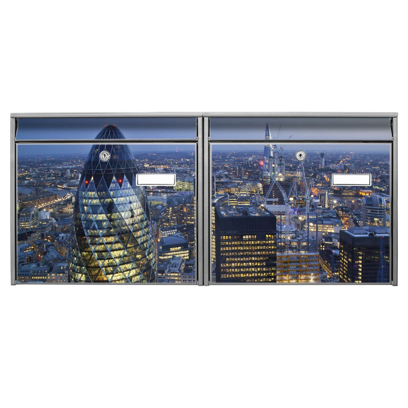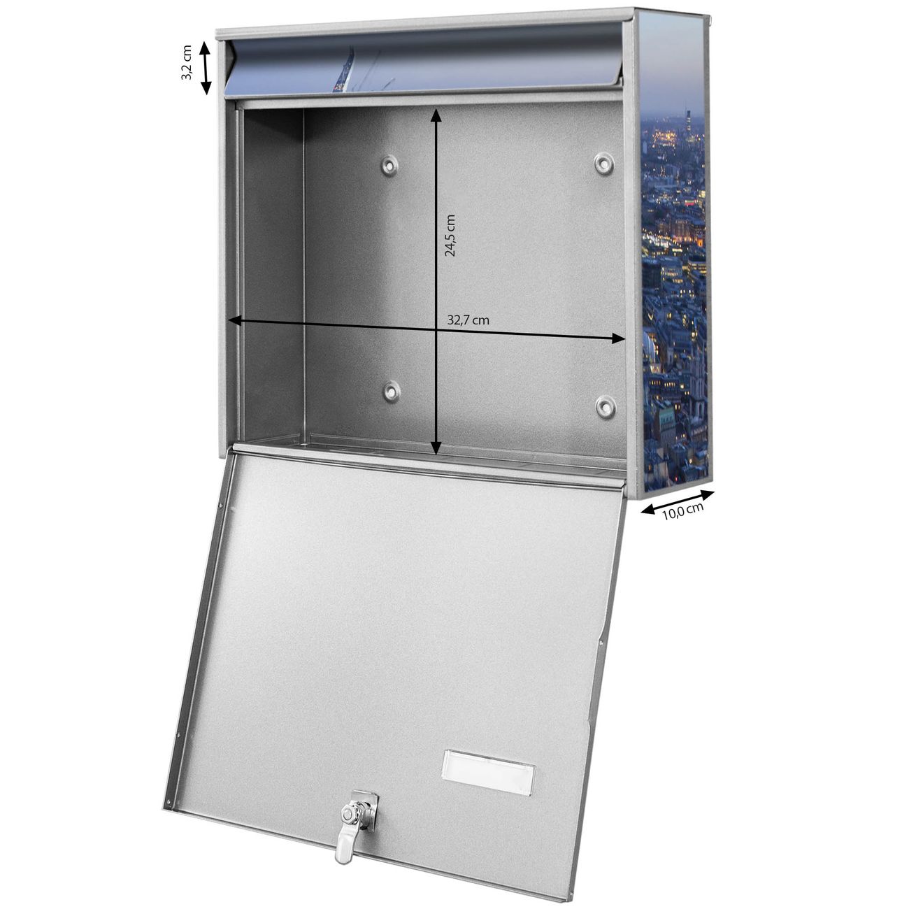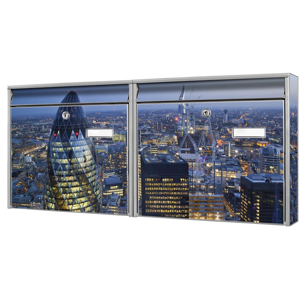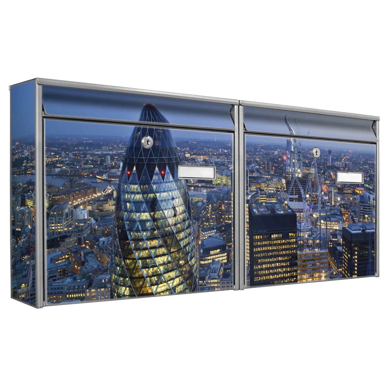 FUNKTION: Die Burg Wächter doppel Briefkastenanlage mit Motiv City Of London bietet Ihnen ein großes Fassungsvermögen, sodass auch A4 Sendungen eingeworfen werden können. Das Namensschild lässt sich individuell beschriften. DESIGN: Die 2 Briefkästen mit City Of London Motiv haben ein sehr ansprechendes und zeitloses Design. Heben Sie Sich von der tristen grauen Masse ab, ohne auf Funktionalität zu verzichten. Sie erhalten 2 Schlüssel sowie das Montagematerial. DETAILS: Der Doppelbriefkasten besteht aus verzinktem Stahl weiß. Er ist 72,5cm x 32,2cm x 10cm groß. Das Motiv besteht aus einer wetter- und UV-festen Folie, die Ihren Briefkasten zusätzlich vor Kratzern schützt. NUTZEN: Die stabile Bauart sowie die Wetterfestigkeit machen diese doppel Briefkästen zu einem zuverlässigen Begleiter im Alltag. Effektvoll in Reihe gehangen schmückt die Anlage jede Hauswand. BANJADO: Ihr Briefkasten wird in Sachsen in einer kleinen Manufaktur von Hand veredelt. Die Motivfolie ist lösungsmittelfrei und schutzlaminiert für einen langen Halt. Wir legen großen Wert auf die Verbindung von Funktionalität und Design. Sie erhalten Handarbeit aus Sachsen.