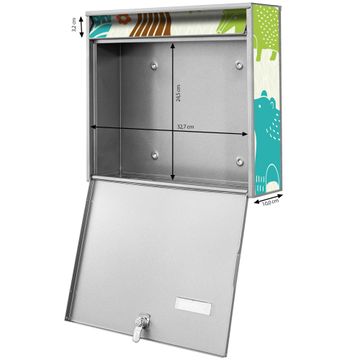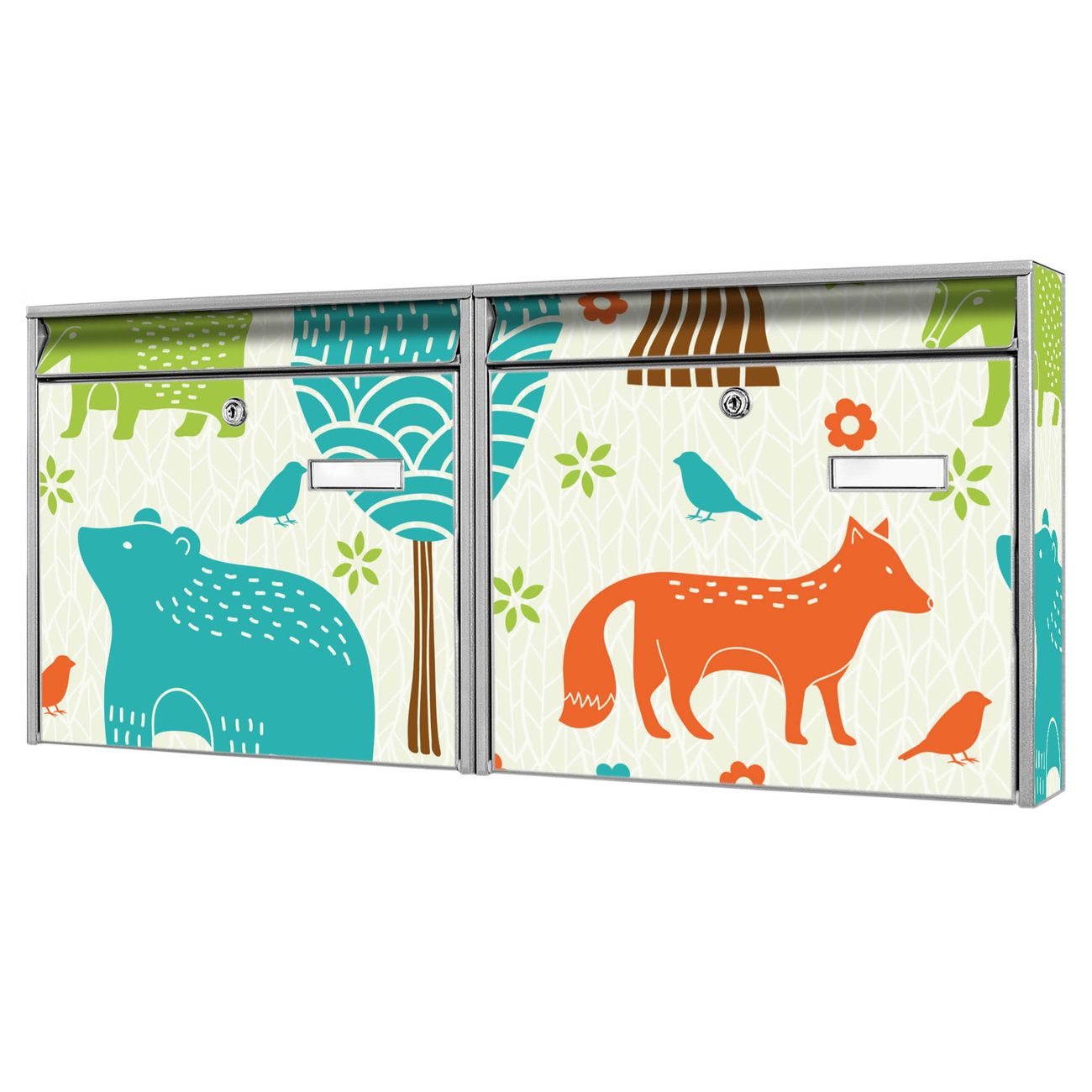 FUNKTION: Die Burg Wächter doppel Briefkastenanlage mit Motiv Fuchs Bär Wald bietet Ihnen ein großes Fassungsvermögen, sodass auch A4 Sendungen eingeworfen werden können. Das Namensschild lässt sich individuell beschriften. DESIGN: Die 2 Briefkästen mit Fuchs Bär Wald Motiv haben ein sehr ansprechendes und zeitloses Design. Heben Sie Sich von der tristen grauen Masse ab, ohne auf Funktionalität zu verzichten. Sie erhalten 2 Schlüssel sowie das Montagematerial. DETAILS: Der Doppelbriefkasten besteht aus verzinktem Stahl weiß. Er ist 72,5cm x 32,2cm x 10cm groß. Das Motiv besteht aus einer wetter- und UV-festen Folie, die Ihren Briefkasten zusätzlich vor Kratzern schützt. NUTZEN: Die stabile Bauart sowie die Wetterfestigkeit machen diese doppel Briefkästen zu einem zuverlässigen Begleiter im Alltag. Effektvoll in Reihe gehangen schmückt die Anlage jede Hauswand. BANJADO: Ihr Briefkasten wird in Sachsen in einer kleinen Manufaktur von Hand veredelt. Die Motivfolie ist lösungsmittelfrei und schutzlaminiert für einen langen Halt. Wir legen großen Wert auf die Verbindung von Funktionalität und Design. Sie erhalten Handarbeit aus Sachsen.