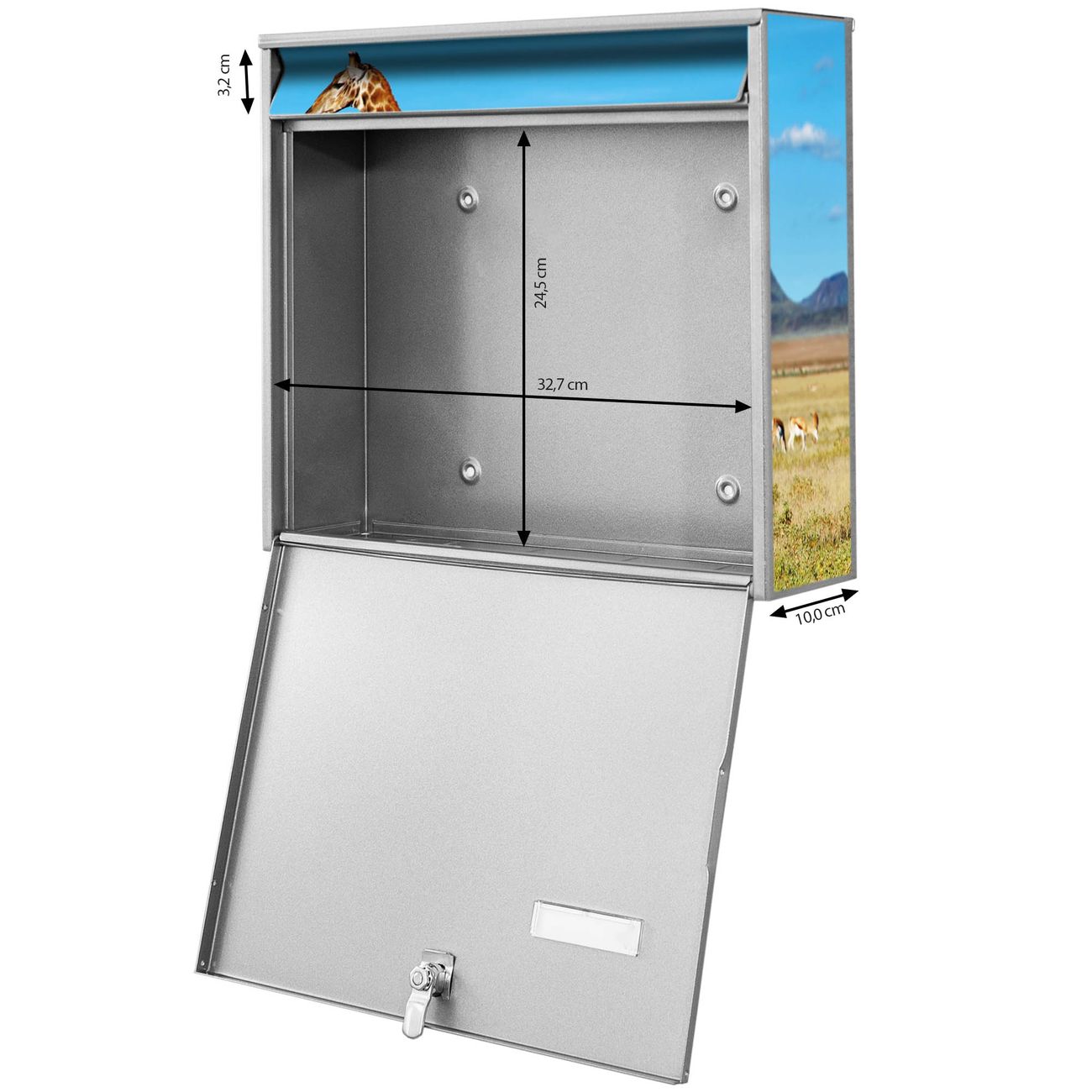 FUNKTION: Die Burg Wächter doppel Briefkastenanlage mit Motiv Giraffe bietet Ihnen ein großes Fassungsvermögen, sodass auch A4 Sendungen eingeworfen werden können. Das Namensschild lässt sich individuell beschriften. DESIGN: Die 2 Briefkästen mit Giraffe Motiv haben ein sehr ansprechendes und zeitloses Design. Heben Sie Sich von der tristen grauen Masse ab, ohne auf Funktionalität zu verzichten. Sie erhalten 2 Schlüssel sowie das Montagematerial. DETAILS: Der Doppelbriefkasten besteht aus verzinktem Stahl weiß. Er ist 72,5cm x 32,2cm x 10cm groß. Das Motiv besteht aus einer wetter- und UV-festen Folie, die Ihren Briefkasten zusätzlich vor Kratzern schützt. NUTZEN: Die stabile Bauart sowie die Wetterfestigkeit machen diese doppel Briefkästen zu einem zuverlässigen Begleiter im Alltag. Effektvoll in Reihe gehangen schmückt die Anlage jede Hauswand. BANJADO: Ihr Briefkasten wird in Sachsen in einer kleinen Manufaktur von Hand veredelt. Die Motivfolie ist lösungsmittelfrei und schutzlaminiert für einen langen Halt. Wir legen großen Wert auf die Verbindung von Funktionalität und Design. Sie erhalten Handarbeit aus Sachsen.