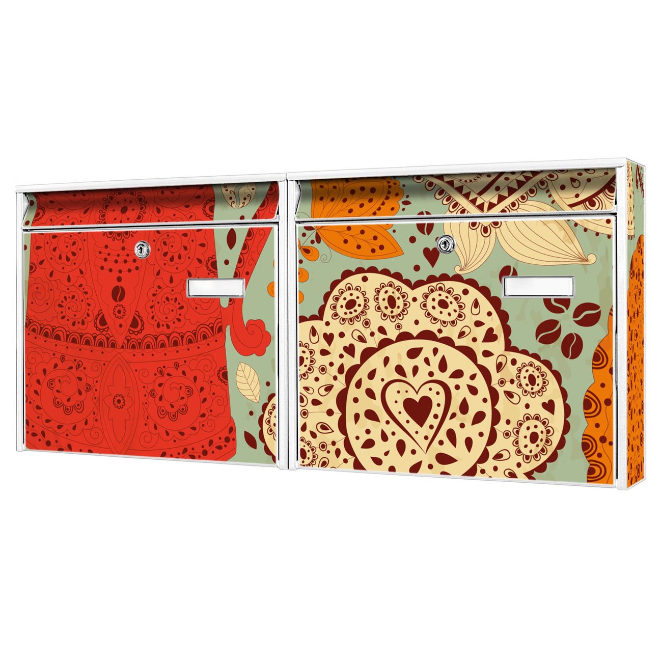 FUNKTION: Die Burg Wächter doppel Briefkastenanlage mit Motiv Indischer Kaffee bietet Ihnen ein großes Fassungsvermögen, sodass auch A4 Sendungen eingeworfen werden können. Das Namensschild lässt sich individuell beschriften. DESIGN: Die 2 Briefkästen mit Indischer Kaffee Motiv haben ein sehr ansprechendes und zeitloses Design. Heben Sie Sich von der tristen grauen Masse ab, ohne auf Funktionalität zu verzichten. Sie erhalten 2 Schlüssel sowie das Montagematerial. DETAILS: Der Doppelbriefkasten besteht aus verzinktem Stahl weiß. Er ist 72,5cm x 32,2cm x 10cm groß. Das Motiv besteht aus einer wetter- und UV-festen Folie, die Ihren Briefkasten zusätzlich vor Kratzern schützt. NUTZEN: Die stabile Bauart sowie die Wetterfestigkeit machen diese doppel Briefkästen zu einem zuverlässigen Begleiter im Alltag. Effektvoll in Reihe gehangen schmückt die Anlage jede Hauswand. BANJADO: Ihr Briefkasten wird in Sachsen in einer kleinen Manufaktur von Hand veredelt. Die Motivfolie ist lösungsmittelfrei und schutzlaminiert für einen langen Halt. Wir legen großen Wert auf die Verbindung von Funktionalität und Design. Sie erhalten Handarbeit aus Sachsen.