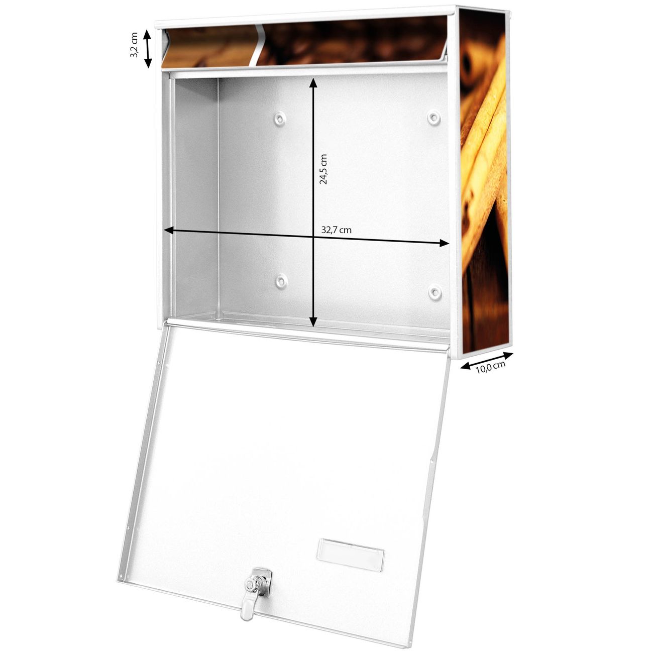 FUNKTION: Die Burg Wächter doppel Briefkastenanlage mit Motiv Kaffee&Schokolade bietet Ihnen ein großes Fassungsvermögen, sodass auch A4 Sendungen eingeworfen werden können. Das Namensschild lässt sich individuell beschriften. DESIGN: Die 2 Briefkästen mit Kaffee&Schokolade Motiv haben ein sehr ansprechendes und zeitloses Design. Heben Sie Sich von der tristen grauen Masse ab, ohne auf Funktionalität zu verzichten. Sie erhalten 2 Schlüssel sowie das Montagematerial. DETAILS: Der Doppelbriefkasten besteht aus verzinktem Stahl weiß. Er ist 72,5cm x 32,2cm x 10cm groß. Das Motiv besteht aus einer wetter- und UV-festen Folie, die Ihren Briefkasten zusätzlich vor Kratzern schützt. NUTZEN: Die stabile Bauart sowie die Wetterfestigkeit machen diese doppel Briefkästen zu einem zuverlässigen Begleiter im Alltag. Effektvoll in Reihe gehangen schmückt die Anlage jede Hauswand. BANJADO: Ihr Briefkasten wird in Sachsen in einer kleinen Manufaktur von Hand veredelt. Die Motivfolie ist lösungsmittelfrei und schutzlaminiert für einen langen Halt. Wir legen großen Wert auf die Verbindung von Funktionalität und Design. Sie erhalten Handarbeit aus Sachsen.