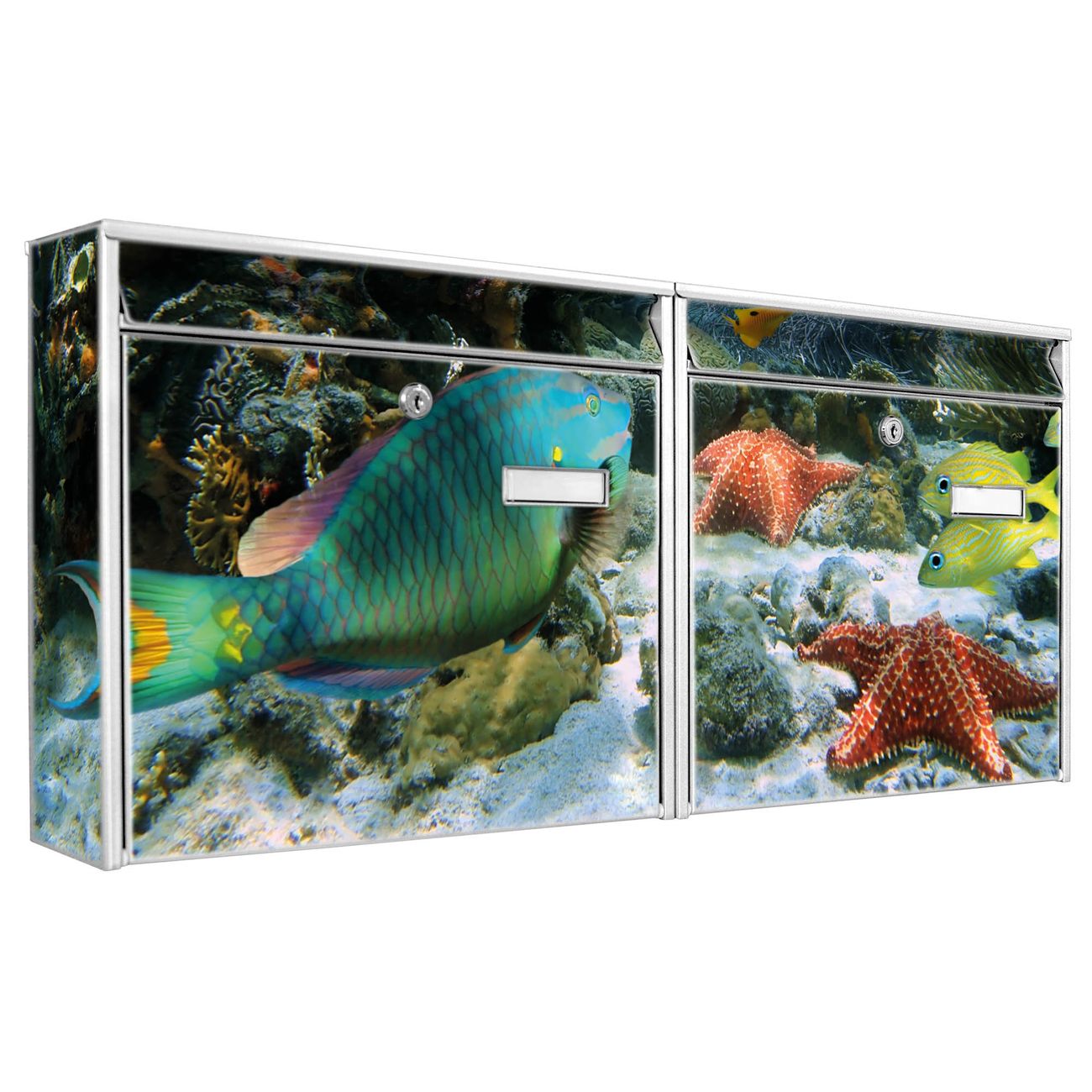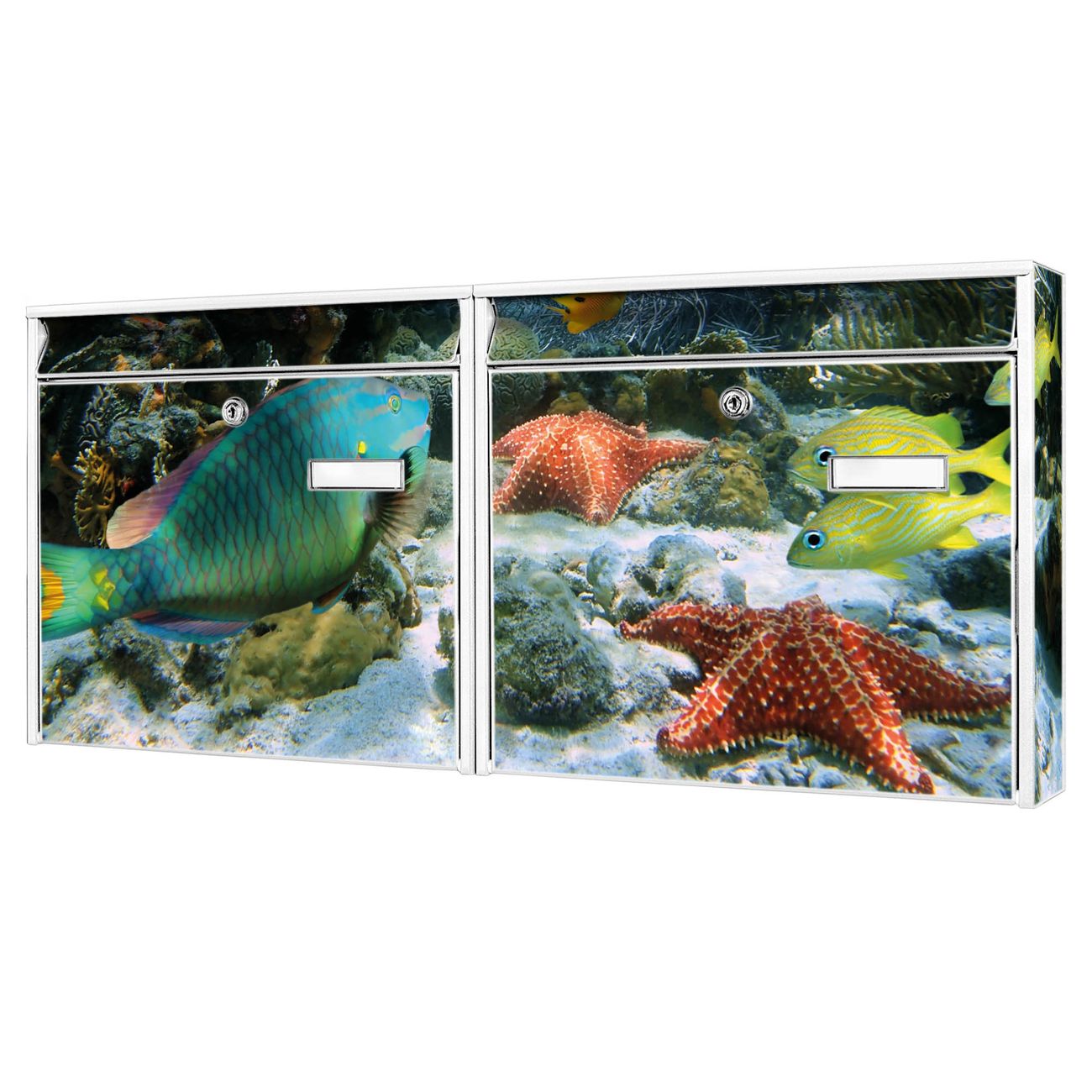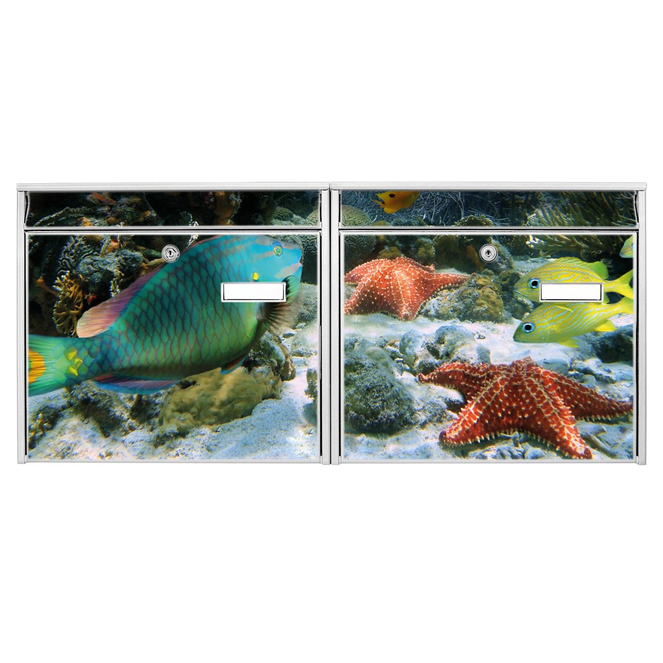 FUNKTION: Die Burg Wächter doppel Briefkastenanlage mit Motiv Korallenriff 1 bietet Ihnen ein großes Fassungsvermögen, sodass auch A4 Sendungen eingeworfen werden können. Das Namensschild lässt sich individuell beschriften. DESIGN: Die 2 Briefkästen mit Korallenriff 1 Motiv haben ein sehr ansprechendes und zeitloses Design. Heben Sie Sich von der tristen grauen Masse ab, ohne auf Funktionalität zu verzichten. Sie erhalten 2 Schlüssel sowie das Montagematerial. DETAILS: Der Doppelbriefkasten besteht aus verzinktem Stahl weiß. Er ist 72,5cm x 32,2cm x 10cm groß. Das Motiv besteht aus einer wetter- und UV-festen Folie, die Ihren Briefkasten zusätzlich vor Kratzern schützt. NUTZEN: Die stabile Bauart sowie die Wetterfestigkeit machen diese doppel Briefkästen zu einem zuverlässigen Begleiter im Alltag. Effektvoll in Reihe gehangen schmückt die Anlage jede Hauswand. BANJADO: Ihr Briefkasten wird in Sachsen in einer kleinen Manufaktur von Hand veredelt. Die Motivfolie ist lösungsmittelfrei und schutzlaminiert für einen langen Halt. Wir legen großen Wert auf die Verbindung von Funktionalität und Design. Sie erhalten Handarbeit aus Sachsen.