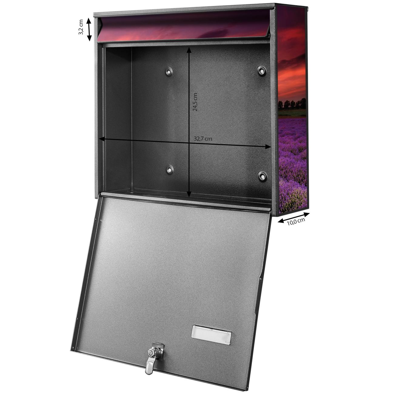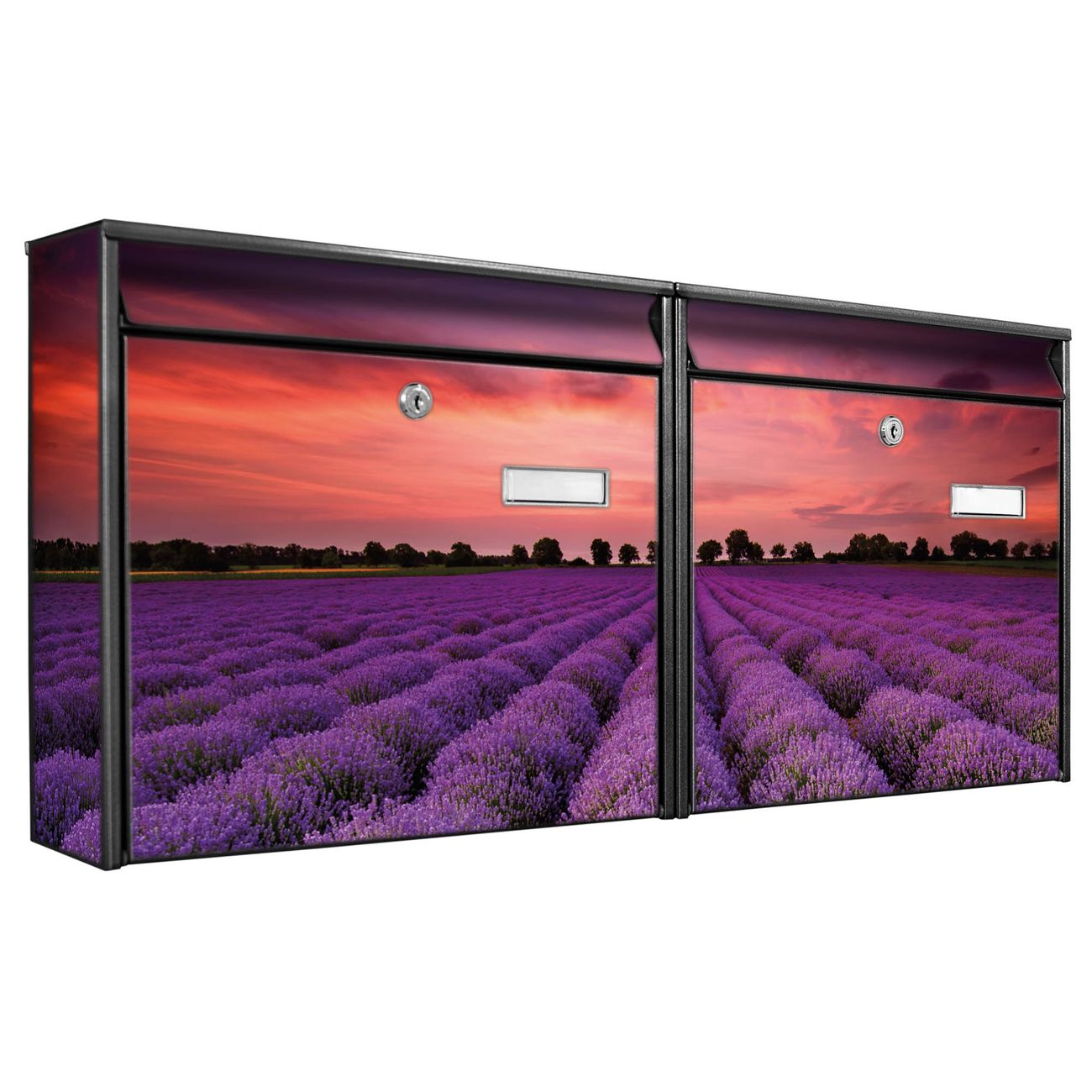 FUNKTION: Die Burg Wächter doppel Briefkastenanlage mit Motiv Lavendelfeld bietet Ihnen ein großes Fassungsvermögen, sodass auch A4 Sendungen eingeworfen werden können. Das Namensschild lässt sich individuell beschriften. DESIGN: Die 2 Briefkästen mit Lavendelfeld Motiv haben ein sehr ansprechendes und zeitloses Design. Heben Sie Sich von der tristen grauen Masse ab, ohne auf Funktionalität zu verzichten. Sie erhalten 2 Schlüssel sowie das Montagematerial. DETAILS: Der Doppelbriefkasten besteht aus verzinktem Stahl weiß. Er ist 72,5cm x 32,2cm x 10cm groß. Das Motiv besteht aus einer wetter- und UV-festen Folie, die Ihren Briefkasten zusätzlich vor Kratzern schützt. NUTZEN: Die stabile Bauart sowie die Wetterfestigkeit machen diese doppel Briefkästen zu einem zuverlässigen Begleiter im Alltag. Effektvoll in Reihe gehangen schmückt die Anlage jede Hauswand. BANJADO: Ihr Briefkasten wird in Sachsen in einer kleinen Manufaktur von Hand veredelt. Die Motivfolie ist lösungsmittelfrei und schutzlaminiert für einen langen Halt. Wir legen großen Wert auf die Verbindung von Funktionalität und Design. Sie erhalten Handarbeit aus Sachsen.