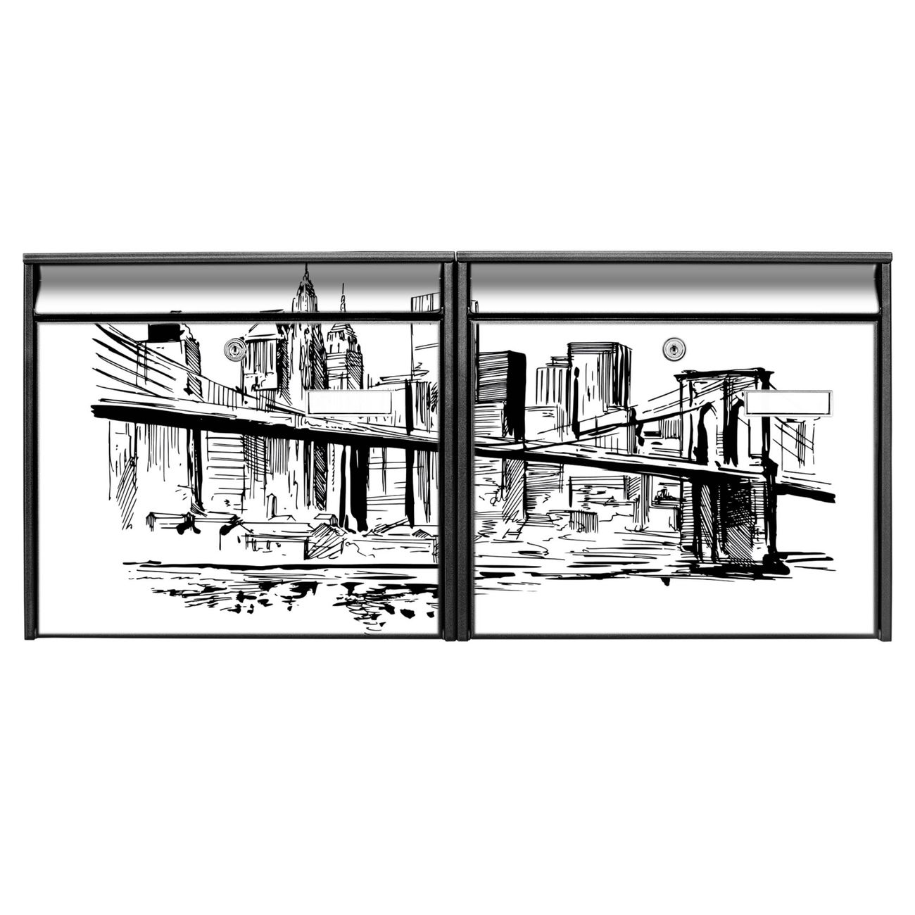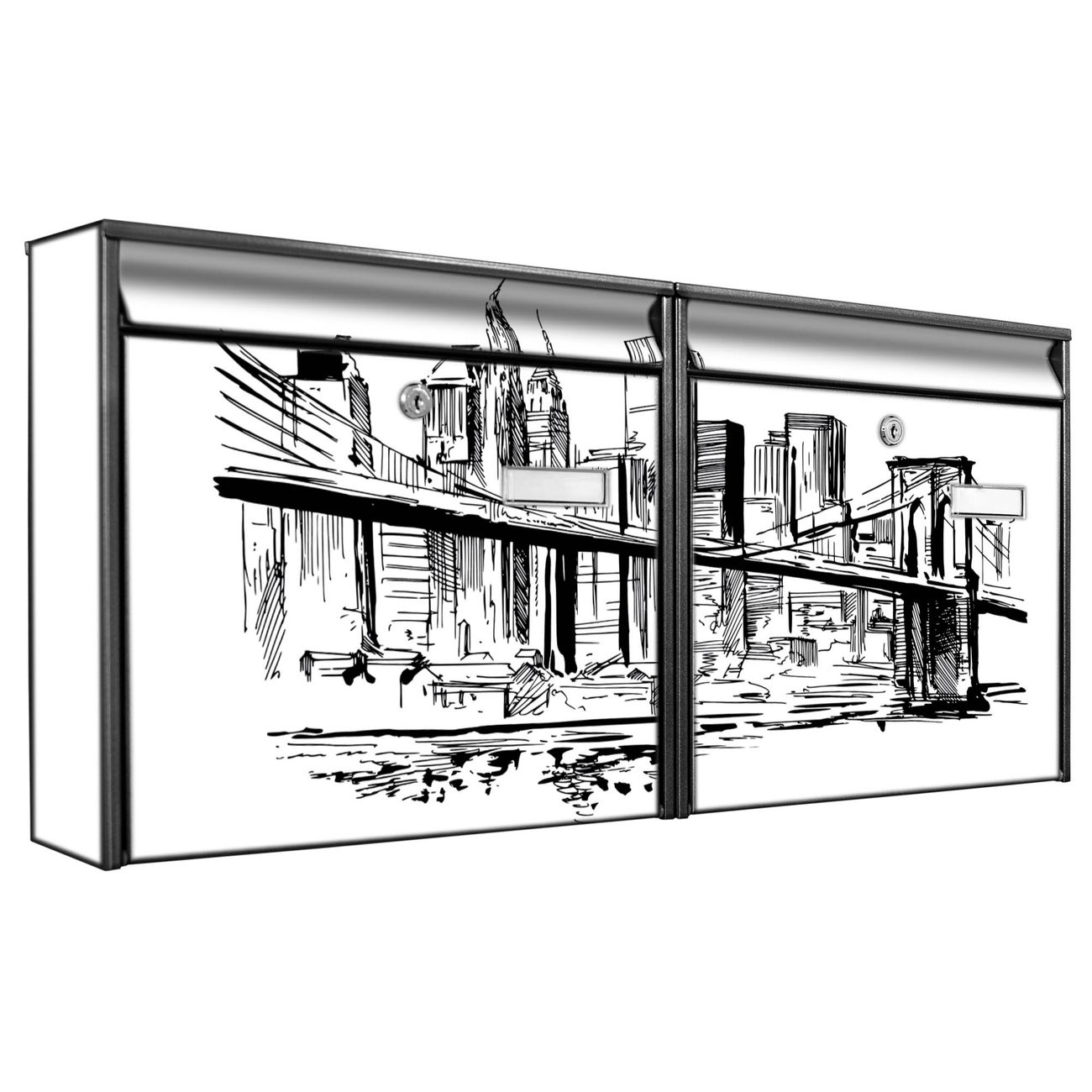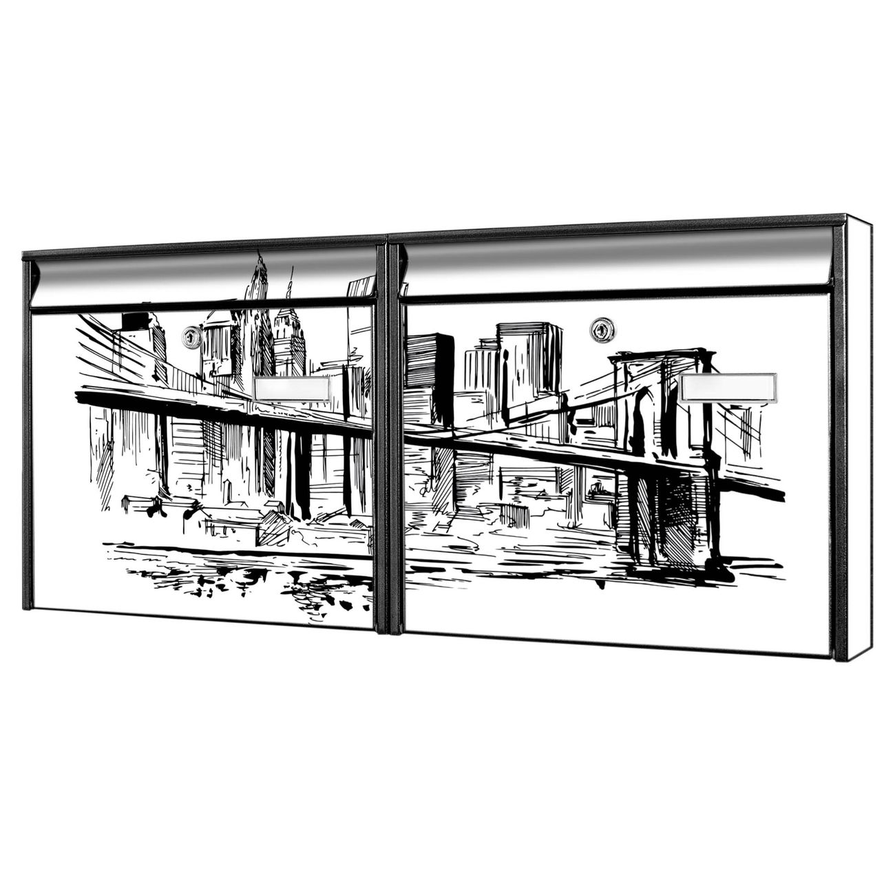 FUNKTION: Die Burg Wächter doppel Briefkastenanlage mit Motiv New York Skizze bietet Ihnen ein großes Fassungsvermögen, sodass auch A4 Sendungen eingeworfen werden können. Das Namensschild lässt sich individuell beschriften. DESIGN: Die 2 Briefkästen mit New York Skizze Motiv haben ein sehr ansprechendes und zeitloses Design. Heben Sie Sich von der tristen grauen Masse ab, ohne auf Funktionalität zu verzichten. Sie erhalten 2 Schlüssel sowie das Montagematerial. DETAILS: Der Doppelbriefkasten besteht aus verzinktem Stahl weiß. Er ist 72,5cm x 32,2cm x 10cm groß. Das Motiv besteht aus einer wetter- und UV-festen Folie, die Ihren Briefkasten zusätzlich vor Kratzern schützt. NUTZEN: Die stabile Bauart sowie die Wetterfestigkeit machen diese doppel Briefkästen zu einem zuverlässigen Begleiter im Alltag. Effektvoll in Reihe gehangen schmückt die Anlage jede Hauswand. BANJADO: Ihr Briefkasten wird in Sachsen in einer kleinen Manufaktur von Hand veredelt. Die Motivfolie ist lösungsmittelfrei und schutzlaminiert für einen langen Halt. Wir legen großen Wert auf die Verbindung von Funktionalität und Design. Sie erhalten Handarbeit aus Sachsen.