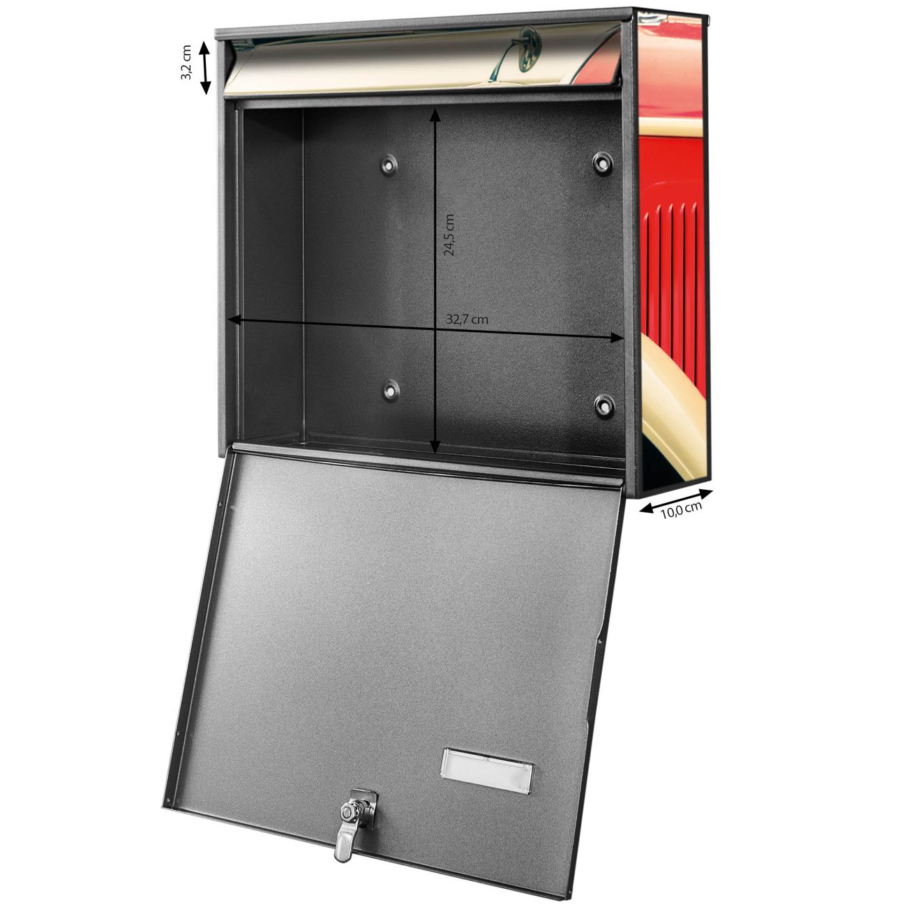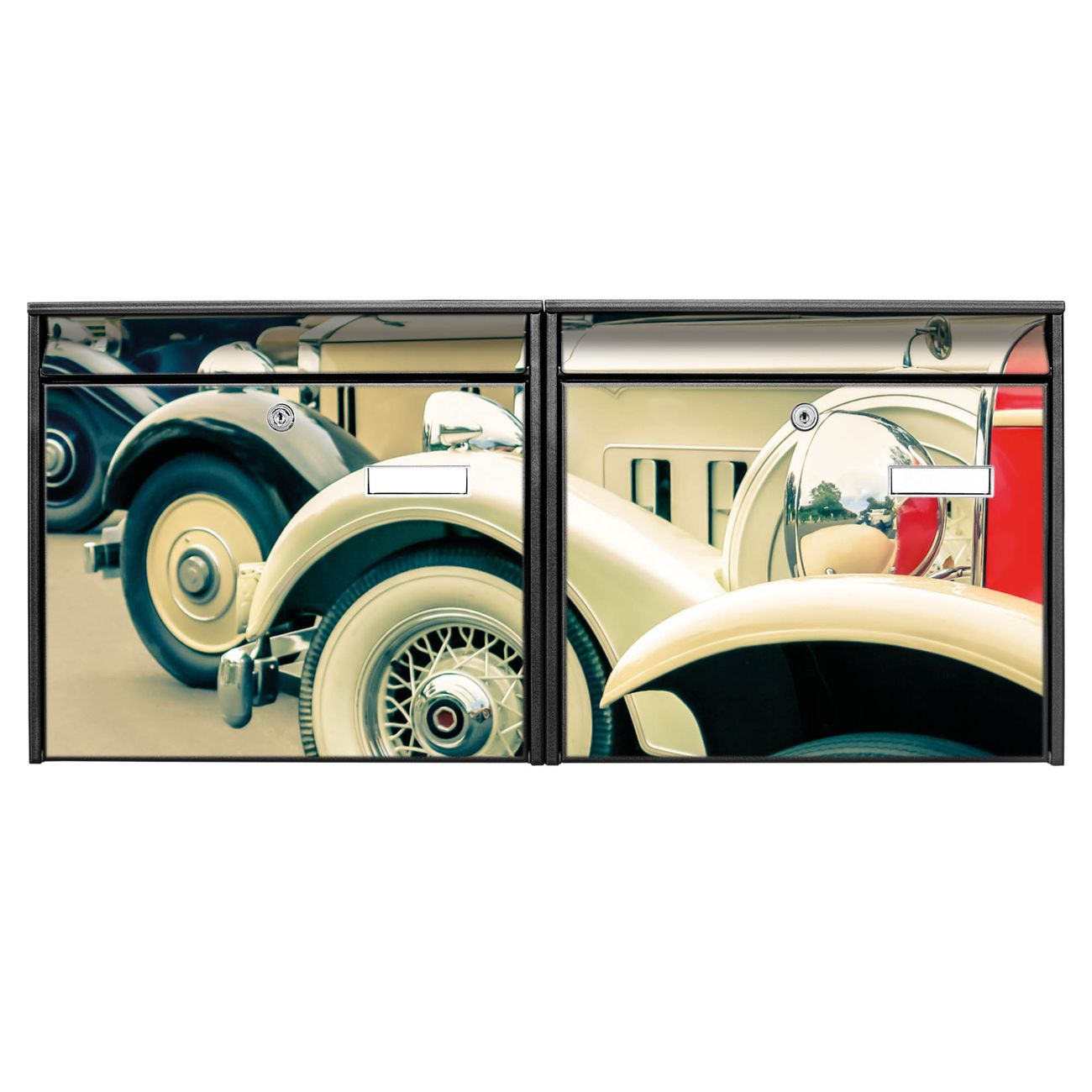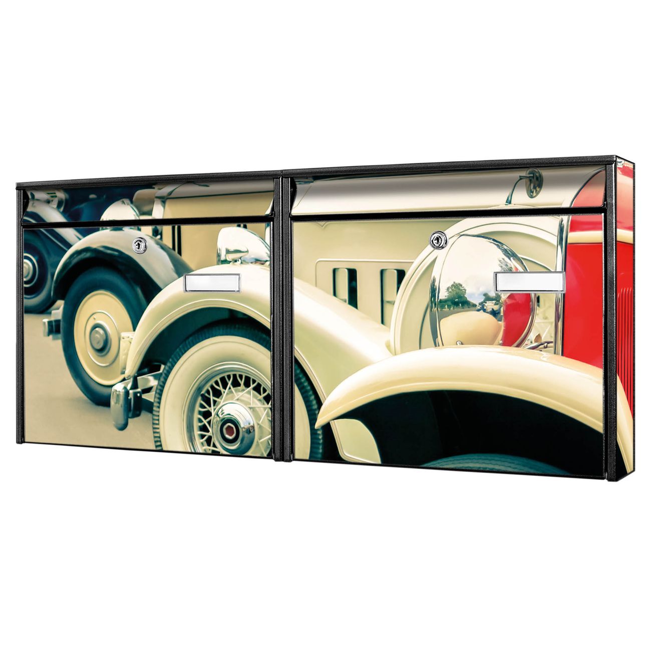 FUNKTION: Die Burg Wächter doppel Briefkastenanlage mit Motiv Oldtimer Räder bietet Ihnen ein großes Fassungsvermögen, sodass auch A4 Sendungen eingeworfen werden können. Das Namensschild lässt sich individuell beschriften. DESIGN: Die 2 Briefkästen mit Oldtimer Räder Motiv haben ein sehr ansprechendes und zeitloses Design. Heben Sie Sich von der tristen grauen Masse ab, ohne auf Funktionalität zu verzichten. Sie erhalten 2 Schlüssel sowie das Montagematerial. DETAILS: Der Doppelbriefkasten besteht aus verzinktem Stahl weiß. Er ist 72,5cm x 32,2cm x 10cm groß. Das Motiv besteht aus einer wetter- und UV-festen Folie, die Ihren Briefkasten zusätzlich vor Kratzern schützt. NUTZEN: Die stabile Bauart sowie die Wetterfestigkeit machen diese doppel Briefkästen zu einem zuverlässigen Begleiter im Alltag. Effektvoll in Reihe gehangen schmückt die Anlage jede Hauswand. BANJADO: Ihr Briefkasten wird in Sachsen in einer kleinen Manufaktur von Hand veredelt. Die Motivfolie ist lösungsmittelfrei und schutzlaminiert für einen langen Halt. Wir legen großen Wert auf die Verbindung von Funktionalität und Design. Sie erhalten Handarbeit aus Sachsen.