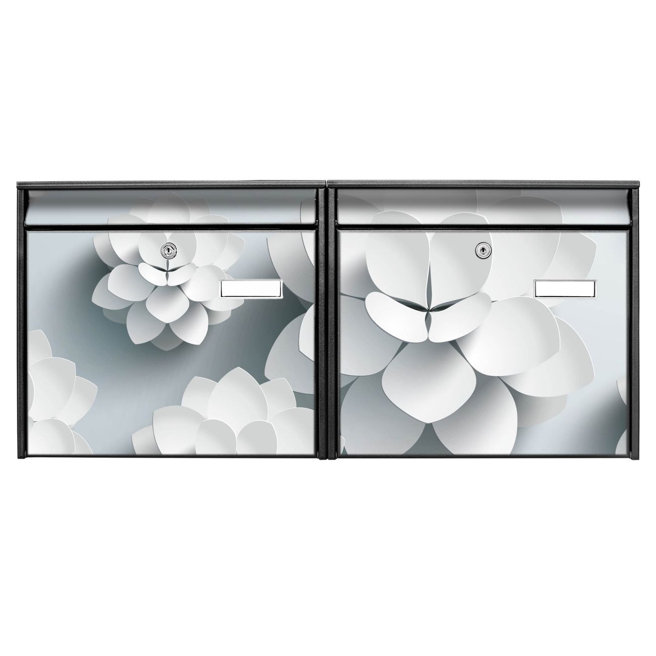 FUNKTION: Die Burg Wächter doppel Briefkastenanlage mit Motiv Papier Lotus bietet Ihnen ein großes Fassungsvermögen, sodass auch A4 Sendungen eingeworfen werden können. Das Namensschild lässt sich individuell beschriften. DESIGN: Die 2 Briefkästen mit Papier Lotus Motiv haben ein sehr ansprechendes und zeitloses Design. Heben Sie Sich von der tristen grauen Masse ab, ohne auf Funktionalität zu verzichten. Sie erhalten 2 Schlüssel sowie das Montagematerial. DETAILS: Der Doppelbriefkasten besteht aus verzinktem Stahl weiß. Er ist 72,5cm x 32,2cm x 10cm groß. Das Motiv besteht aus einer wetter- und UV-festen Folie, die Ihren Briefkasten zusätzlich vor Kratzern schützt. NUTZEN: Die stabile Bauart sowie die Wetterfestigkeit machen diese doppel Briefkästen zu einem zuverlässigen Begleiter im Alltag. Effektvoll in Reihe gehangen schmückt die Anlage jede Hauswand. BANJADO: Ihr Briefkasten wird in Sachsen in einer kleinen Manufaktur von Hand veredelt. Die Motivfolie ist lösungsmittelfrei und schutzlaminiert für einen langen Halt. Wir legen großen Wert auf die Verbindung von Funktionalität und Design. Sie erhalten Handarbeit aus Sachsen.