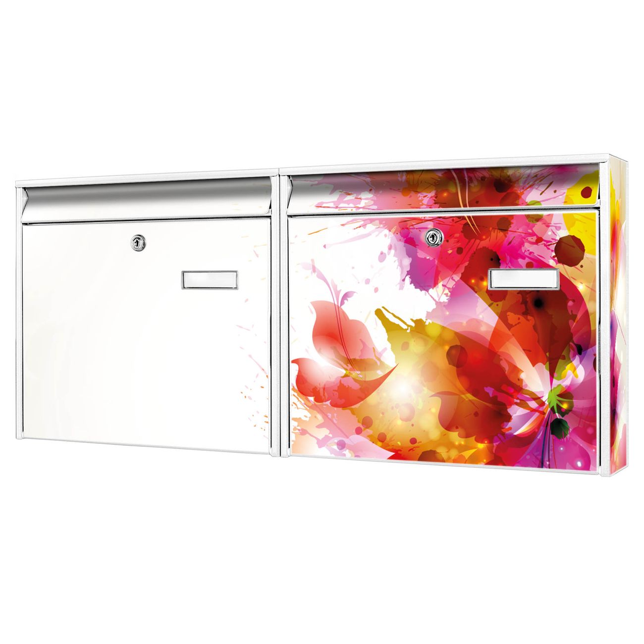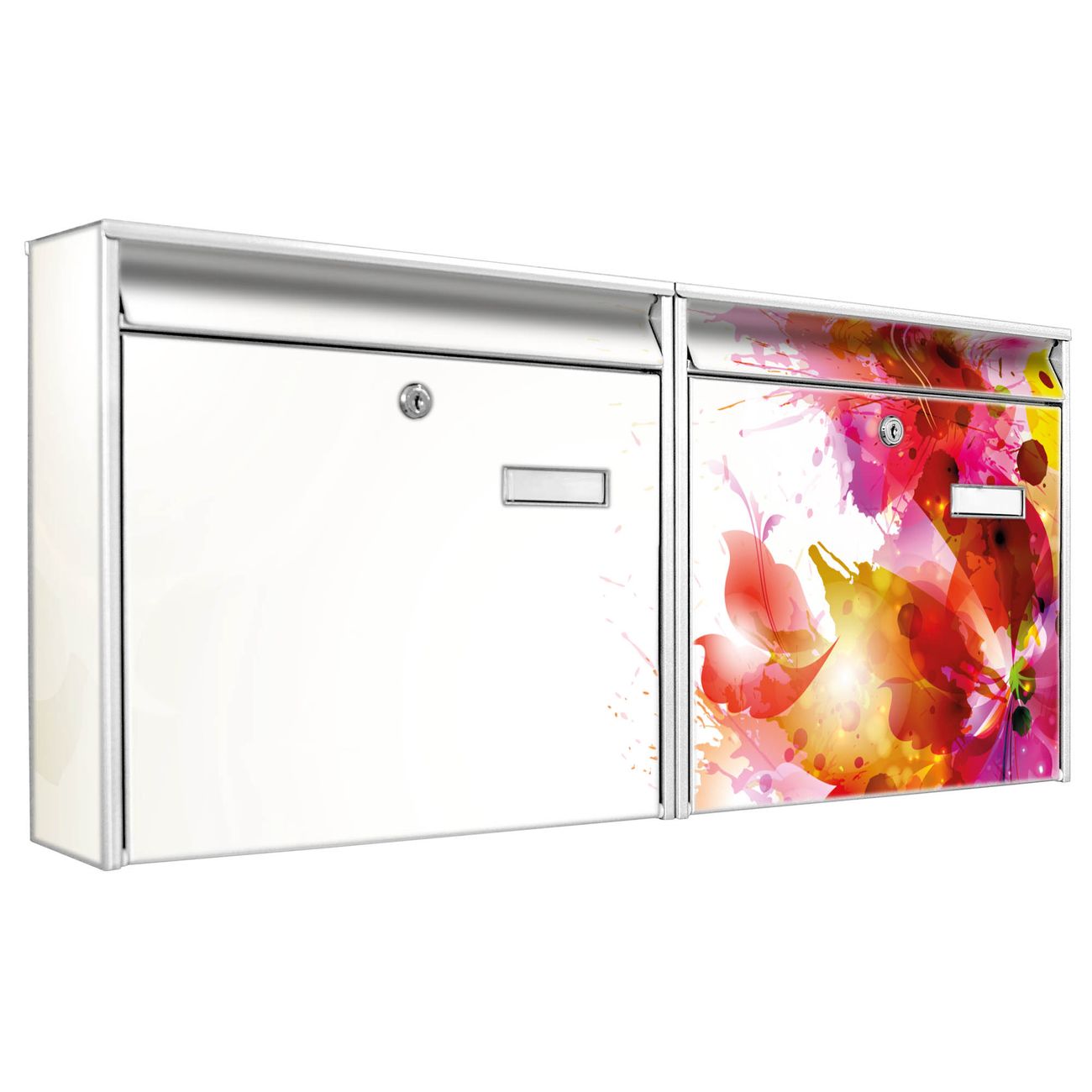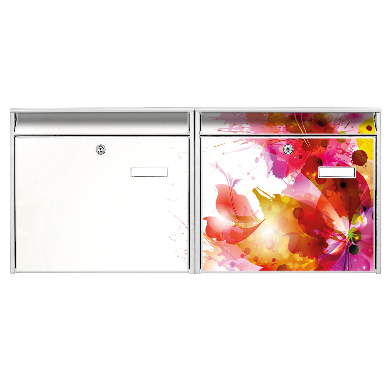 FUNKTION: Die Burg Wächter doppel Briefkastenanlage mit Motiv Pink Explosion bietet Ihnen ein großes Fassungsvermögen, sodass auch A4 Sendungen eingeworfen werden können. Das Namensschild lässt sich individuell beschriften. DESIGN: Die 2 Briefkästen mit Pink Explosion Motiv haben ein sehr ansprechendes und zeitloses Design. Heben Sie Sich von der tristen grauen Masse ab, ohne auf Funktionalität zu verzichten. Sie erhalten 2 Schlüssel sowie das Montagematerial. DETAILS: Der Doppelbriefkasten besteht aus verzinktem Stahl weiß. Er ist 72,5cm x 32,2cm x 10cm groß. Das Motiv besteht aus einer wetter- und UV-festen Folie, die Ihren Briefkasten zusätzlich vor Kratzern schützt. NUTZEN: Die stabile Bauart sowie die Wetterfestigkeit machen diese doppel Briefkästen zu einem zuverlässigen Begleiter im Alltag. Effektvoll in Reihe gehangen schmückt die Anlage jede Hauswand. BANJADO: Ihr Briefkasten wird in Sachsen in einer kleinen Manufaktur von Hand veredelt. Die Motivfolie ist lösungsmittelfrei und schutzlaminiert für einen langen Halt. Wir legen großen Wert auf die Verbindung von Funktionalität und Design. Sie erhalten Handarbeit aus Sachsen.