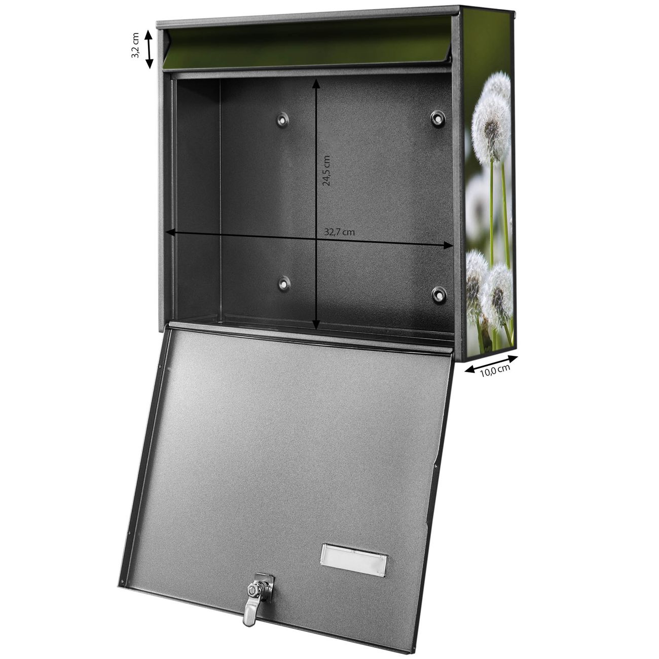FUNKTION: Die Burg Wächter doppel Briefkastenanlage mit Motiv Pusteblumenwiese bietet Ihnen ein großes Fassungsvermögen, sodass auch A4 Sendungen eingeworfen werden können. Das Namensschild lässt sich individuell beschriften. DESIGN: Die 2 Briefkästen mit Pusteblumenwiese Motiv haben ein sehr ansprechendes und zeitloses Design. Heben Sie Sich von der tristen grauen Masse ab, ohne auf Funktionalität zu verzichten. Sie erhalten 2 Schlüssel sowie das Montagematerial. DETAILS: Der Doppelbriefkasten besteht aus verzinktem Stahl weiß. Er ist 72,5cm x 32,2cm x 10cm groß. Das Motiv besteht aus einer wetter- und UV-festen Folie, die Ihren Briefkasten zusätzlich vor Kratzern schützt. NUTZEN: Die stabile Bauart sowie die Wetterfestigkeit machen diese doppel Briefkästen zu einem zuverlässigen Begleiter im Alltag. Effektvoll in Reihe gehangen schmückt die Anlage jede Hauswand. BANJADO: Ihr Briefkasten wird in Sachsen in einer kleinen Manufaktur von Hand veredelt. Die Motivfolie ist lösungsmittelfrei und schutzlaminiert für einen langen Halt. Wir legen großen Wert auf die Verbindung von Funktionalität und Design. Sie erhalten Handarbeit aus Sachsen.