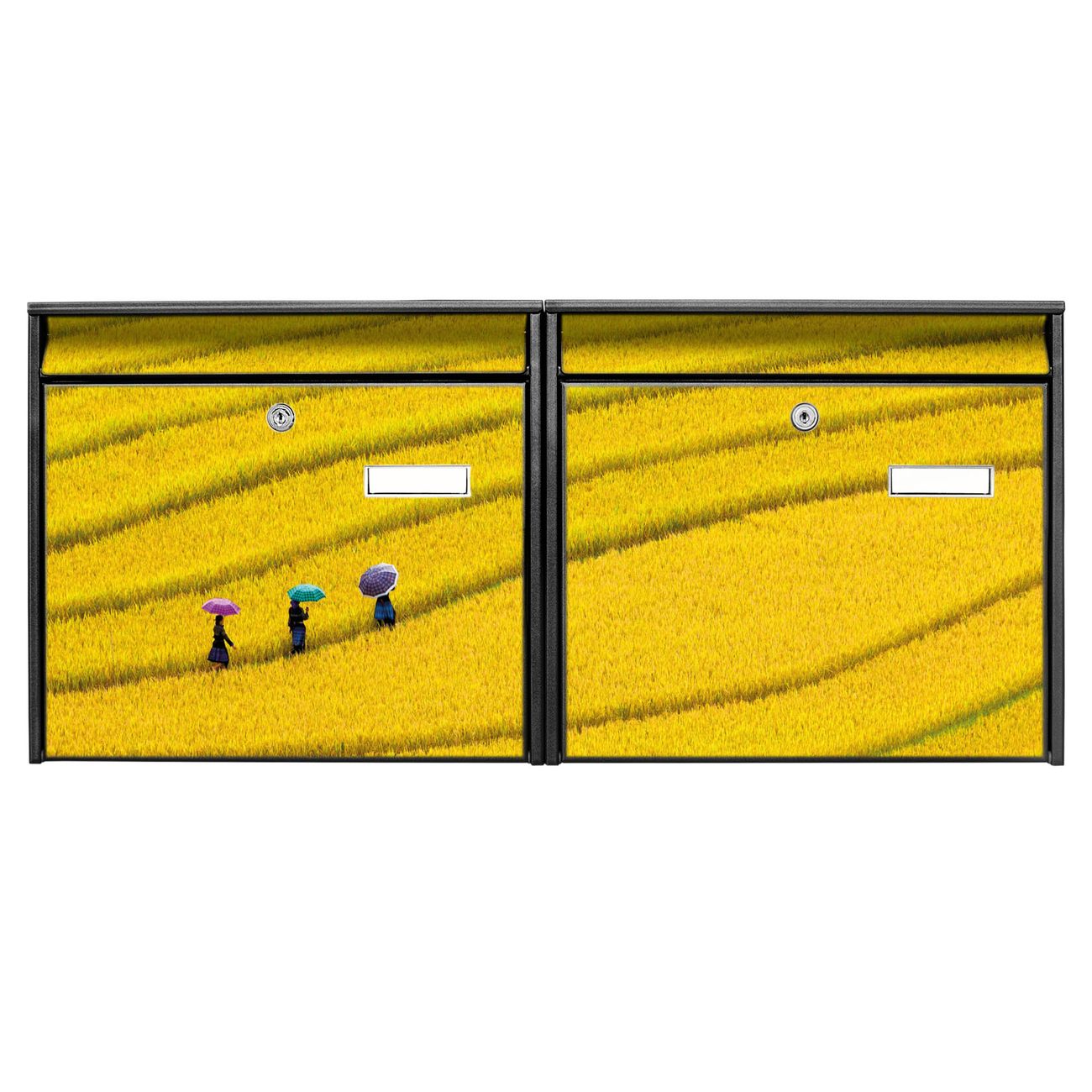 FUNKTION: Die Burg Wächter doppel Briefkastenanlage mit Motiv Reisfeld Vietnam bietet Ihnen ein großes Fassungsvermögen, sodass auch A4 Sendungen eingeworfen werden können. Das Namensschild lässt sich individuell beschriften. DESIGN: Die 2 Briefkästen mit Reisfeld Vietnam Motiv haben ein sehr ansprechendes und zeitloses Design. Heben Sie Sich von der tristen grauen Masse ab, ohne auf Funktionalität zu verzichten. Sie erhalten 2 Schlüssel sowie das Montagematerial. DETAILS: Der Doppelbriefkasten besteht aus verzinktem Stahl weiß. Er ist 72,5cm x 32,2cm x 10cm groß. Das Motiv besteht aus einer wetter- und UV-festen Folie, die Ihren Briefkasten zusätzlich vor Kratzern schützt. NUTZEN: Die stabile Bauart sowie die Wetterfestigkeit machen diese doppel Briefkästen zu einem zuverlässigen Begleiter im Alltag. Effektvoll in Reihe gehangen schmückt die Anlage jede Hauswand. BANJADO: Ihr Briefkasten wird in Sachsen in einer kleinen Manufaktur von Hand veredelt. Die Motivfolie ist lösungsmittelfrei und schutzlaminiert für einen langen Halt. Wir legen großen Wert auf die Verbindung von Funktionalität und Design. Sie erhalten Handarbeit aus Sachsen.