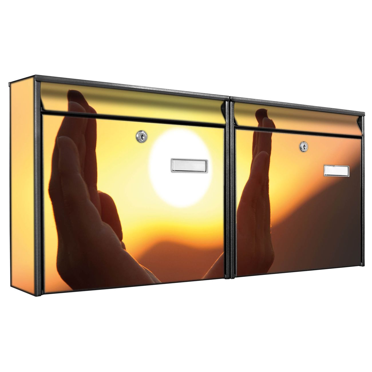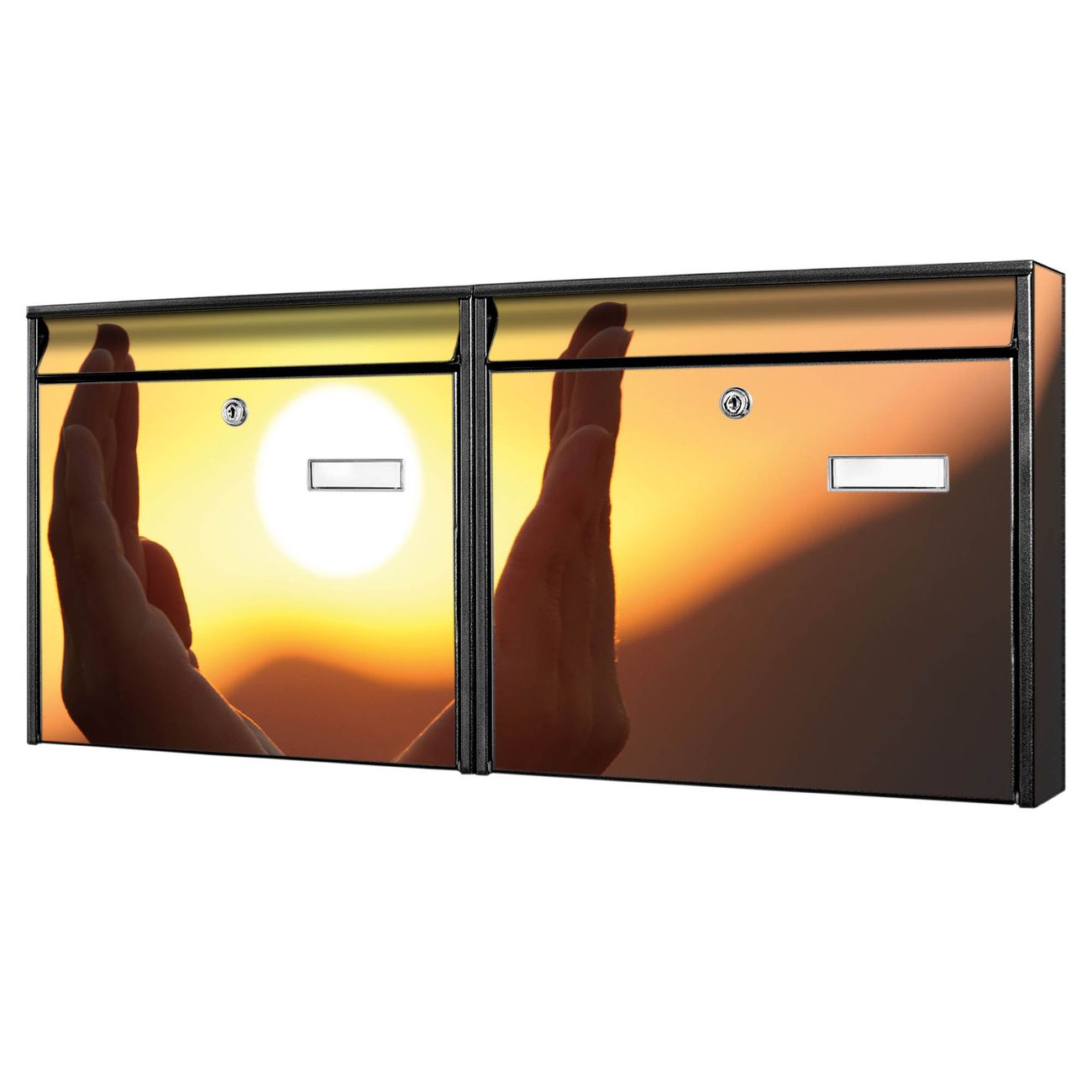 FUNKTION: Die Burg Wächter doppel Briefkastenanlage mit Motiv Sonnenanbeter bietet Ihnen ein großes Fassungsvermögen, sodass auch A4 Sendungen eingeworfen werden können. Das Namensschild lässt sich individuell beschriften. DESIGN: Die 2 Briefkästen mit Sonnenanbeter Motiv haben ein sehr ansprechendes und zeitloses Design. Heben Sie Sich von der tristen grauen Masse ab, ohne auf Funktionalität zu verzichten. Sie erhalten 2 Schlüssel sowie das Montagematerial. DETAILS: Der Doppelbriefkasten besteht aus verzinktem Stahl weiß. Er ist 72,5cm x 32,2cm x 10cm groß. Das Motiv besteht aus einer wetter- und UV-festen Folie, die Ihren Briefkasten zusätzlich vor Kratzern schützt. NUTZEN: Die stabile Bauart sowie die Wetterfestigkeit machen diese doppel Briefkästen zu einem zuverlässigen Begleiter im Alltag. Effektvoll in Reihe gehangen schmückt die Anlage jede Hauswand. BANJADO: Ihr Briefkasten wird in Sachsen in einer kleinen Manufaktur von Hand veredelt. Die Motivfolie ist lösungsmittelfrei und schutzlaminiert für einen langen Halt. Wir legen großen Wert auf die Verbindung von Funktionalität und Design. Sie erhalten Handarbeit aus Sachsen.