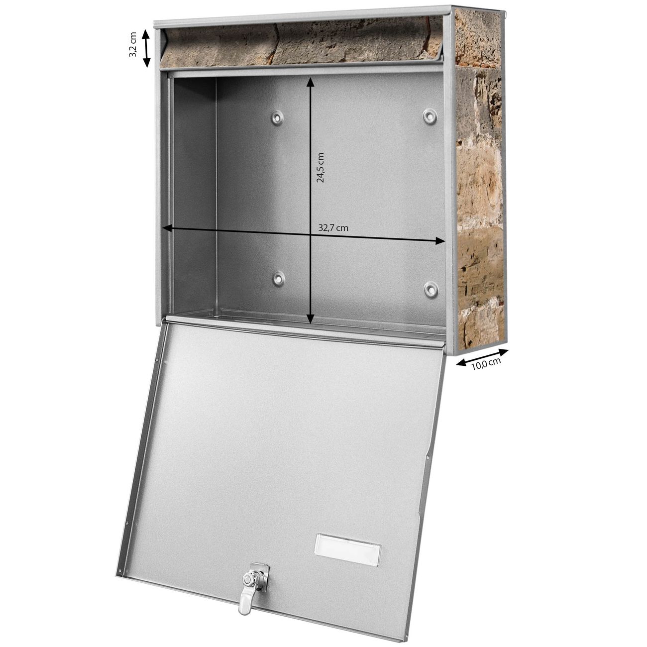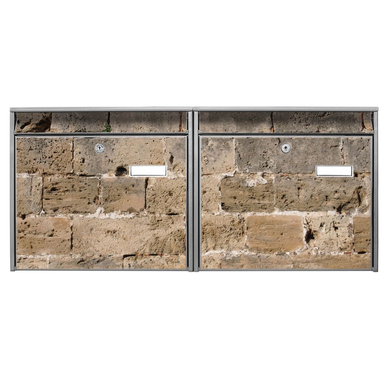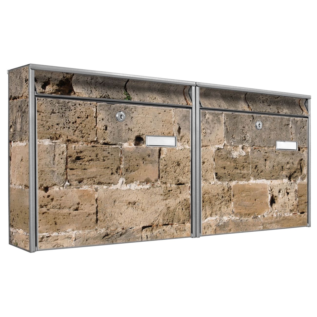 FUNKTION: Die Burg Wächter doppel Briefkastenanlage mit Motiv Steinwand Antik bietet Ihnen ein großes Fassungsvermögen, sodass auch A4 Sendungen eingeworfen werden können. Das Namensschild lässt sich individuell beschriften. DESIGN: Die 2 Briefkästen mit Steinwand Antik Motiv haben ein sehr ansprechendes und zeitloses Design. Heben Sie Sich von der tristen grauen Masse ab, ohne auf Funktionalität zu verzichten. Sie erhalten 2 Schlüssel sowie das Montagematerial. DETAILS: Der Doppelbriefkasten besteht aus verzinktem Stahl weiß. Er ist 72,5cm x 32,2cm x 10cm groß. Das Motiv besteht aus einer wetter- und UV-festen Folie, die Ihren Briefkasten zusätzlich vor Kratzern schützt. NUTZEN: Die stabile Bauart sowie die Wetterfestigkeit machen diese doppel Briefkästen zu einem zuverlässigen Begleiter im Alltag. Effektvoll in Reihe gehangen schmückt die Anlage jede Hauswand. BANJADO: Ihr Briefkasten wird in Sachsen in einer kleinen Manufaktur von Hand veredelt. Die Motivfolie ist lösungsmittelfrei und schutzlaminiert für einen langen Halt. Wir legen großen Wert auf die Verbindung von Funktionalität und Design. Sie erhalten Handarbeit aus Sachsen.