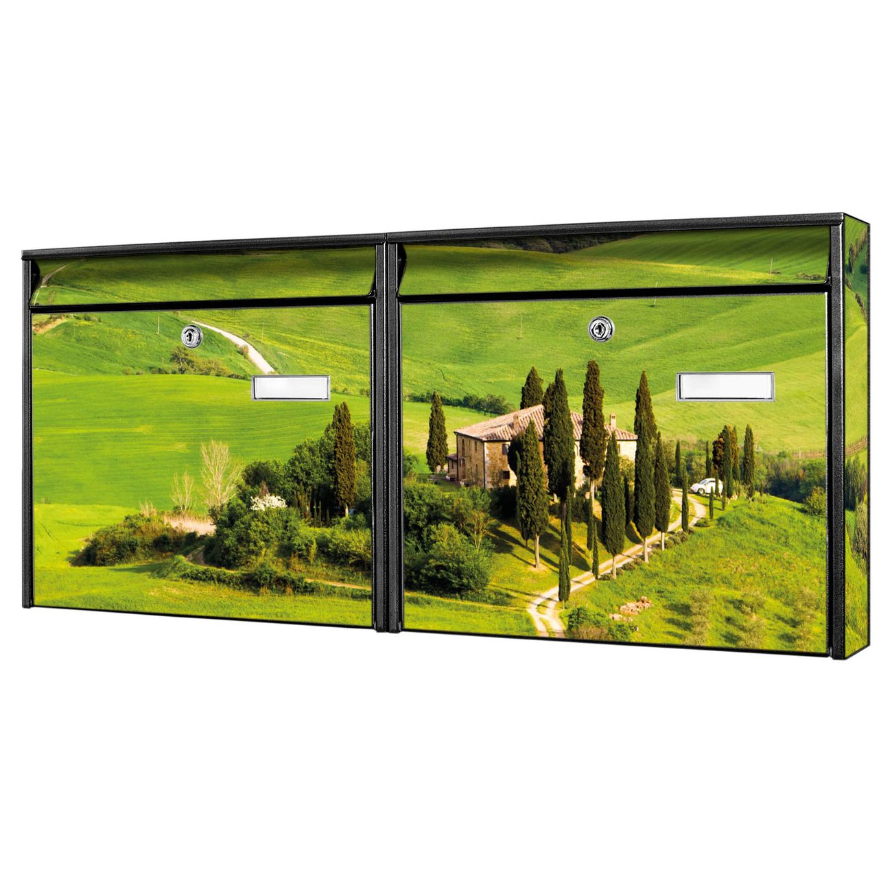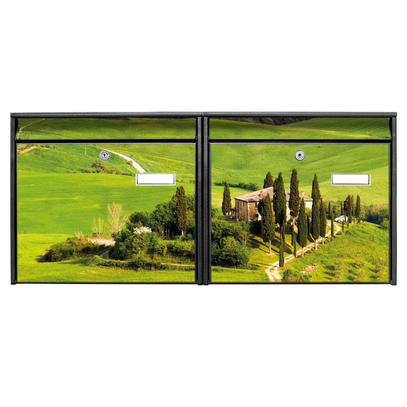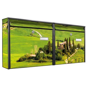 FUNKTION: Die Burg Wächter doppel Briefkastenanlage mit Motiv Toskana bietet Ihnen ein großes Fassungsvermögen, sodass auch A4 Sendungen eingeworfen werden können. Das Namensschild lässt sich individuell beschriften. DESIGN: Die 2 Briefkästen mit Toskana Motiv haben ein sehr ansprechendes und zeitloses Design. Heben Sie Sich von der tristen grauen Masse ab, ohne auf Funktionalität zu verzichten. Sie erhalten 2 Schlüssel sowie das Montagematerial. DETAILS: Der Doppelbriefkasten besteht aus verzinktem Stahl weiß. Er ist 72,5cm x 32,2cm x 10cm groß. Das Motiv besteht aus einer wetter- und UV-festen Folie, die Ihren Briefkasten zusätzlich vor Kratzern schützt. NUTZEN: Die stabile Bauart sowie die Wetterfestigkeit machen diese doppel Briefkästen zu einem zuverlässigen Begleiter im Alltag. Effektvoll in Reihe gehangen schmückt die Anlage jede Hauswand. BANJADO: Ihr Briefkasten wird in Sachsen in einer kleinen Manufaktur von Hand veredelt. Die Motivfolie ist lösungsmittelfrei und schutzlaminiert für einen langen Halt. Wir legen großen Wert auf die Verbindung von Funktionalität und Design. Sie erhalten Handarbeit aus Sachsen.