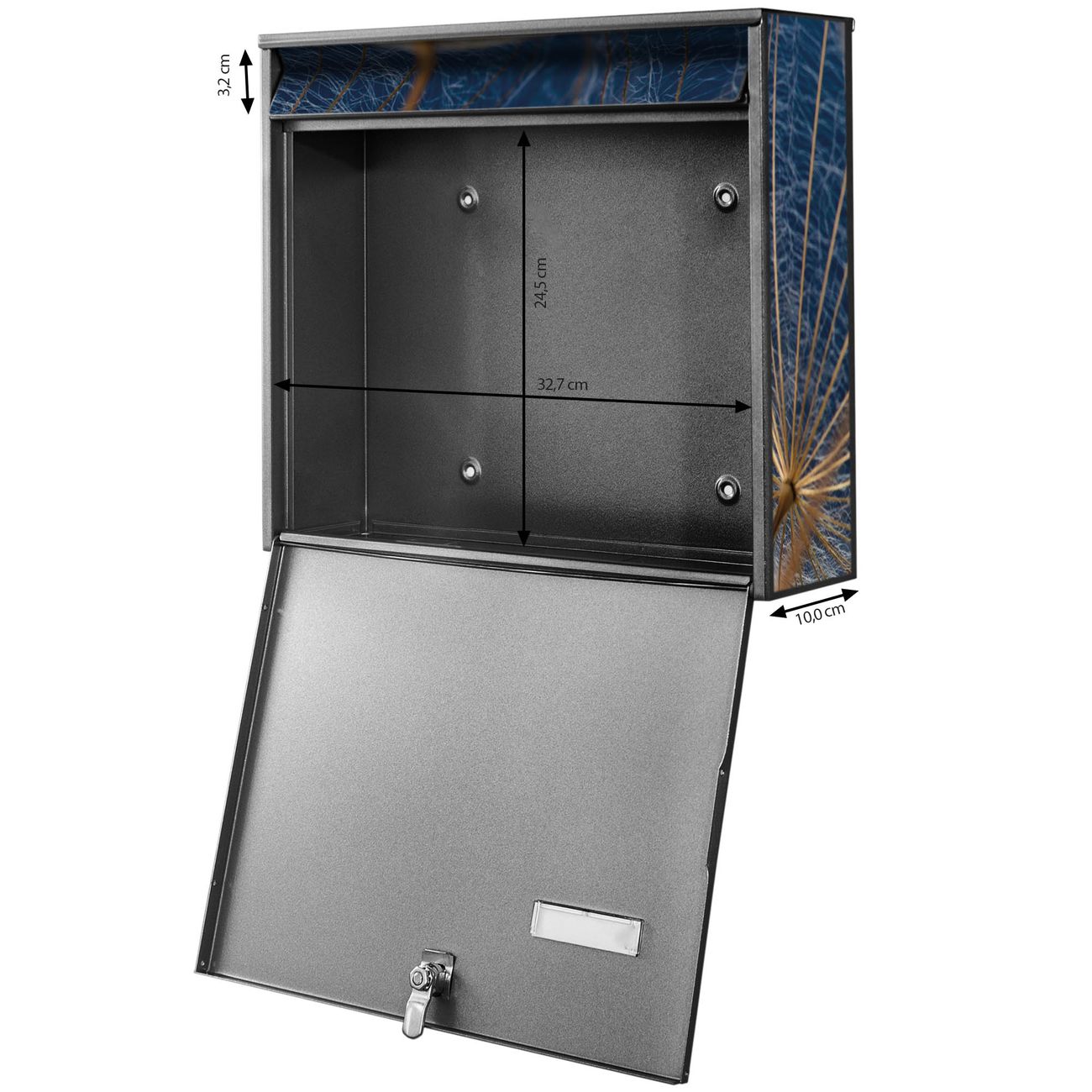 FUNKTION: Die Burg Wächter doppel Briefkastenanlage mit Motiv Verblüht bietet Ihnen ein großes Fassungsvermögen, sodass auch A4 Sendungen eingeworfen werden können. Das Namensschild lässt sich individuell beschriften. DESIGN: Die 2 Briefkästen mit Verblüht Motiv haben ein sehr ansprechendes und zeitloses Design. Heben Sie Sich von der tristen grauen Masse ab, ohne auf Funktionalität zu verzichten. Sie erhalten 2 Schlüssel sowie das Montagematerial. DETAILS: Der Doppelbriefkasten besteht aus verzinktem Stahl weiß. Er ist 72,5cm x 32,2cm x 10cm groß. Das Motiv besteht aus einer wetter- und UV-festen Folie, die Ihren Briefkasten zusätzlich vor Kratzern schützt. NUTZEN: Die stabile Bauart sowie die Wetterfestigkeit machen diese doppel Briefkästen zu einem zuverlässigen Begleiter im Alltag. Effektvoll in Reihe gehangen schmückt die Anlage jede Hauswand. BANJADO: Ihr Briefkasten wird in Sachsen in einer kleinen Manufaktur von Hand veredelt. Die Motivfolie ist lösungsmittelfrei und schutzlaminiert für einen langen Halt. Wir legen großen Wert auf die Verbindung von Funktionalität und Design. Sie erhalten Handarbeit aus Sachsen.