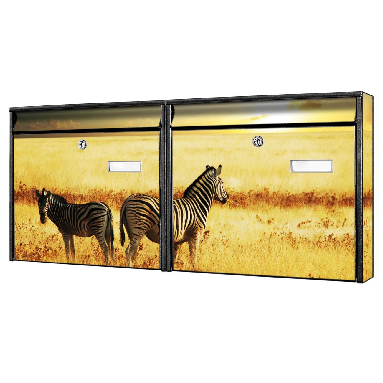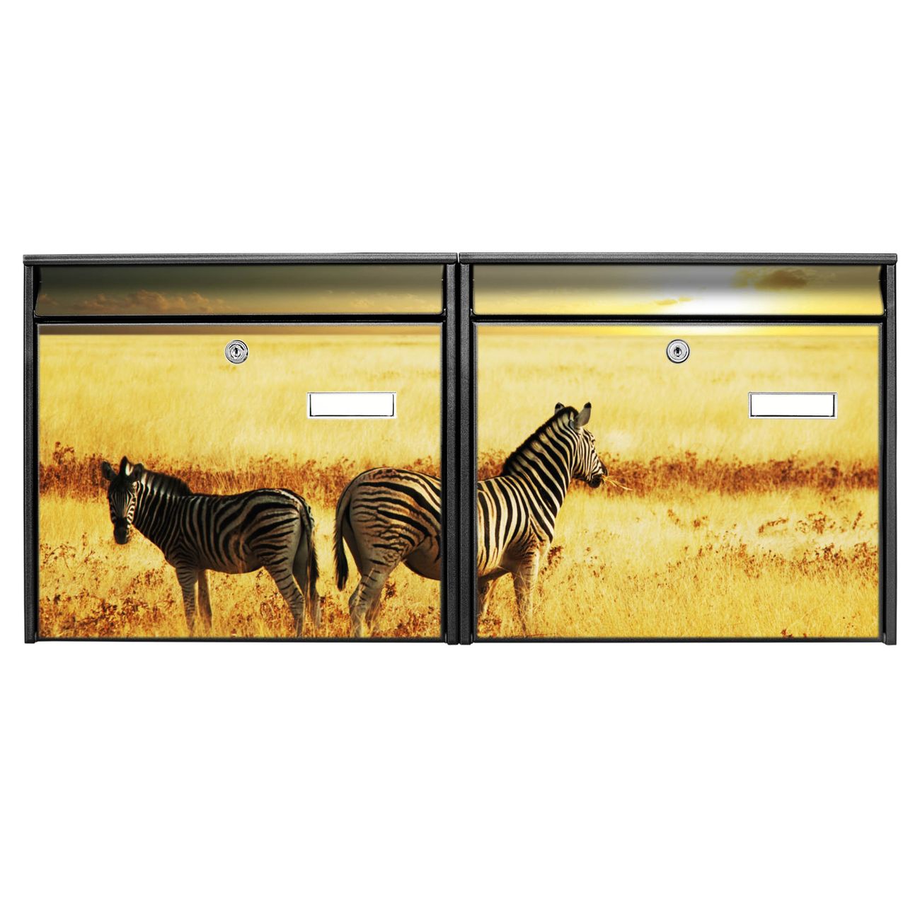 FUNKTION: Die Burg Wächter doppel Briefkastenanlage mit Motiv Zwei Zebras bietet Ihnen ein großes Fassungsvermögen, sodass auch A4 Sendungen eingeworfen werden können. Das Namensschild lässt sich individuell beschriften. DESIGN: Die 2 Briefkästen mit Zwei Zebras Motiv haben ein sehr ansprechendes und zeitloses Design. Heben Sie Sich von der tristen grauen Masse ab, ohne auf Funktionalität zu verzichten. Sie erhalten 2 Schlüssel sowie das Montagematerial. DETAILS: Der Doppelbriefkasten besteht aus verzinktem Stahl weiß. Er ist 72,5cm x 32,2cm x 10cm groß. Das Motiv besteht aus einer wetter- und UV-festen Folie, die Ihren Briefkasten zusätzlich vor Kratzern schützt. NUTZEN: Die stabile Bauart sowie die Wetterfestigkeit machen diese doppel Briefkästen zu einem zuverlässigen Begleiter im Alltag. Effektvoll in Reihe gehangen schmückt die Anlage jede Hauswand. BANJADO: Ihr Briefkasten wird in Sachsen in einer kleinen Manufaktur von Hand veredelt. Die Motivfolie ist lösungsmittelfrei und schutzlaminiert für einen langen Halt. Wir legen großen Wert auf die Verbindung von Funktionalität und Design. Sie erhalten Handarbeit aus Sachsen.