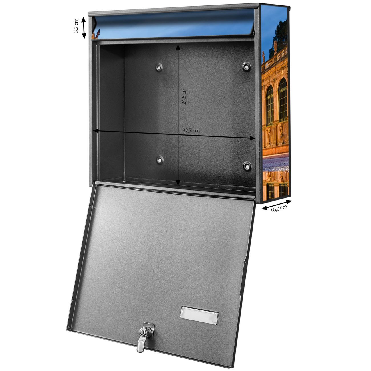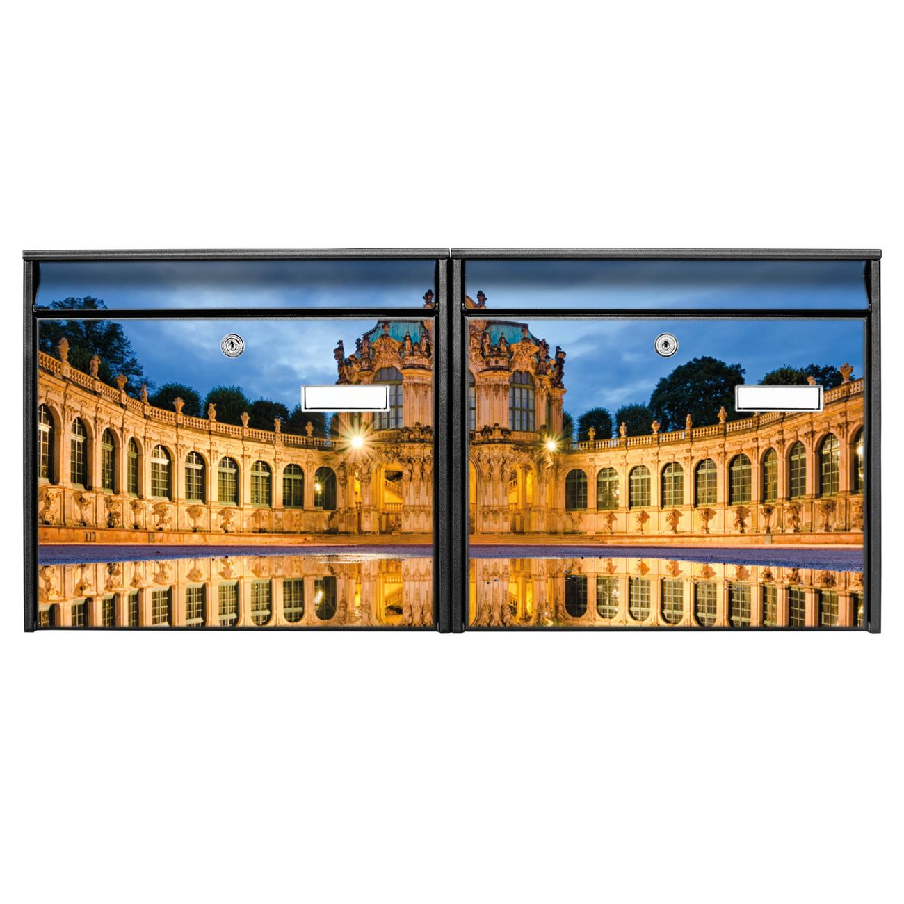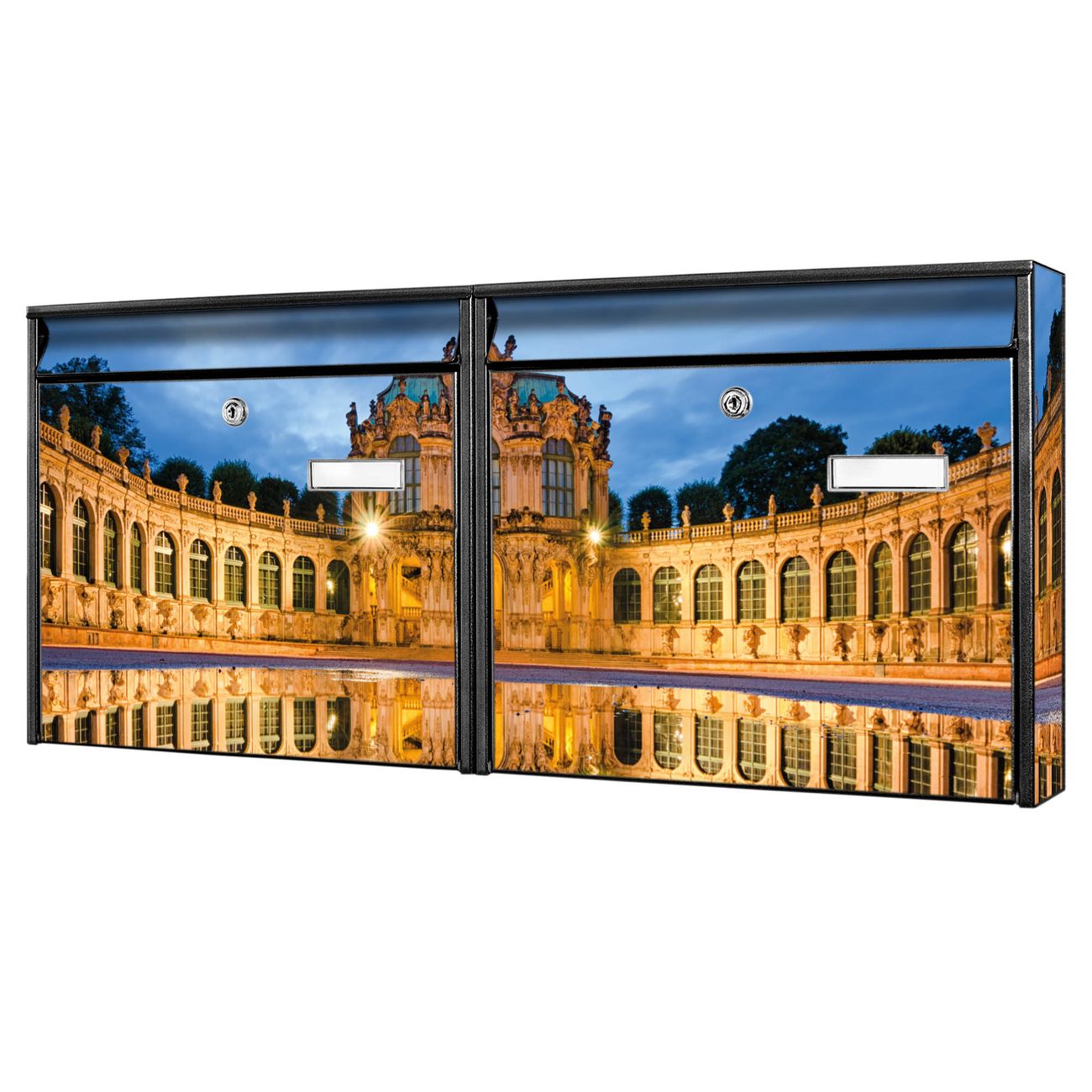 FUNKTION: Die Burg Wächter doppel Briefkastenanlage mit Motiv Zwinger Dresden bietet Ihnen ein großes Fassungsvermögen, sodass auch A4 Sendungen eingeworfen werden können. Das Namensschild lässt sich individuell beschriften. DESIGN: Die 2 Briefkästen mit Zwinger Dresden Motiv haben ein sehr ansprechendes und zeitloses Design. Heben Sie Sich von der tristen grauen Masse ab, ohne auf Funktionalität zu verzichten. Sie erhalten 2 Schlüssel sowie das Montagematerial. DETAILS: Der Doppelbriefkasten besteht aus verzinktem Stahl weiß. Er ist 72,5cm x 32,2cm x 10cm groß. Das Motiv besteht aus einer wetter- und UV-festen Folie, die Ihren Briefkasten zusätzlich vor Kratzern schützt. NUTZEN: Die stabile Bauart sowie die Wetterfestigkeit machen diese doppel Briefkästen zu einem zuverlässigen Begleiter im Alltag. Effektvoll in Reihe gehangen schmückt die Anlage jede Hauswand. BANJADO: Ihr Briefkasten wird in Sachsen in einer kleinen Manufaktur von Hand veredelt. Die Motivfolie ist lösungsmittelfrei und schutzlaminiert für einen langen Halt. Wir legen großen Wert auf die Verbindung von Funktionalität und Design. Sie erhalten Handarbeit aus Sachsen.