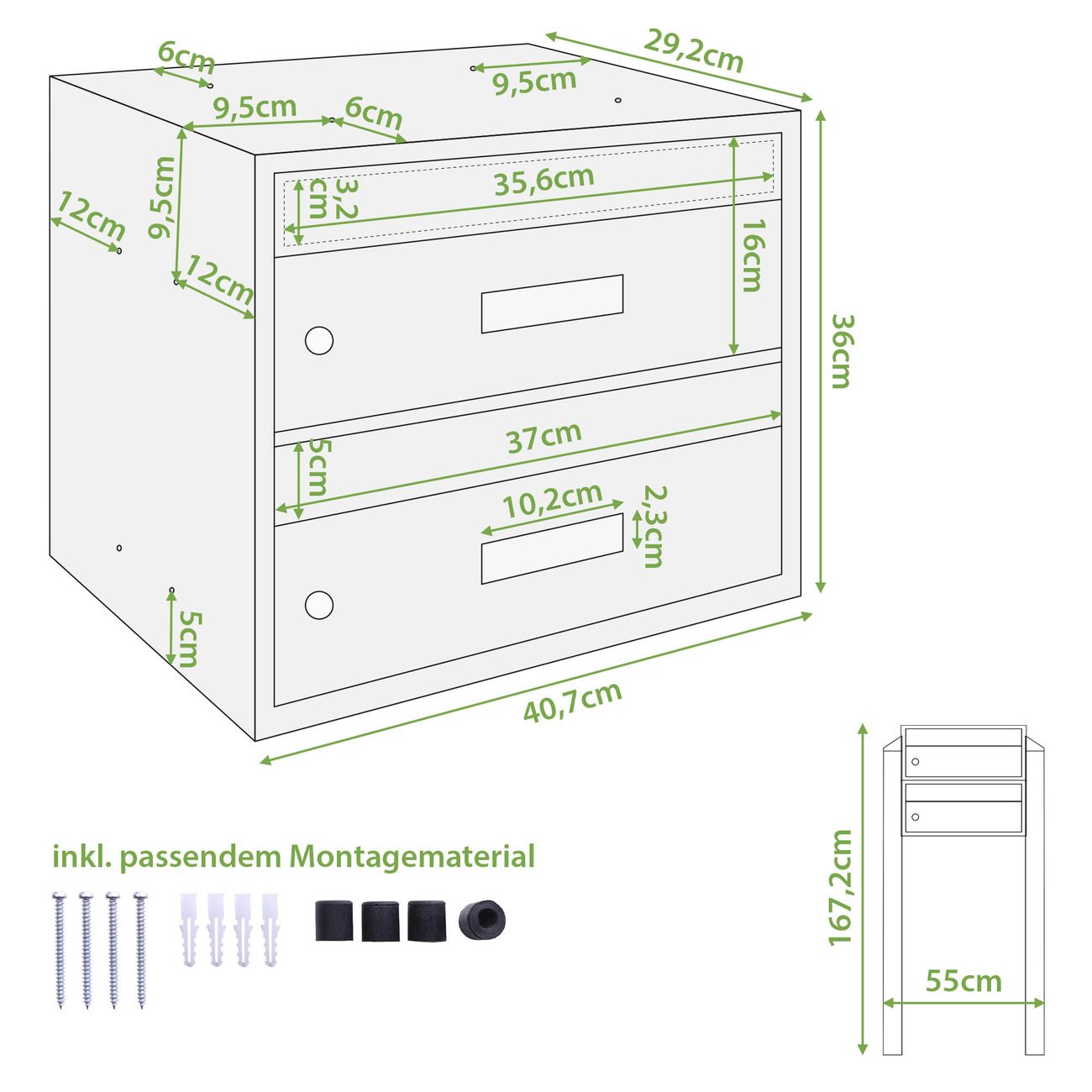 Die Briefkasten Anlage für 2 Parteien hat folgende Abmessungen 55 x 167,2 x 29,2cm. Der Mehrfamilienhaus Briefkasten mit Namensschild ist aus witterungsbeständigem Stahl gefertigt.