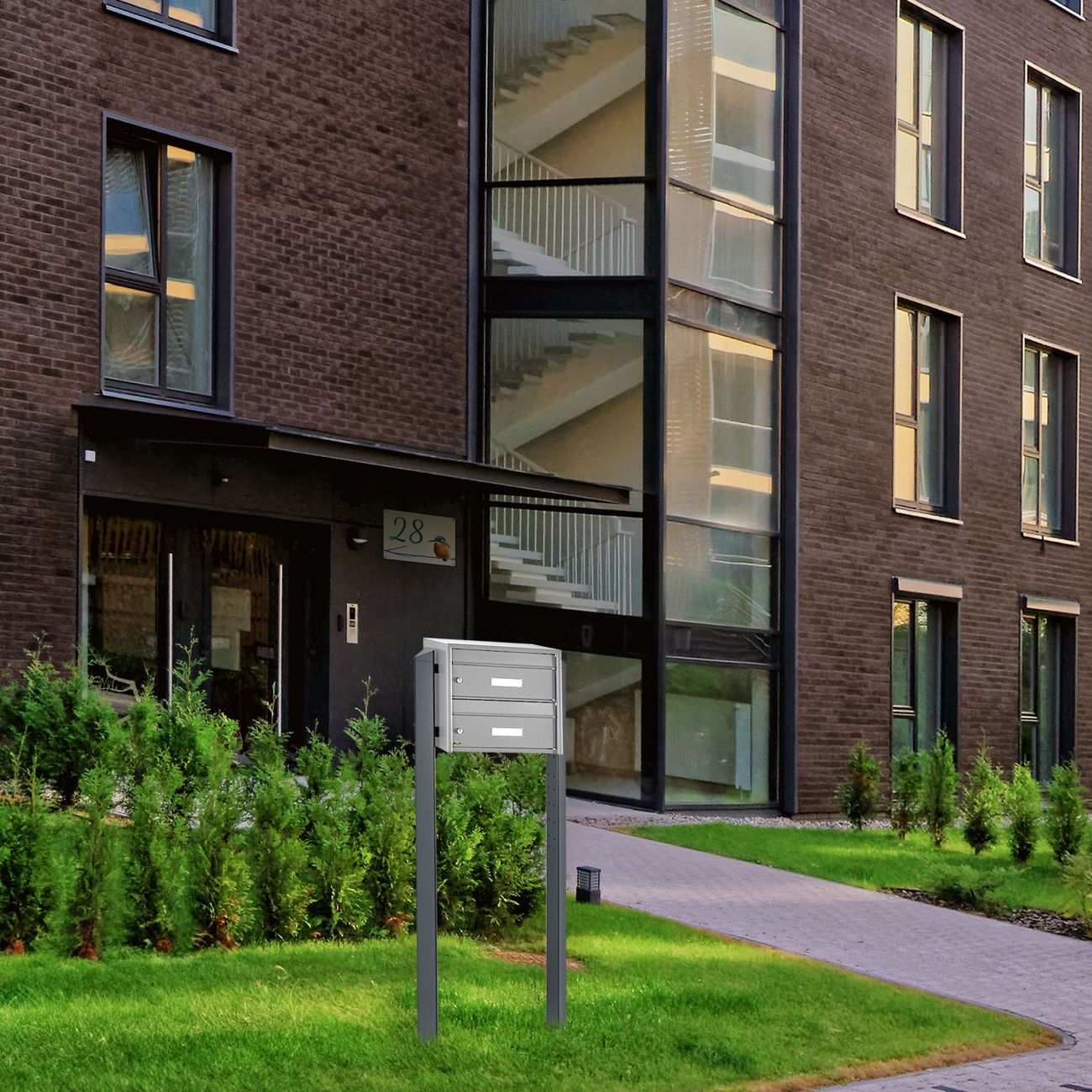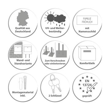 Der Briefkasten mit Standfuß freistehend ist schnell einsatzbereit. Montagematerial und je 2 Schlüssel werden mitgeliefert. Mithilfe der Schlüsselnummer können Sie jederzeit Schlüssel nachfertigen lassen.