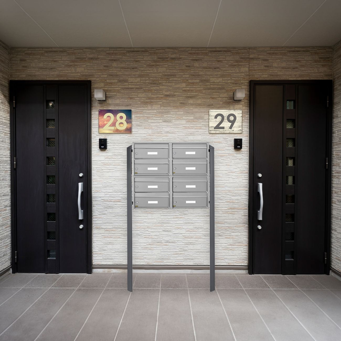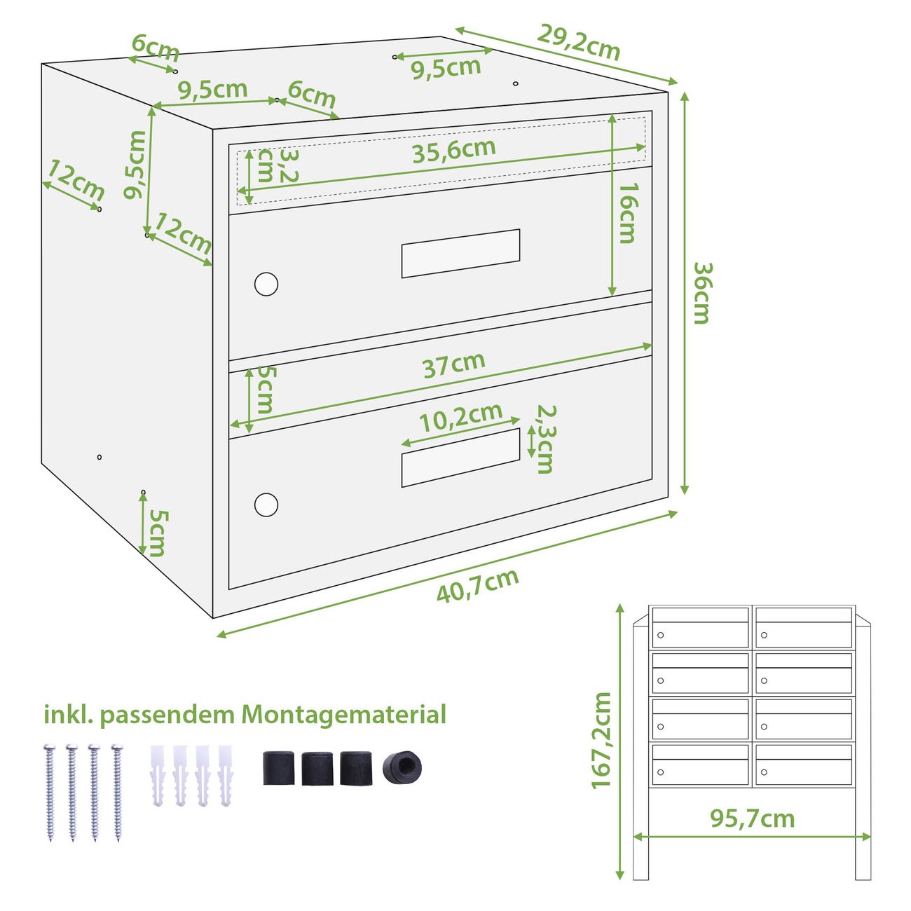 Die Briefkasten Anlage für 8 Parteien hat folgende Abmessungen 95,7 x 167,2 x 29,2cm. Der Mehrfamilienhaus Briefkasten mit Namensschild ist aus witterungsbeständigem Stahl gefertigt.