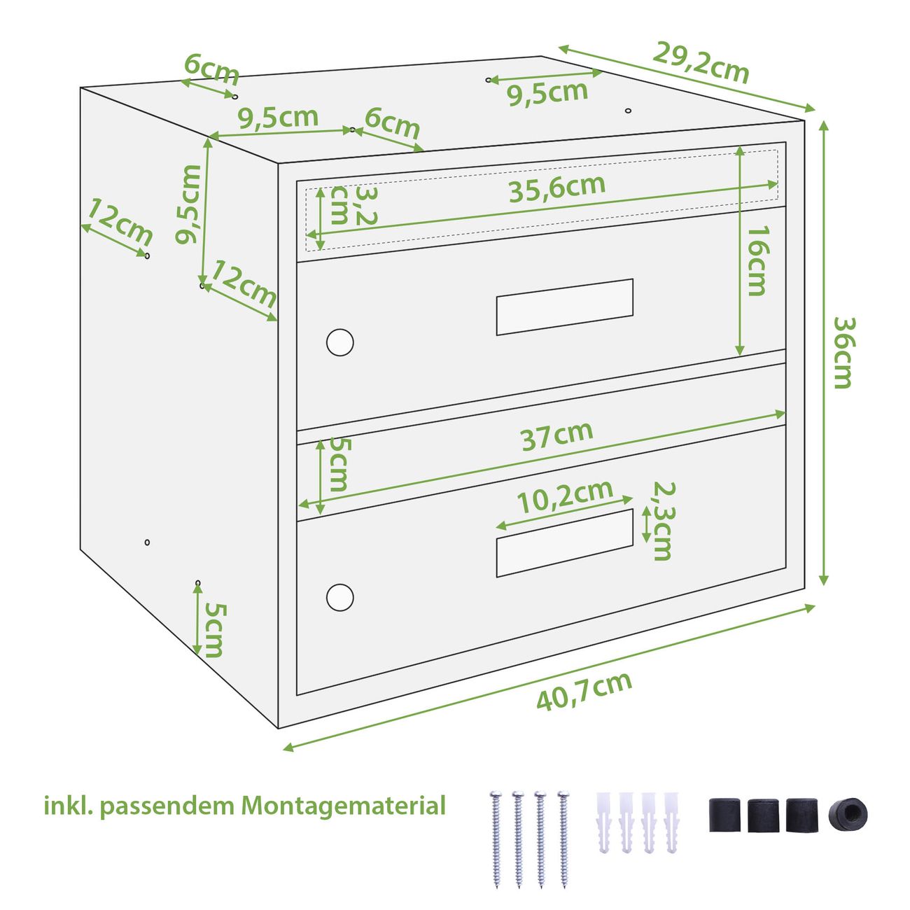 Die Briefkasten Anlage für 2 Parteien hat folgende Abmessungen 40,7 x 36 x 29,2cm. Der Mehrfamilienhaus Briefkasten mit Namensschild ist aus witterungsbeständigem Stahl gefertigt.