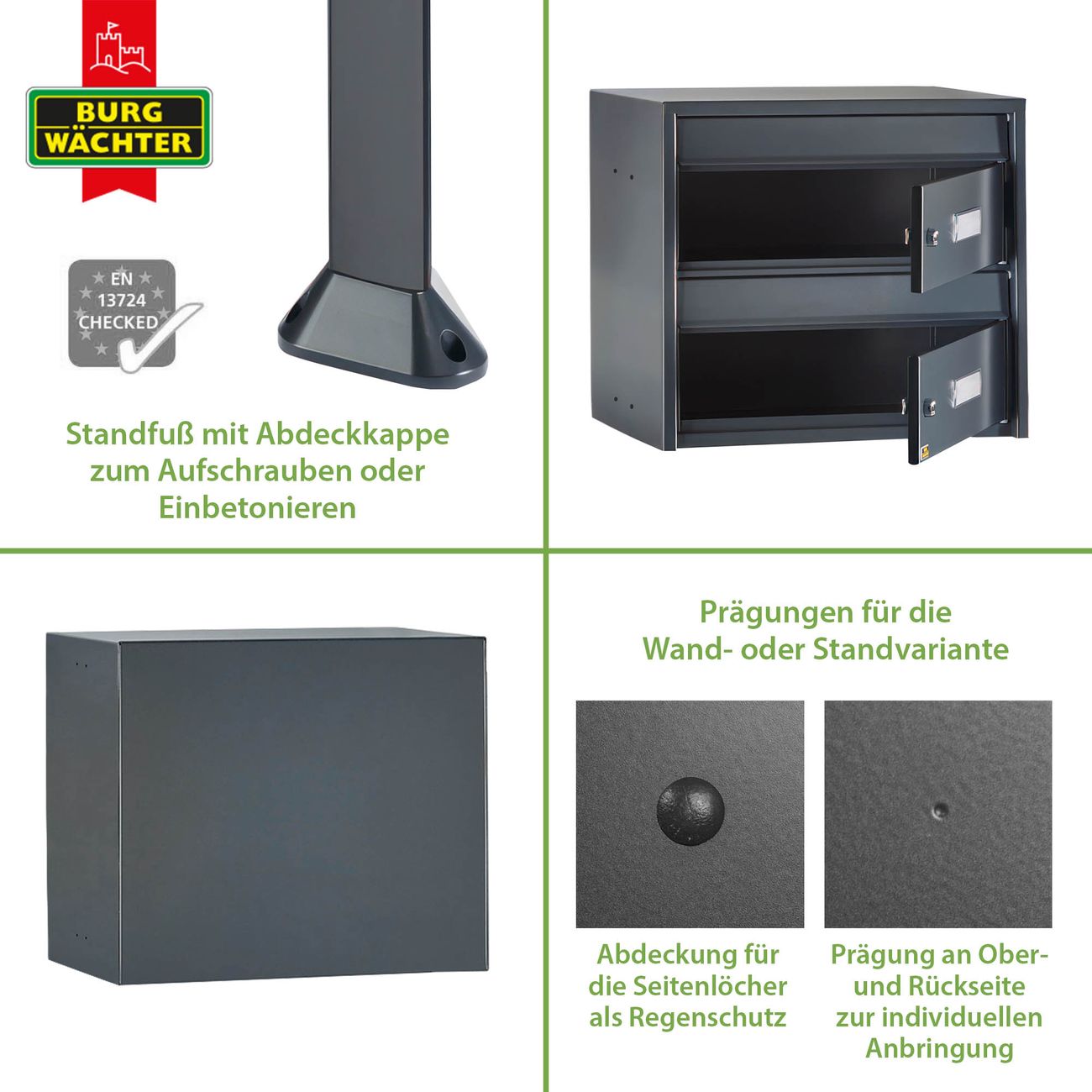 Wählen Sie eine Briefkastenanlage in Ihrer Lieblingsfarbe und profitieren Sie von der Kombination aus Stil, Haltbarkeit und Benutzerfreundlichkeit, die unser Produkt bietet.