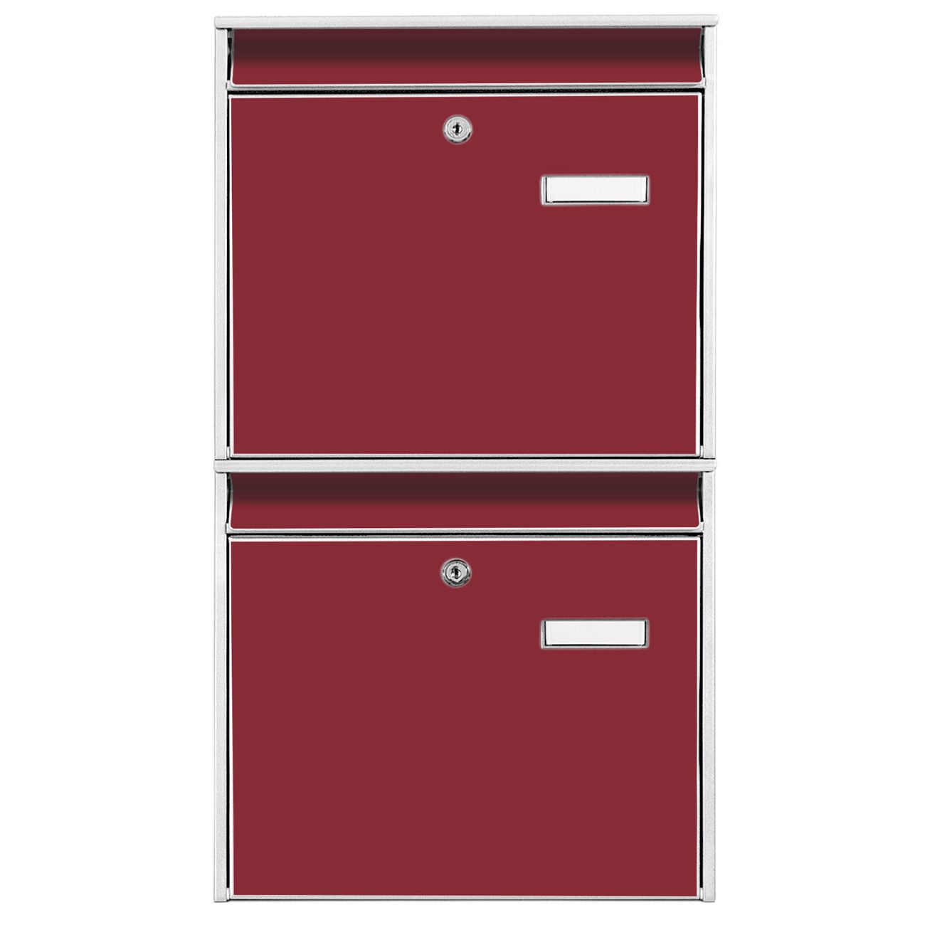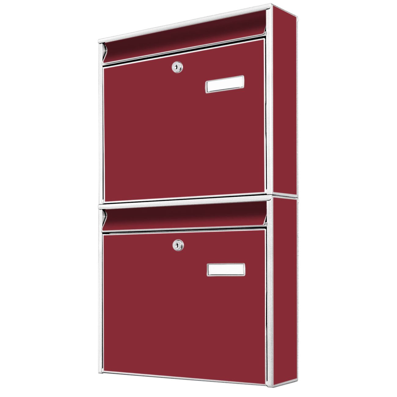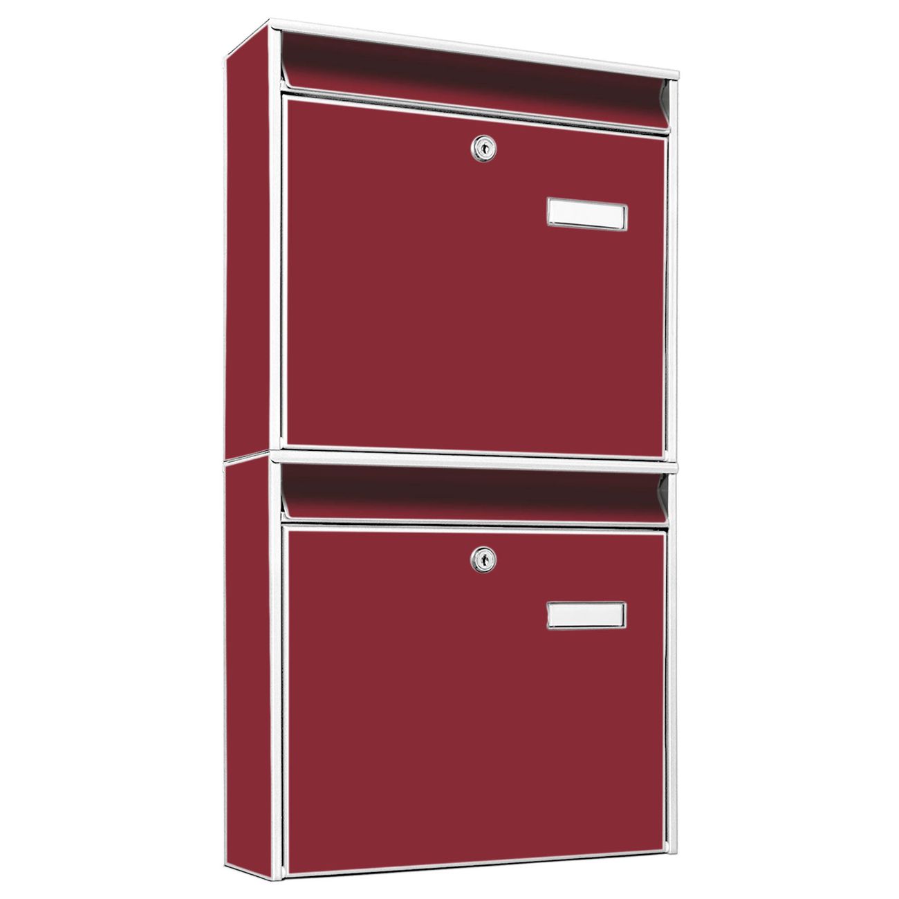 FUNKTION: Die Burg-Wächter Briefkastenanlage mit Farbe Burgund bietet Ihnen ausreichend Fassungsvermögen um auch A4 und C4 Sendungen zu empfangen. Das integrierte Namensschild lässt sich individuell beschriften. Wählen Sie aus den Grundfarben weiß, silber und schwarz. DESIGN: Die 2 Briefkästen haben ein ansprechendes und zeitloses Design, ohne dabei auf Funktionalität zu verzichten. Das Material ist sehr stabil, wetterfest und rostfrei. Durch das Farbe Burgund werden die Postkästen zu einem Blickfang. DETAILS: Die Postkästen bestehen aus verzinktem Stahl der zusätzlich mit Klarlack versiegelt wurde. Die Kästen sind gesamt 64,5cm hoch, 36,2cm breit und 10cm tief. Das Farbe besteht aus einer wetter- und UV-festen Folie, die Ihren Briefkasten zusätzlich vor Kratzern schützt. Die Postkästen werden mit Montagematerial, je einem Namensschild und je zwei Schlüsseln geliefert. NUTZEN: Das Briefkastenset eignet sich für die Wandmontage, die Größe bietet genügend Platz für Sendungen aller Art. Das zeitlose Design sowie die stabile Bauart bieten Ihnen einen treuen Begleiter für Ihre Post. BANJADO: