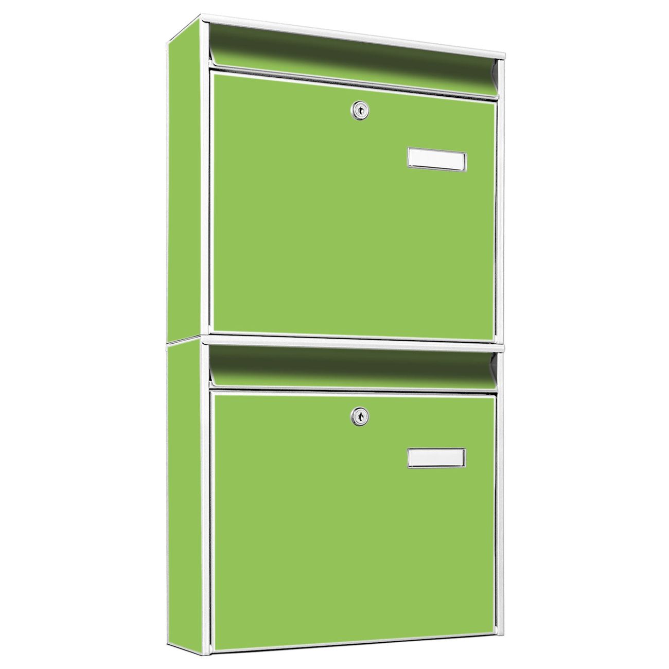 FUNKTION: Die Burg-Wächter Briefkastenanlage mit Farbe Limettengrün bietet Ihnen ausreichend Fassungsvermögen um auch A4 und C4 Sendungen zu empfangen. Das integrierte Namensschild lässt sich individuell beschriften. Wählen Sie aus den Grundfarben weiß, silber und schwarz. DESIGN: Die 2 Briefkästen haben ein ansprechendes und zeitloses Design, ohne dabei auf Funktionalität zu verzichten. Das Material ist sehr stabil, wetterfest und rostfrei. Durch das Farbe Limettengrün werden die Postkästen zu einem Blickfang. DETAILS: Die Postkästen bestehen aus verzinktem Stahl der zusätzlich mit Klarlack versiegelt wurde. Die Kästen sind gesamt 64,5cm hoch, 36,2cm breit und 10cm tief. Das Farbe besteht aus einer wetter- und UV-festen Folie, die Ihren Briefkasten zusätzlich vor Kratzern schützt. Die Postkästen werden mit Montagematerial, je einem Namensschild und je zwei Schlüsseln geliefert. NUTZEN: Das Briefkastenset eignet sich für die Wandmontage, die Größe bietet genügend Platz für Sendungen aller Art. Das zeitlose Design sowie die stabile Bauart bieten Ihnen einen treuen Begleiter für Ihre Post. BANJADO: