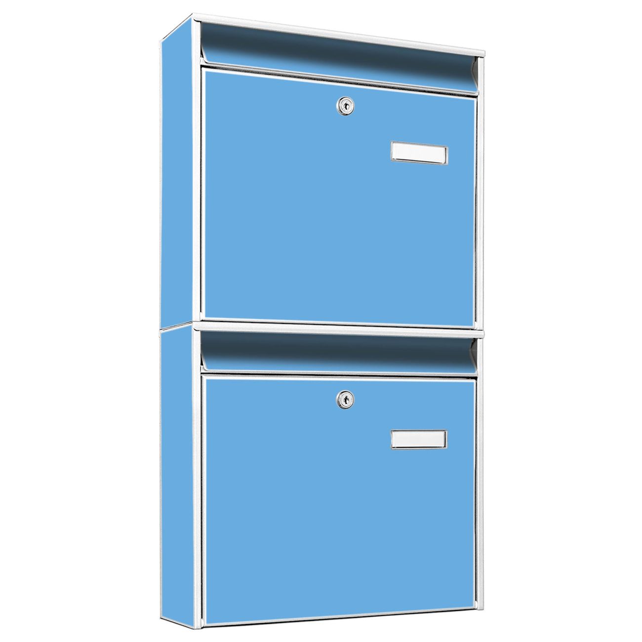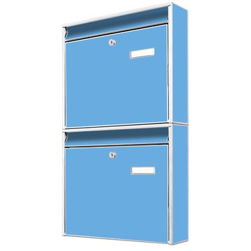 FUNKTION: Die Burg-Wächter Briefkastenanlage mit Farbe Pastellblau bietet Ihnen ausreichend Fassungsvermögen um auch A4 und C4 Sendungen zu empfangen. Das integrierte Namensschild lässt sich individuell beschriften. Wählen Sie aus den Grundfarben weiß, silber und schwarz. DESIGN: Die 2 Briefkästen haben ein ansprechendes und zeitloses Design, ohne dabei auf Funktionalität zu verzichten. Das Material ist sehr stabil, wetterfest und rostfrei. Durch das Farbe Pastellblau werden die Postkästen zu einem Blickfang. DETAILS: Die Postkästen bestehen aus verzinktem Stahl der zusätzlich mit Klarlack versiegelt wurde. Die Kästen sind gesamt 64,5cm hoch, 36,2cm breit und 10cm tief. Das Farbe besteht aus einer wetter- und UV-festen Folie, die Ihren Briefkasten zusätzlich vor Kratzern schützt. Die Postkästen werden mit Montagematerial, je einem Namensschild und je zwei Schlüsseln geliefert. NUTZEN: Das Briefkastenset eignet sich für die Wandmontage, die Größe bietet genügend Platz für Sendungen aller Art. Das zeitlose Design sowie die stabile Bauart bieten Ihnen einen treuen Begleiter für Ihre Post. BANJADO: