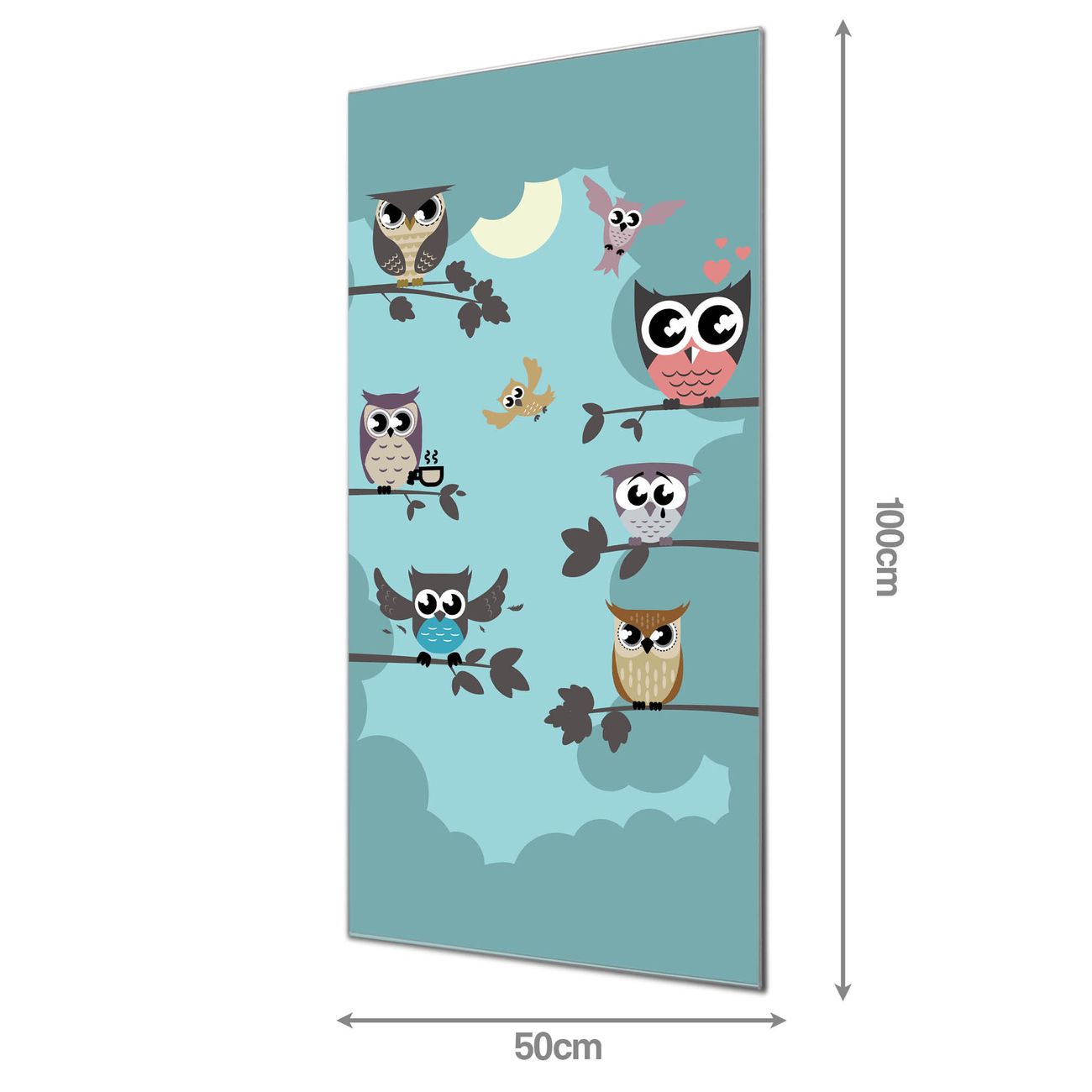 Material  4mm Sicherheitsglas mit Metallrückwand Eigenschaften  farbbrillant, kratzfest, rahmenlos Maße  50x100x0,6cm, 7,50 kg schwer Motiv  Nummer 11562 Acht Eulen
