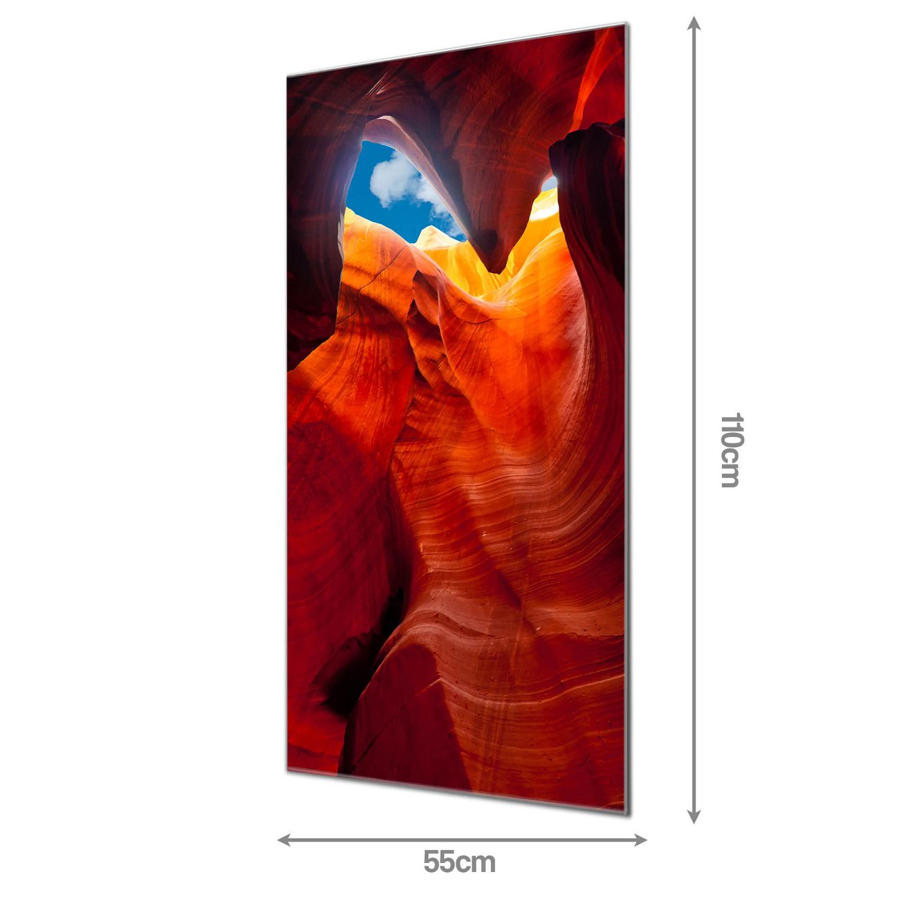 Material  4mm Sicherheitsglas mit Metallrückwand Eigenschaften  farbbrillant, kratzfest, rahmenlos Maße  55x110x0,6cm, 9,08 kg schwer Motiv  Nummer 12033 Antelope Canyon 2