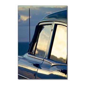 Brillantes Glasbild im Hochformat Auto am Strand