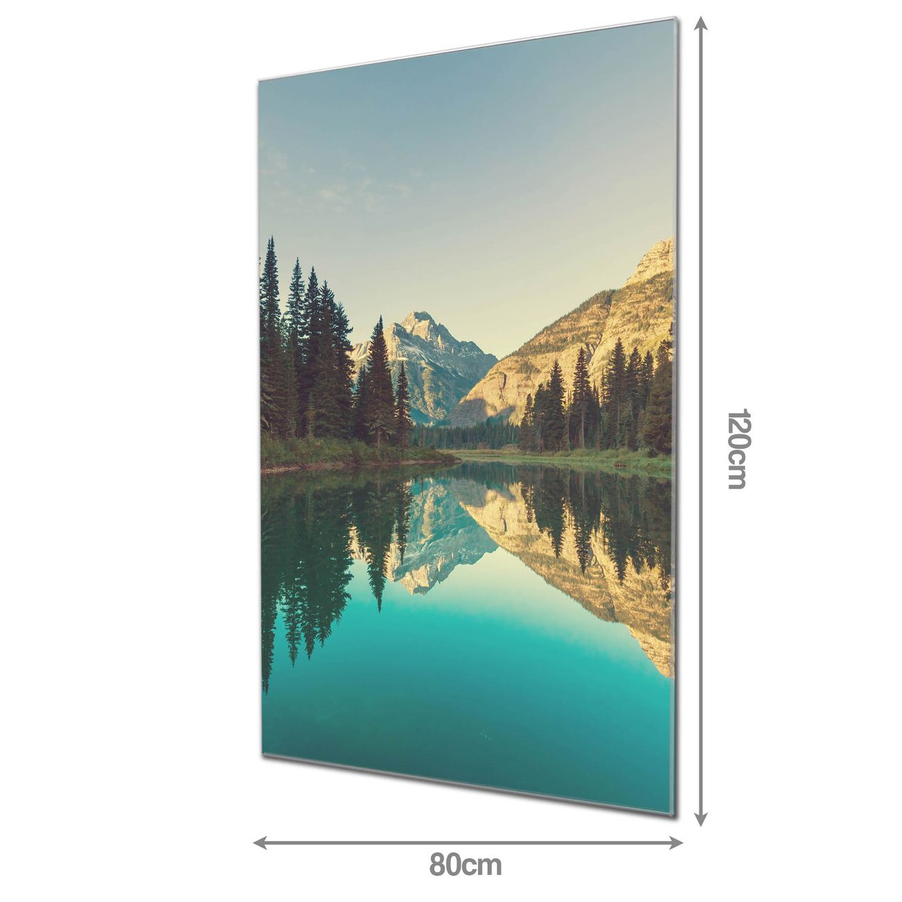 Material  4mm Sicherheitsglas mit Metallrückwand Eigenschaften  farbbrillant, kratzfest, rahmenlos Maße  80x120x0,6cm, 14,40 kg schwer Motiv  Nummer 12042 Bergsee