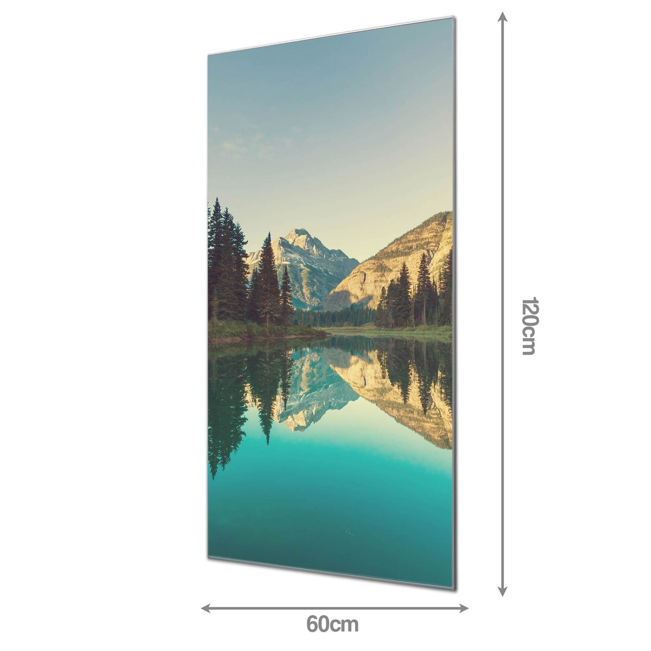 Material  4mm Sicherheitsglas mit Metallrückwand Eigenschaften  farbbrillant, kratzfest, rahmenlos Maße  60x120x0,6cm, 10,80 kg schwer Motiv  Nummer 12042 Bergsee