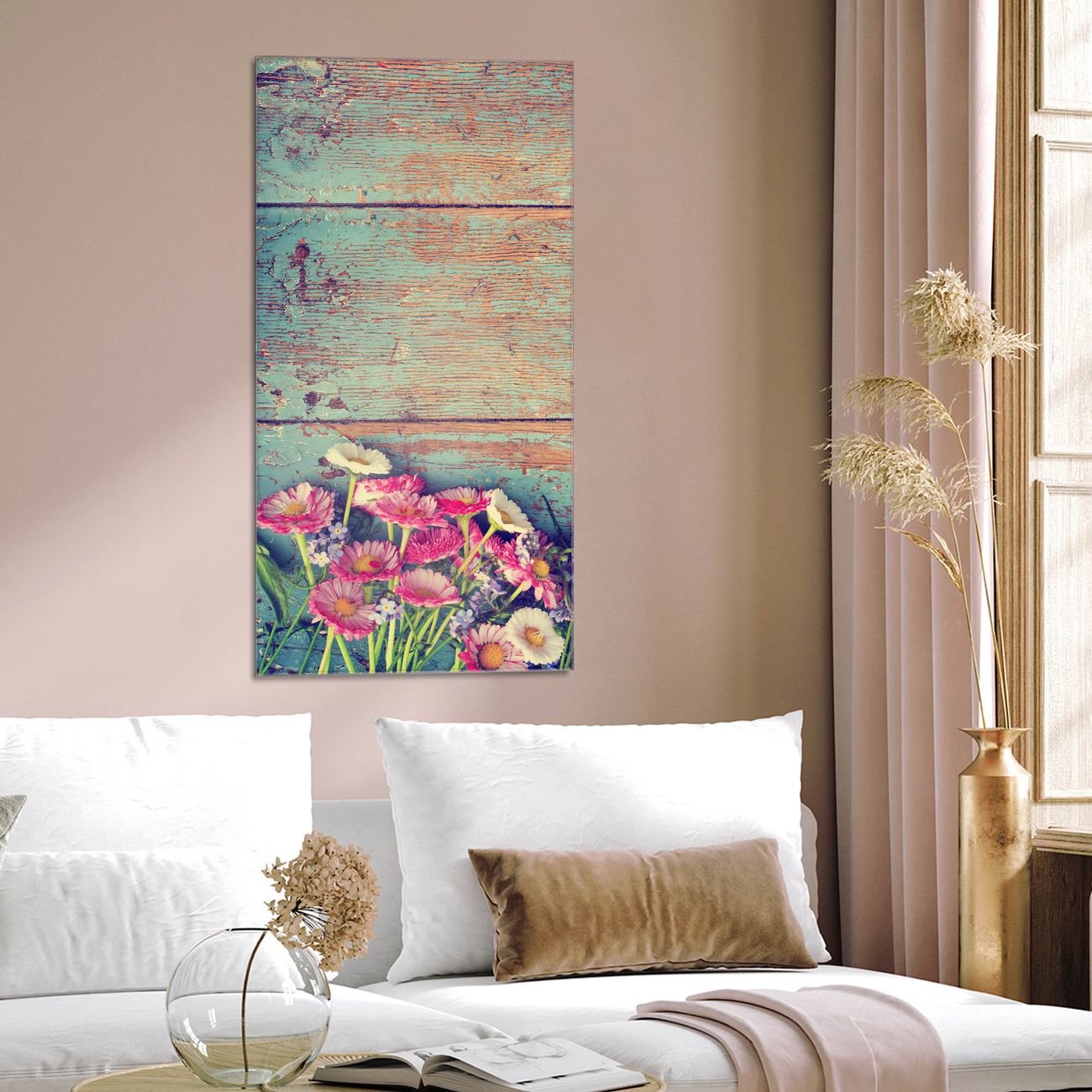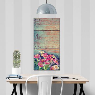 Brillantes Glasbild im Hochformat Blumenpfücken