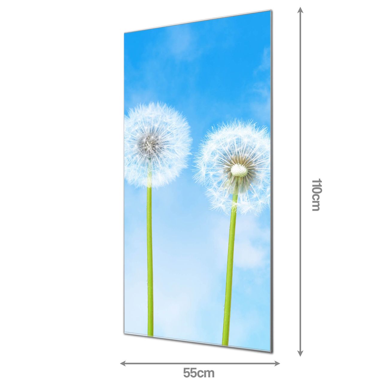 Material  4mm Sicherheitsglas mit Metallrückwand Eigenschaften  farbbrillant, kratzfest, rahmenlos Maße  55x110x0,6cm, 9,08 kg schwer Motiv  Nummer 10174 Dandelion