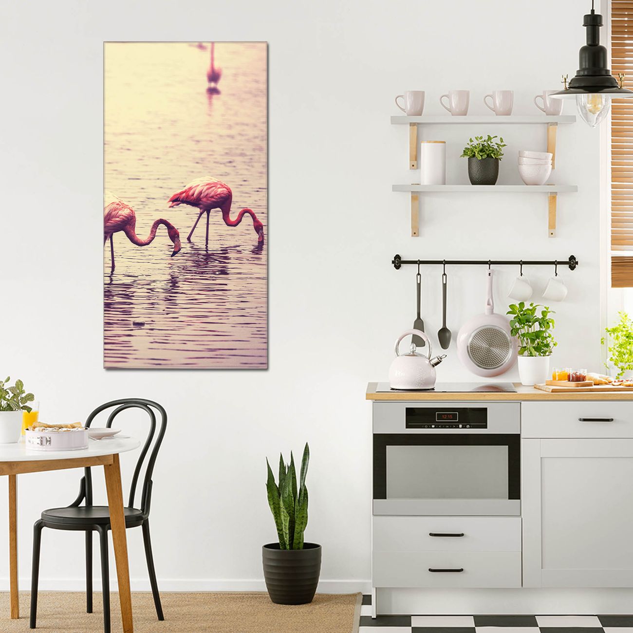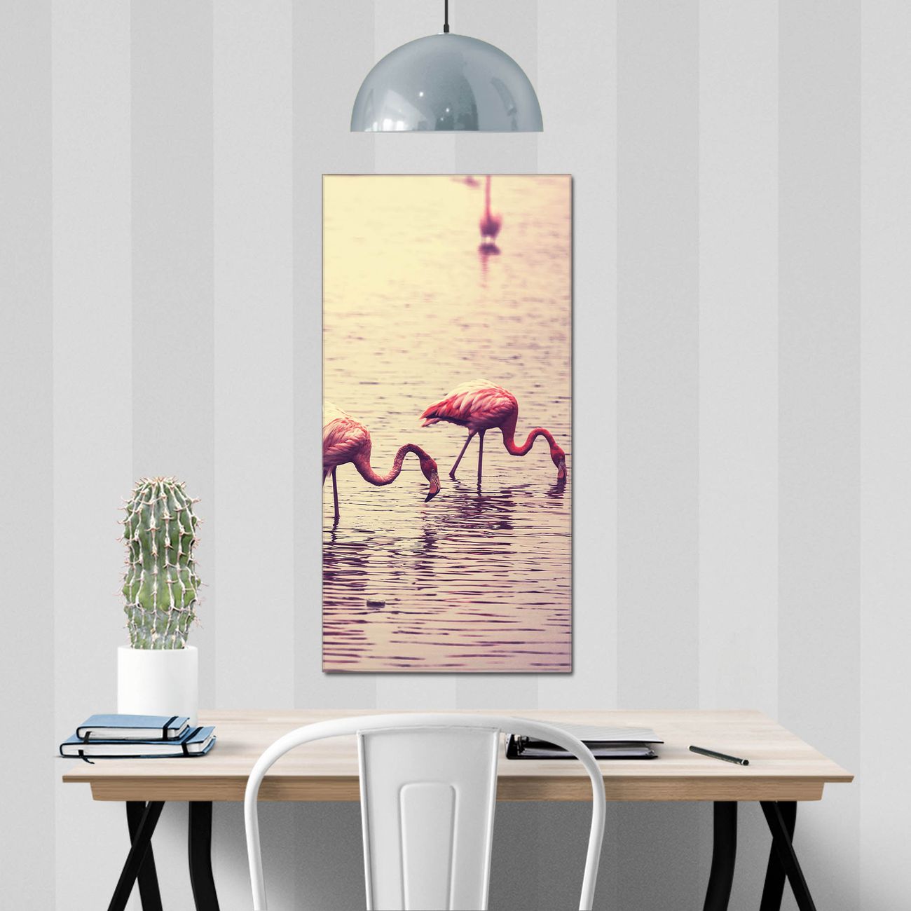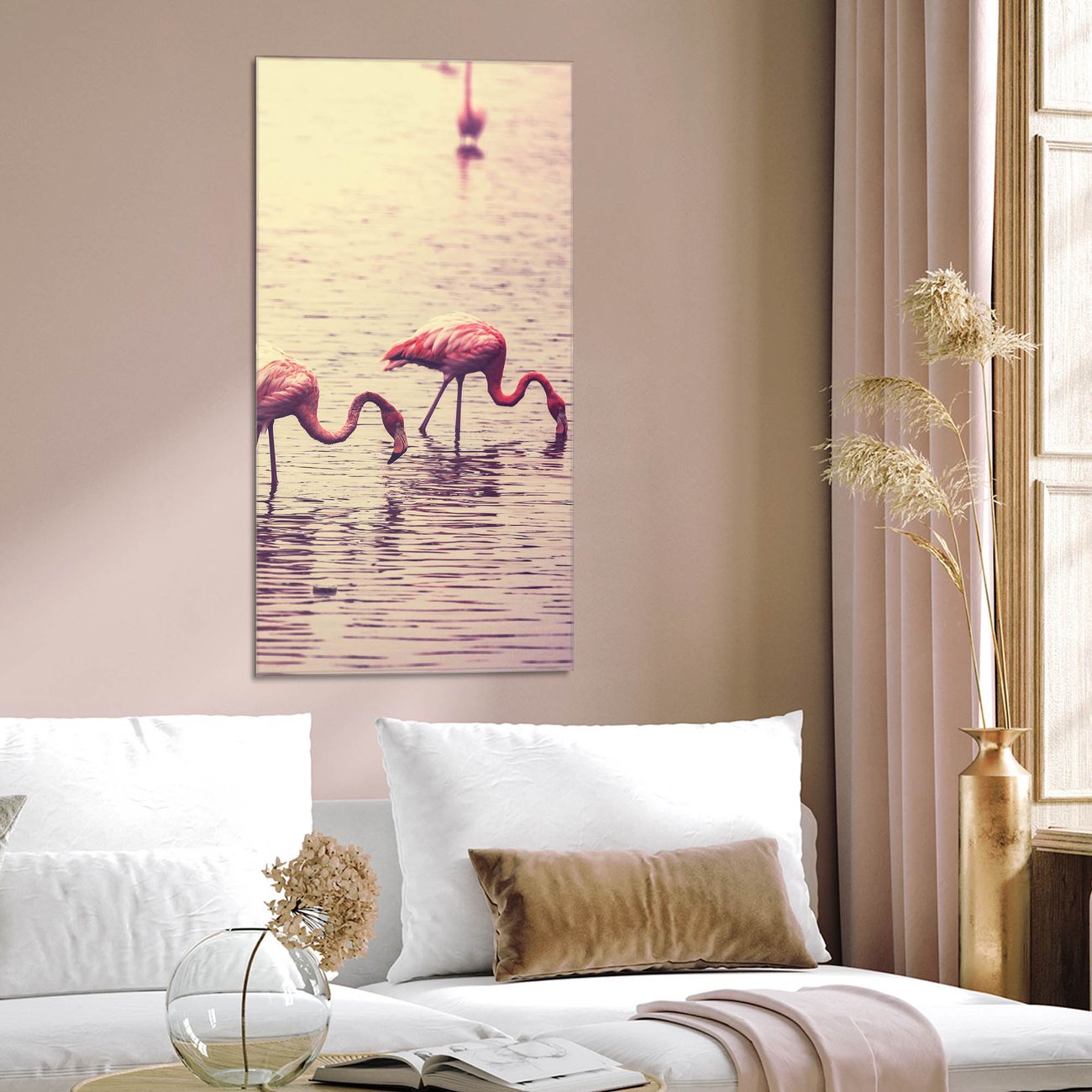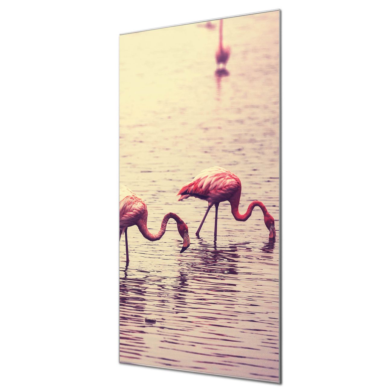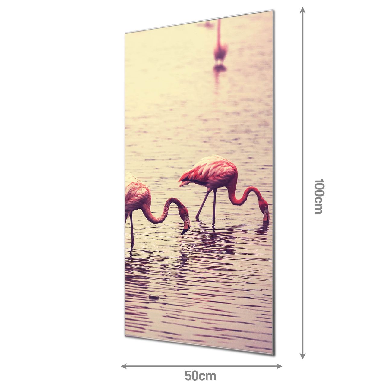Material  4mm Sicherheitsglas mit Metallrückwand Eigenschaften  farbbrillant, kratzfest, rahmenlos Maße  50x100x0,6cm, 7,50 kg schwer Motiv  Nummer 11734 Drei Flamnigos