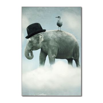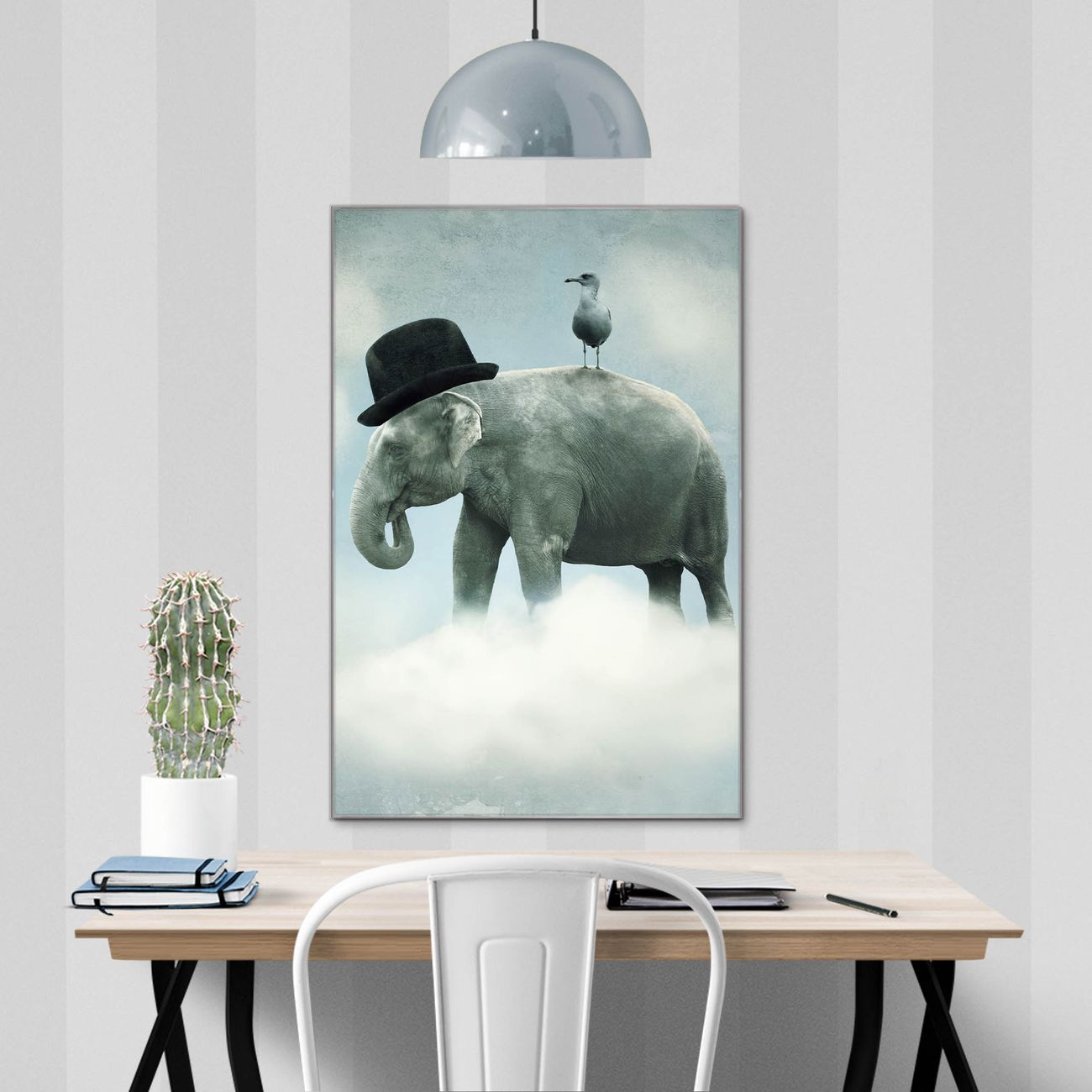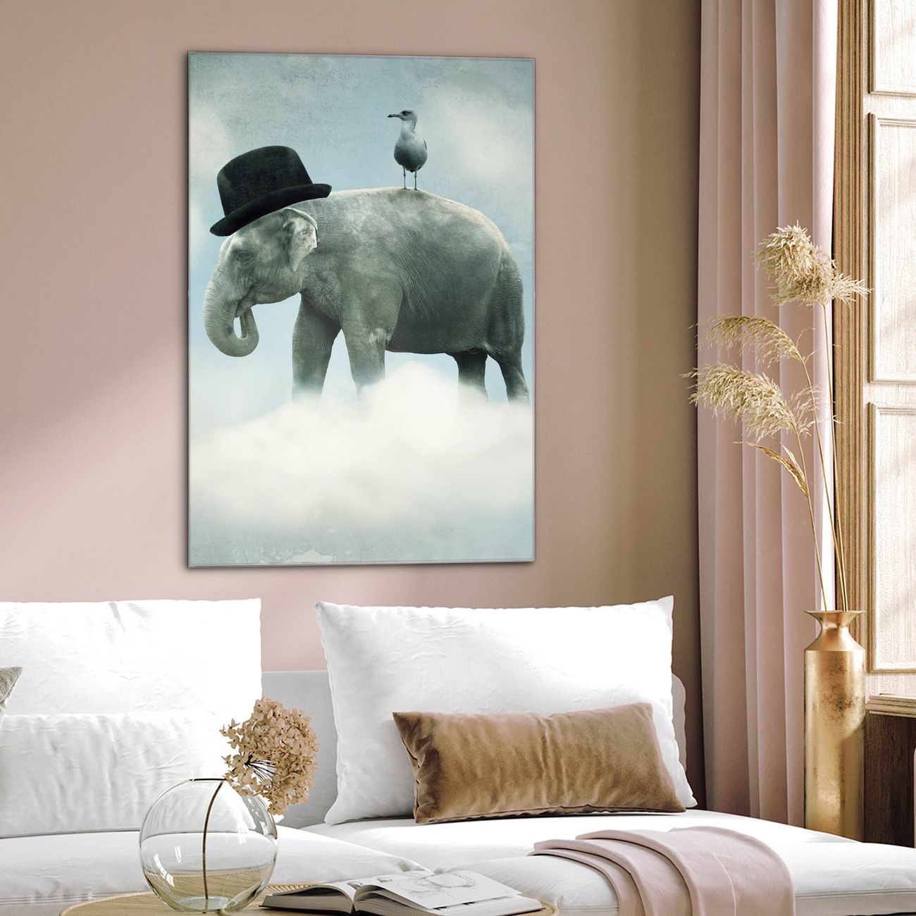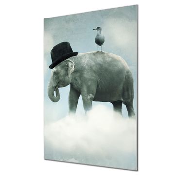 Brillantes Glasbild im Hochformat Elefant und Möwe