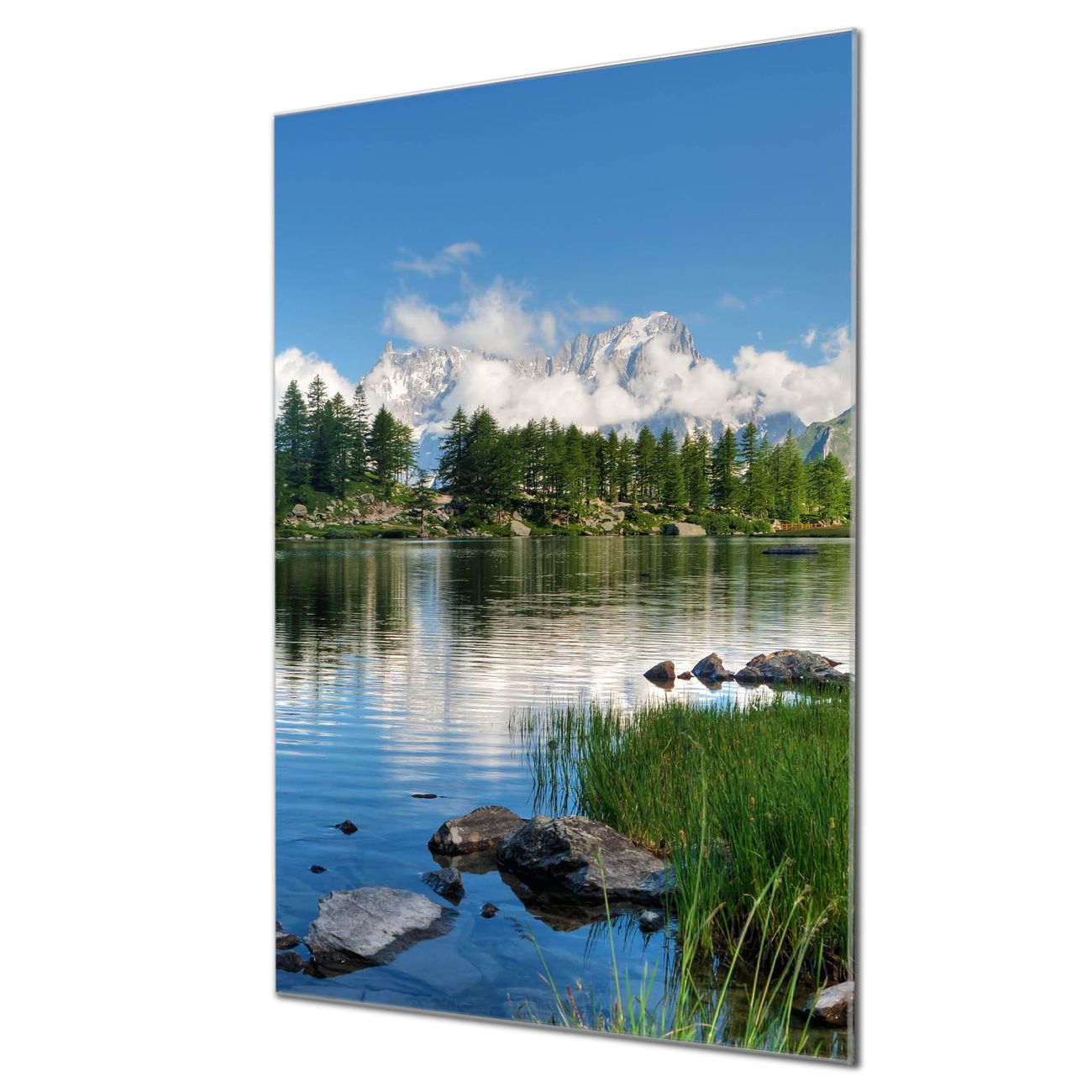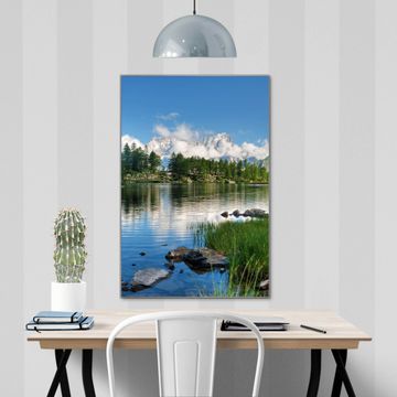 Brillantes Glasbild im Hochformat Gebirgssee