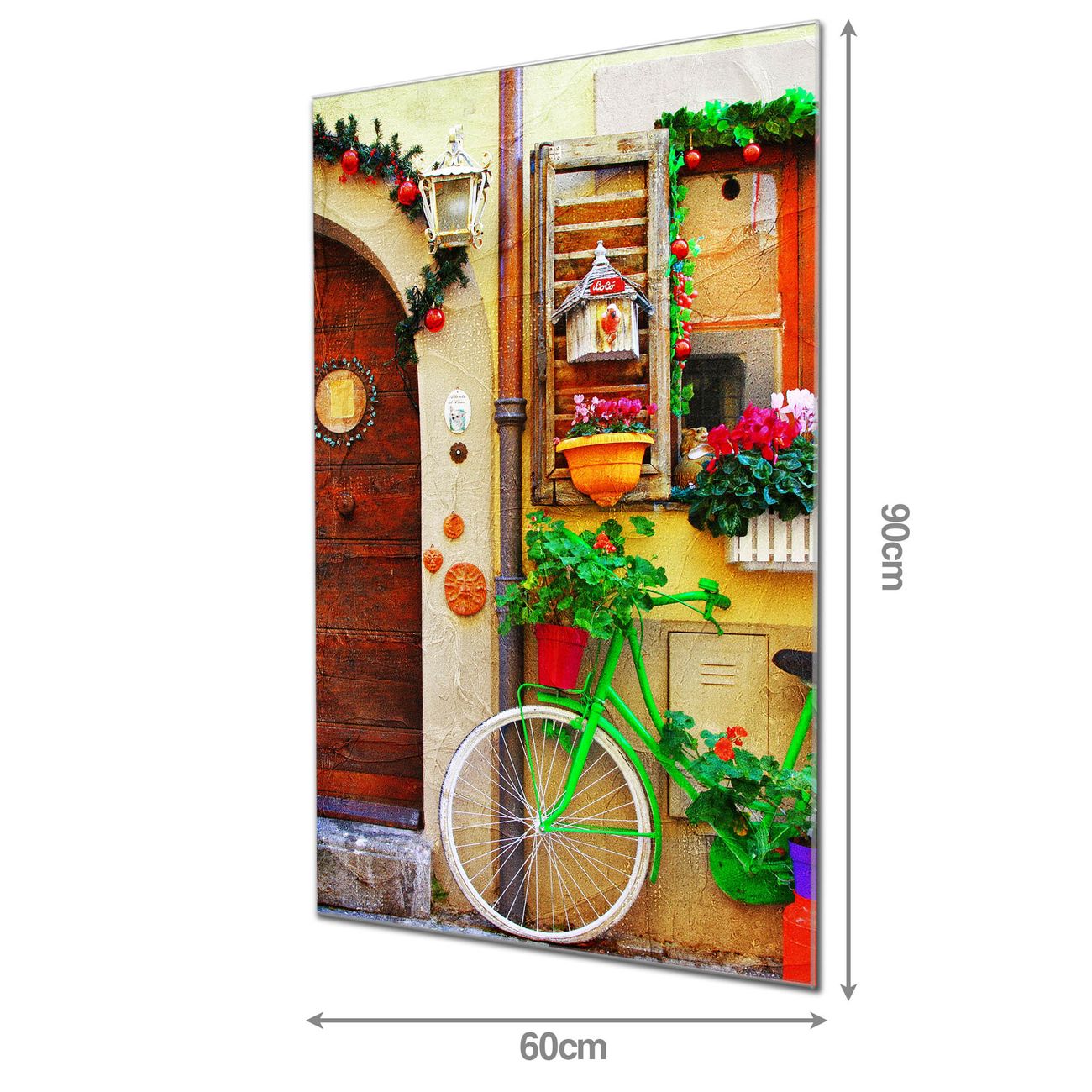 Material  4mm Sicherheitsglas mit Metallrückwand Eigenschaften  farbbrillant, kratzfest, rahmenlos Maße  60x90x0,6cm, 8,10 kg schwer Motiv  Nummer 11107 Grünes Fahrrad