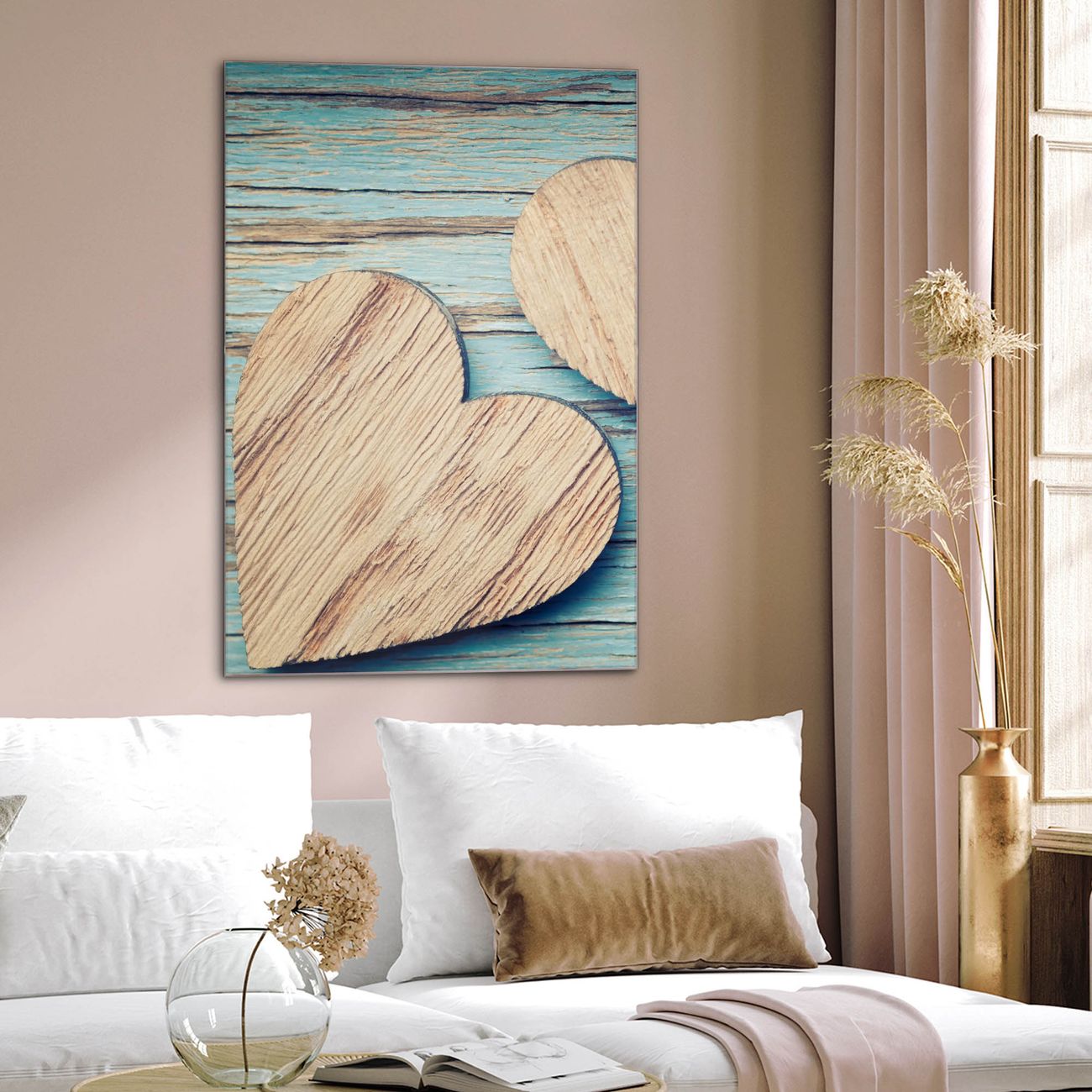 Brillantes Glasbild im Hochformat Holz Herzen