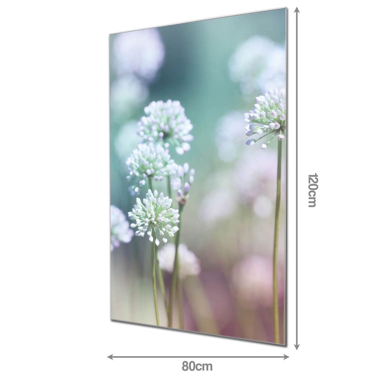 Material  4mm Sicherheitsglas mit Metallrückwand Eigenschaften  farbbrillant, kratzfest, rahmenlos Maße  80x120x0,6cm, 14,40 kg schwer Motiv  Nummer 11577 Lauchblüte