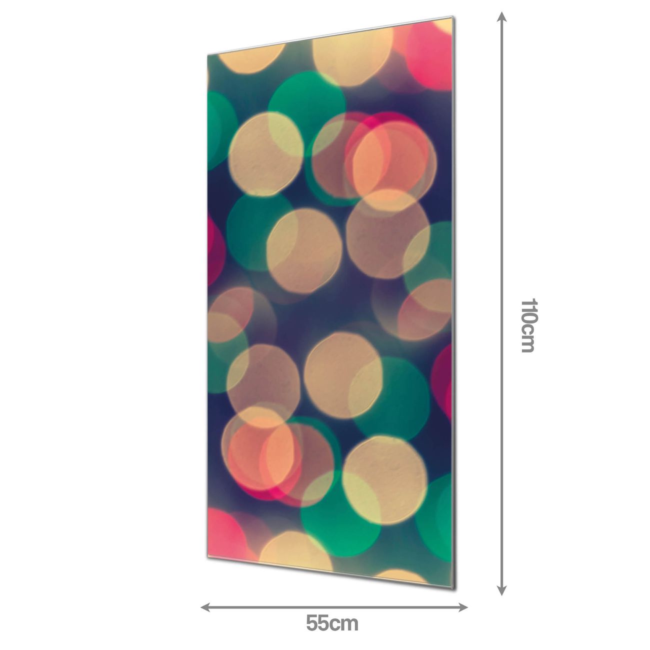 Material  4mm Sicherheitsglas mit Metallrückwand Eigenschaften  farbbrillant, kratzfest, rahmenlos Maße  55x110x0,6cm, 9,08 kg schwer Motiv  Nummer 11676 Lichtpunkte Weiß Grün Rot