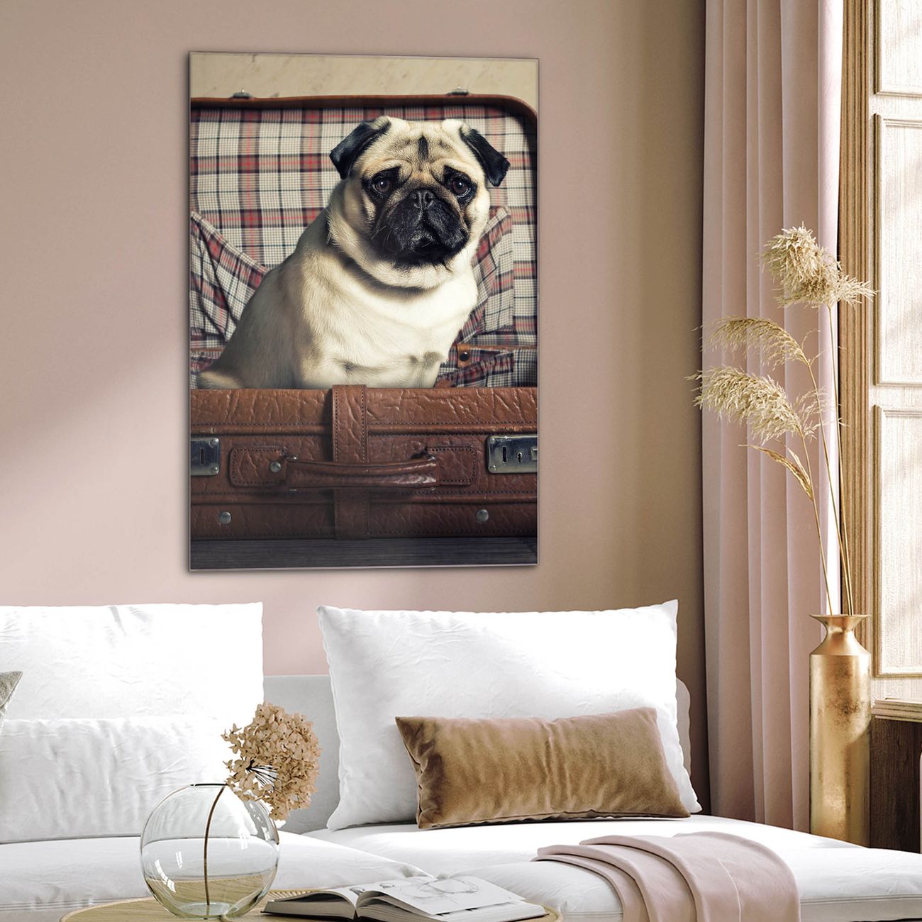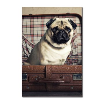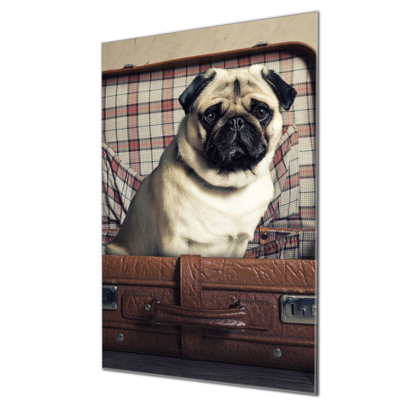 Brillantes Glasbild im Hochformat Mops im Koffer
