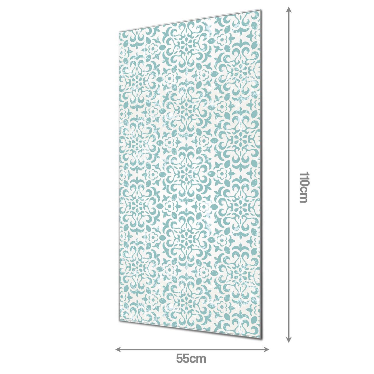 Material  4mm Sicherheitsglas mit Metallrückwand Eigenschaften  farbbrillant, kratzfest, rahmenlos Maße  55x110x0,6cm, 9,08 kg schwer Motiv  Nummer 10947 Muster Getupft Blau