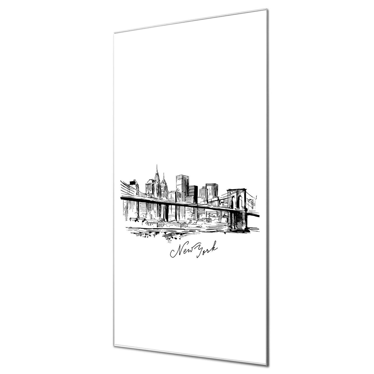 Material  4mm Sicherheitsglas mit Metallrückwand Eigenschaften  farbbrillant, kratzfest, rahmenlos Maße  50x100x0,6cm, 7,50 kg schwer Motiv  Nummer 11722 New York Skizze