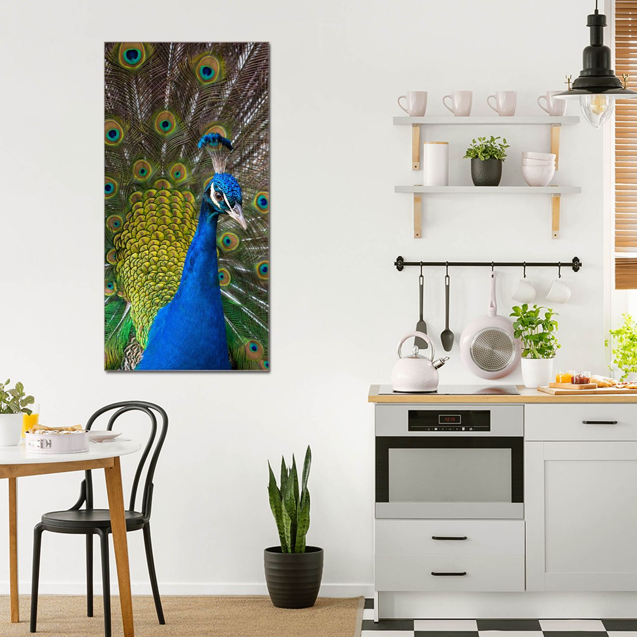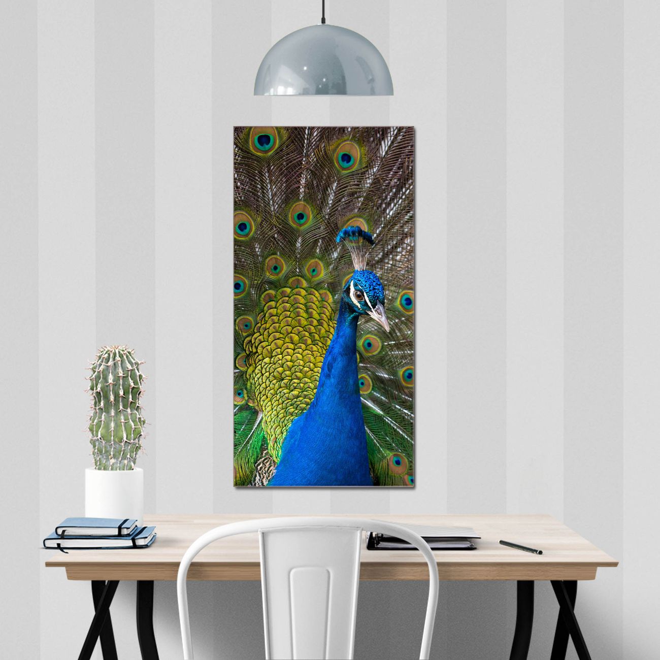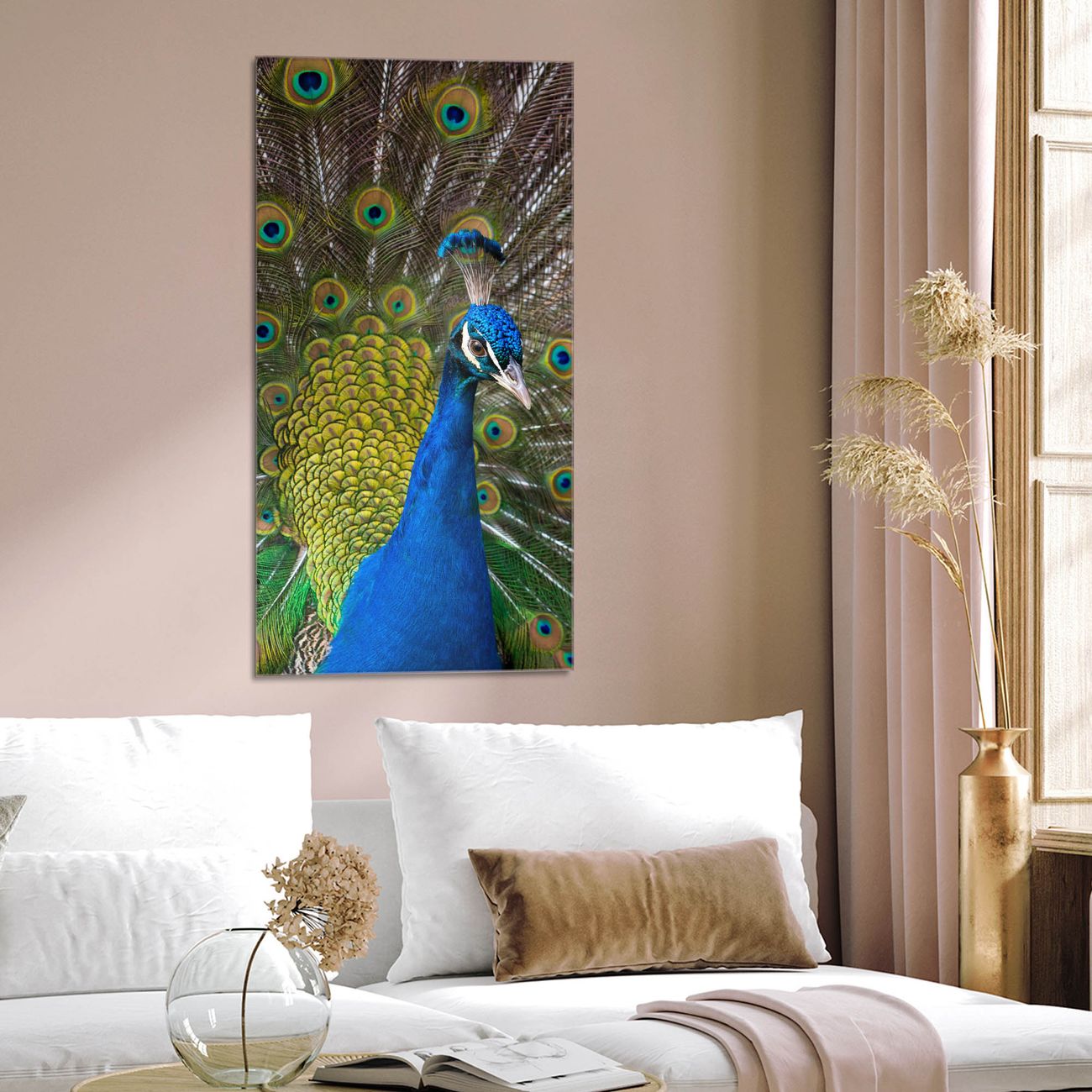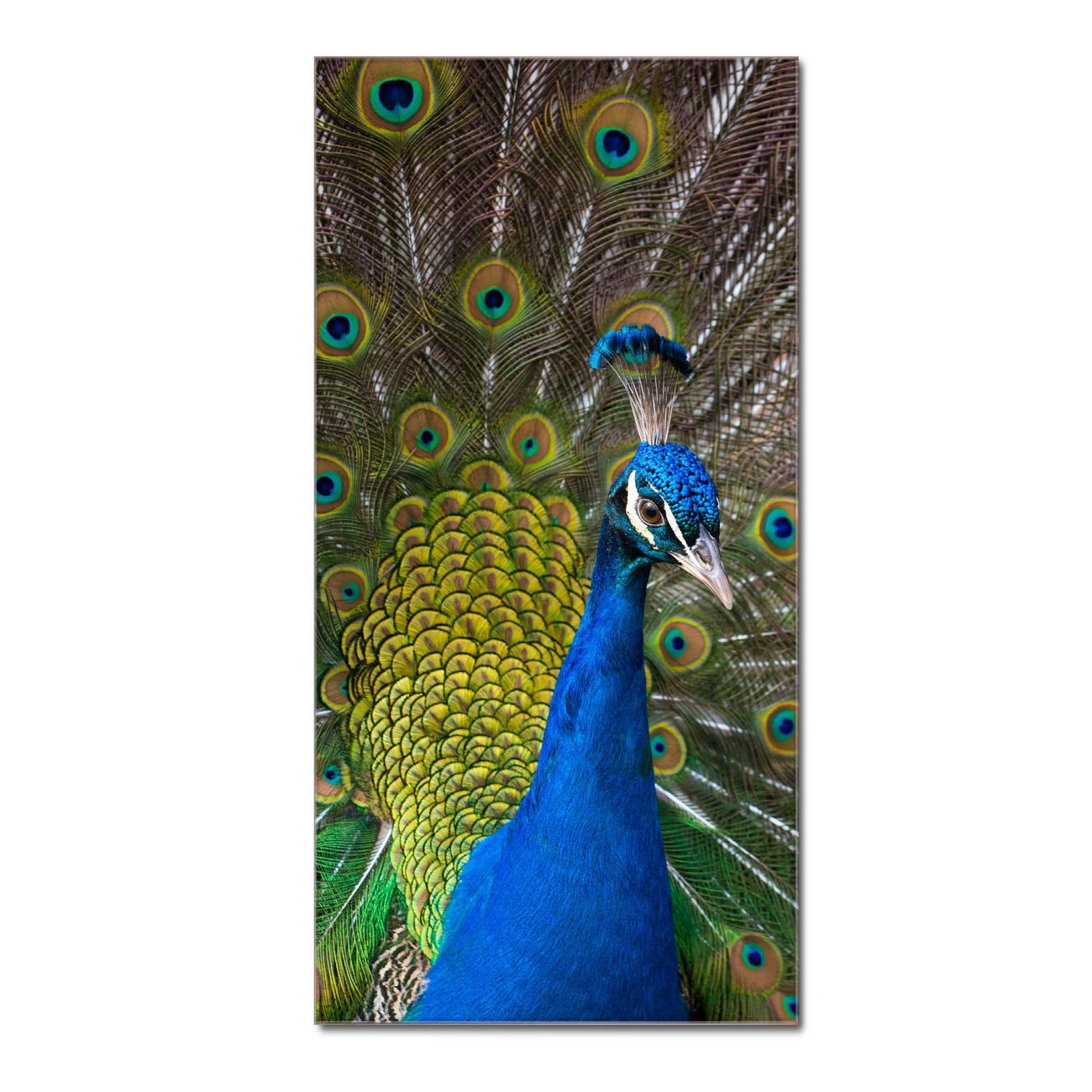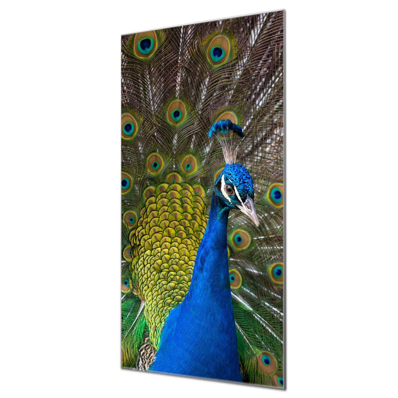 Brillantes Glasbild im Hochformat Pfau
