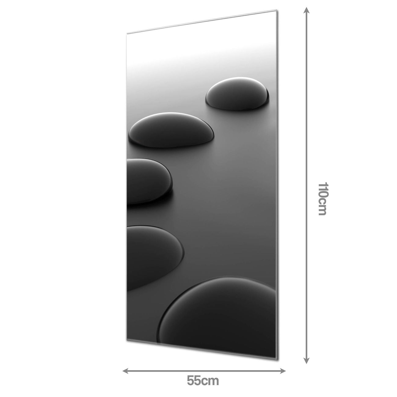 Material  4mm Sicherheitsglas mit Metallrückwand Eigenschaften  farbbrillant, kratzfest, rahmenlos Maße  55x110x0,6cm, 9,08 kg schwer Motiv  Nummer 12061 Schwarze Steine