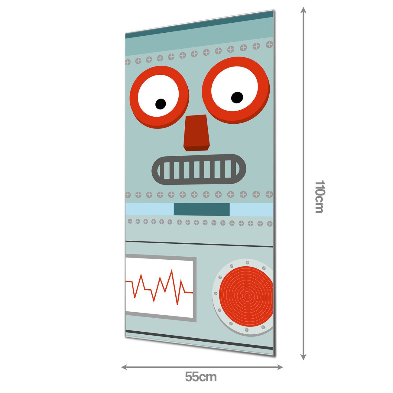 Material  4mm Sicherheitsglas mit Metallrückwand Eigenschaften  farbbrillant, kratzfest, rahmenlos Maße  55x110x0,6cm, 9,08 kg schwer Motiv  Nummer 11807 Shocked Robot