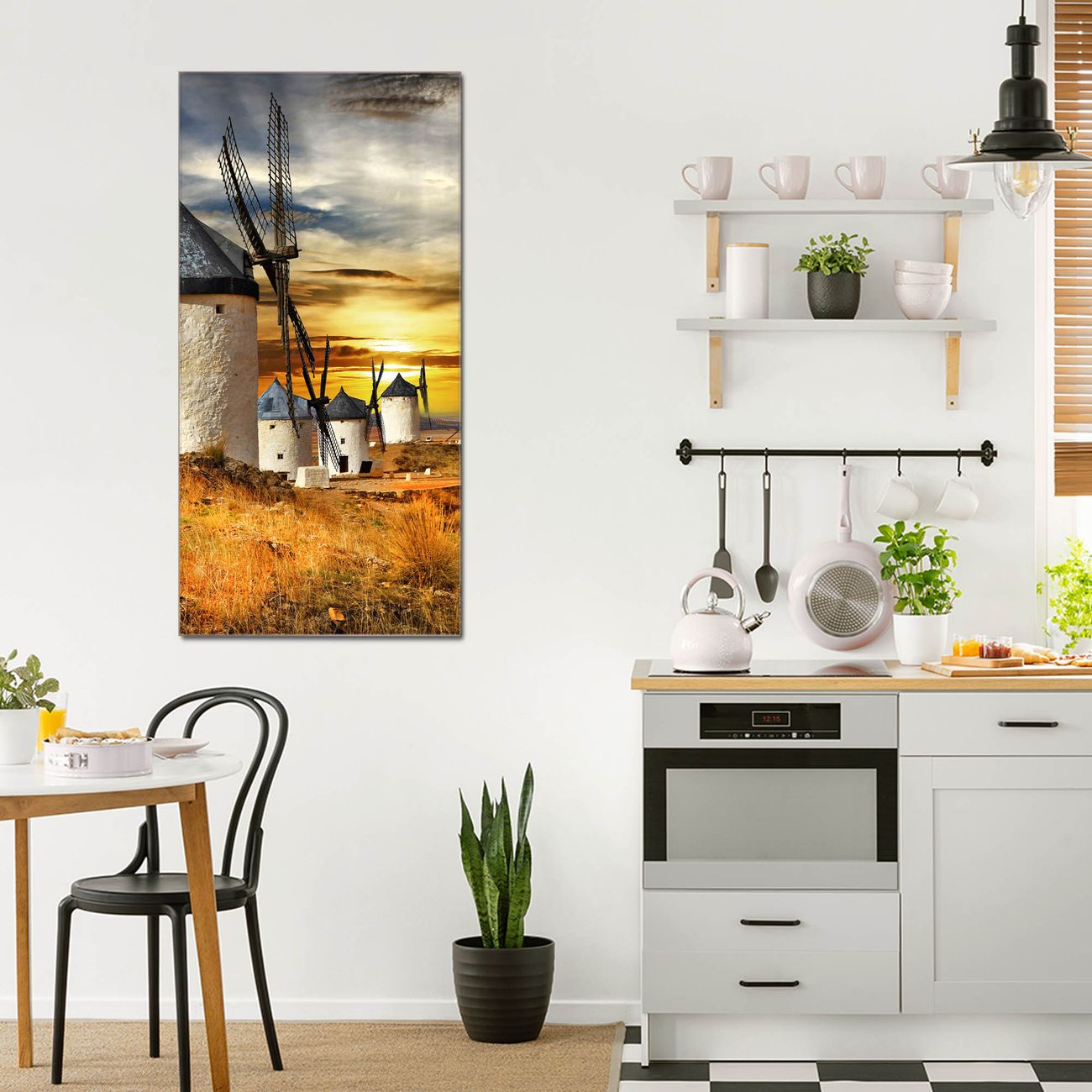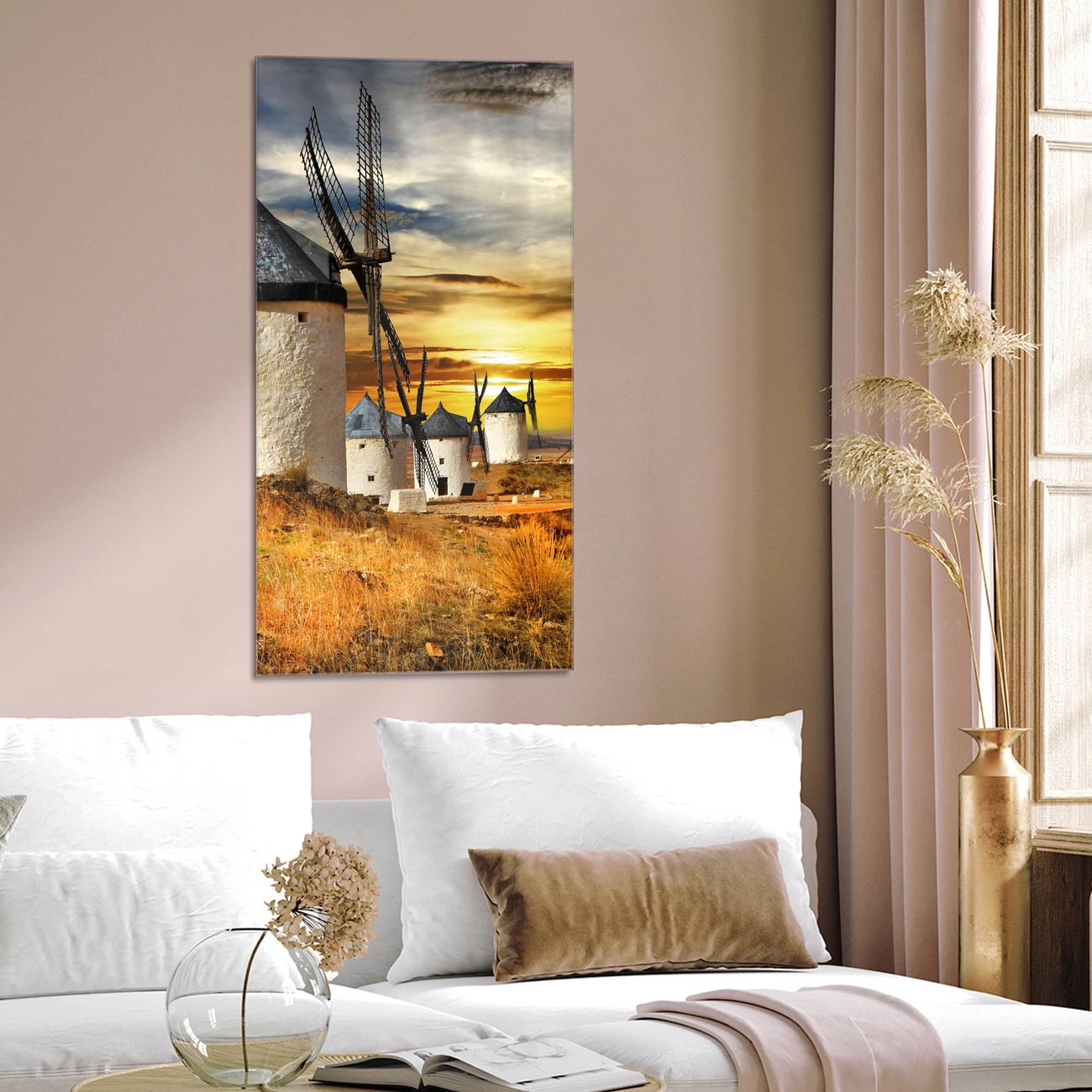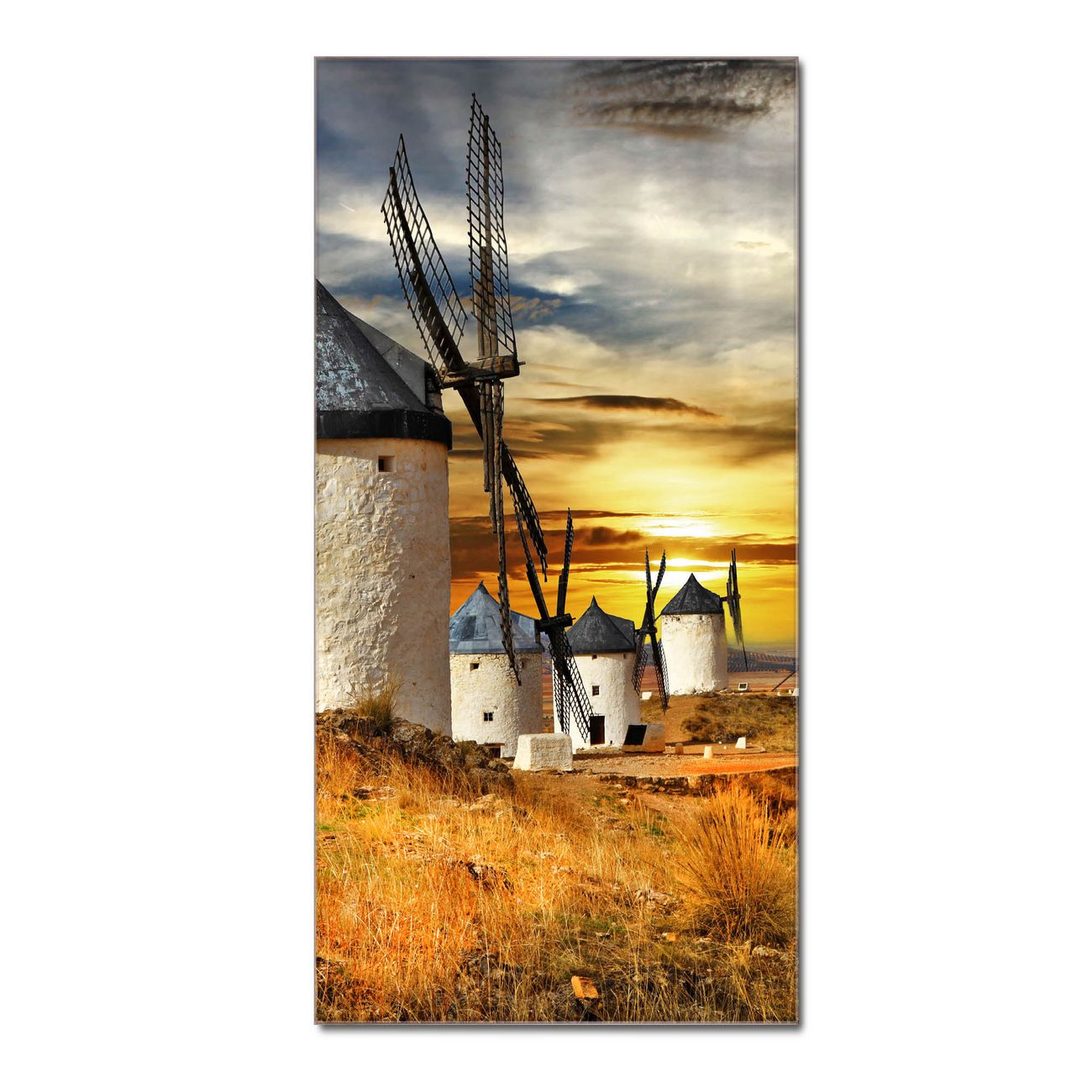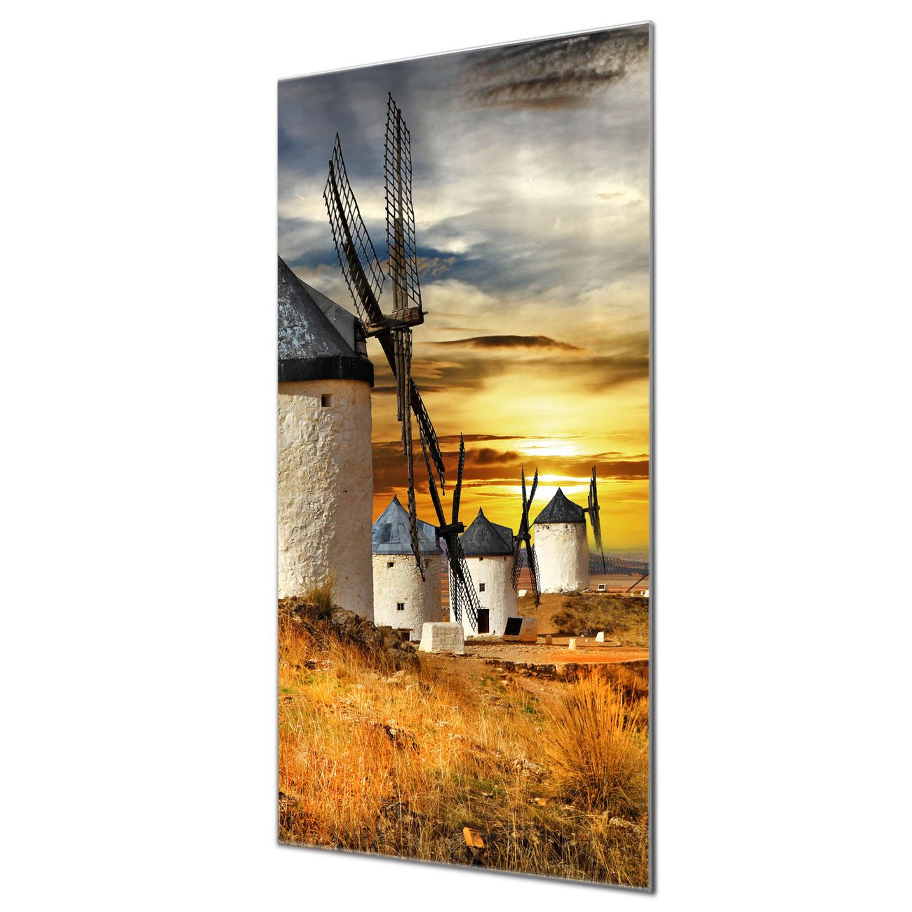 Brillantes Glasbild im Hochformat Spanische Windmühlen