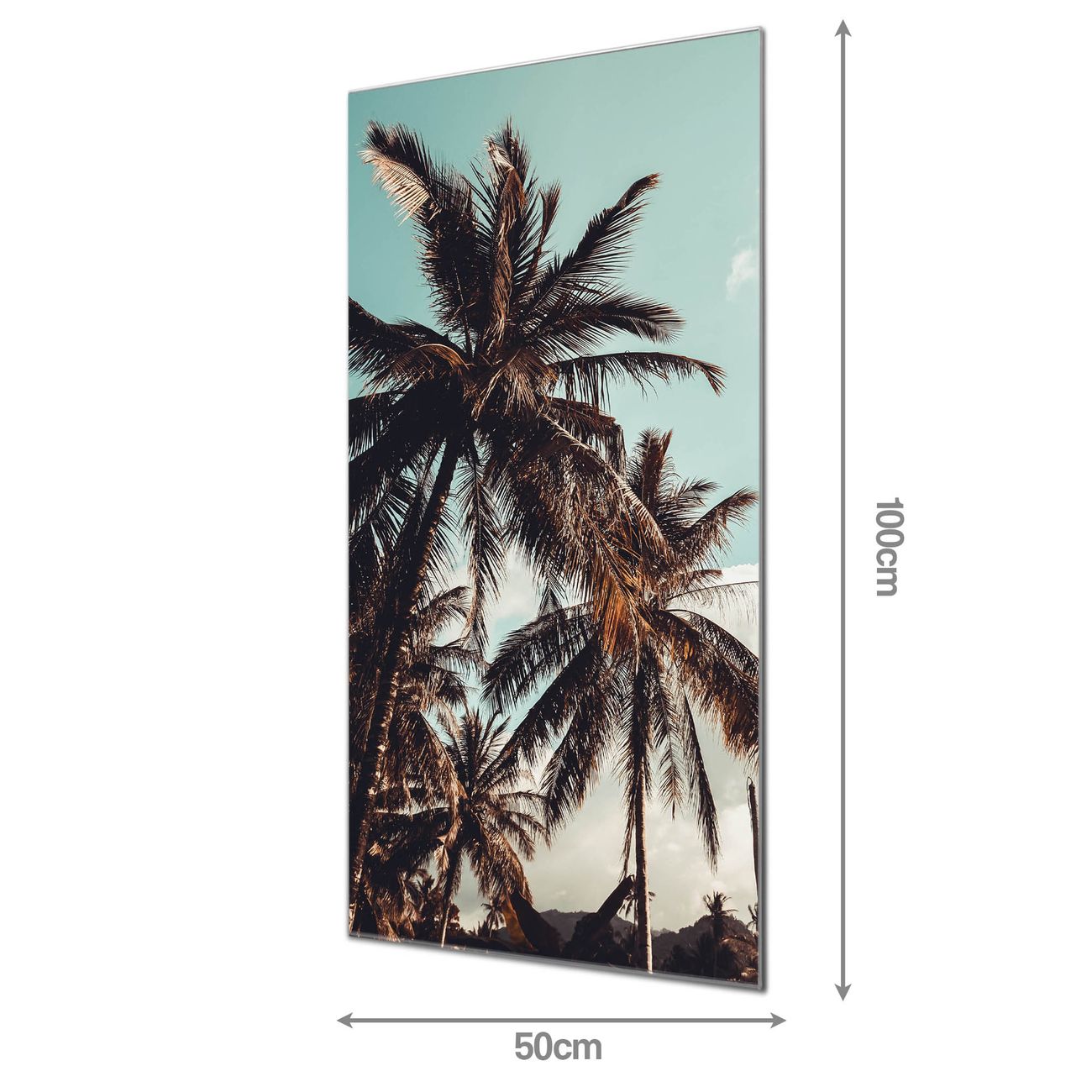 Material  4mm Sicherheitsglas mit Metallrückwand Eigenschaften  farbbrillant, kratzfest, rahmenlos Maße  50x100x0,6cm, 7,50 kg schwer Motiv  Nummer 11509 Unter Palmen
